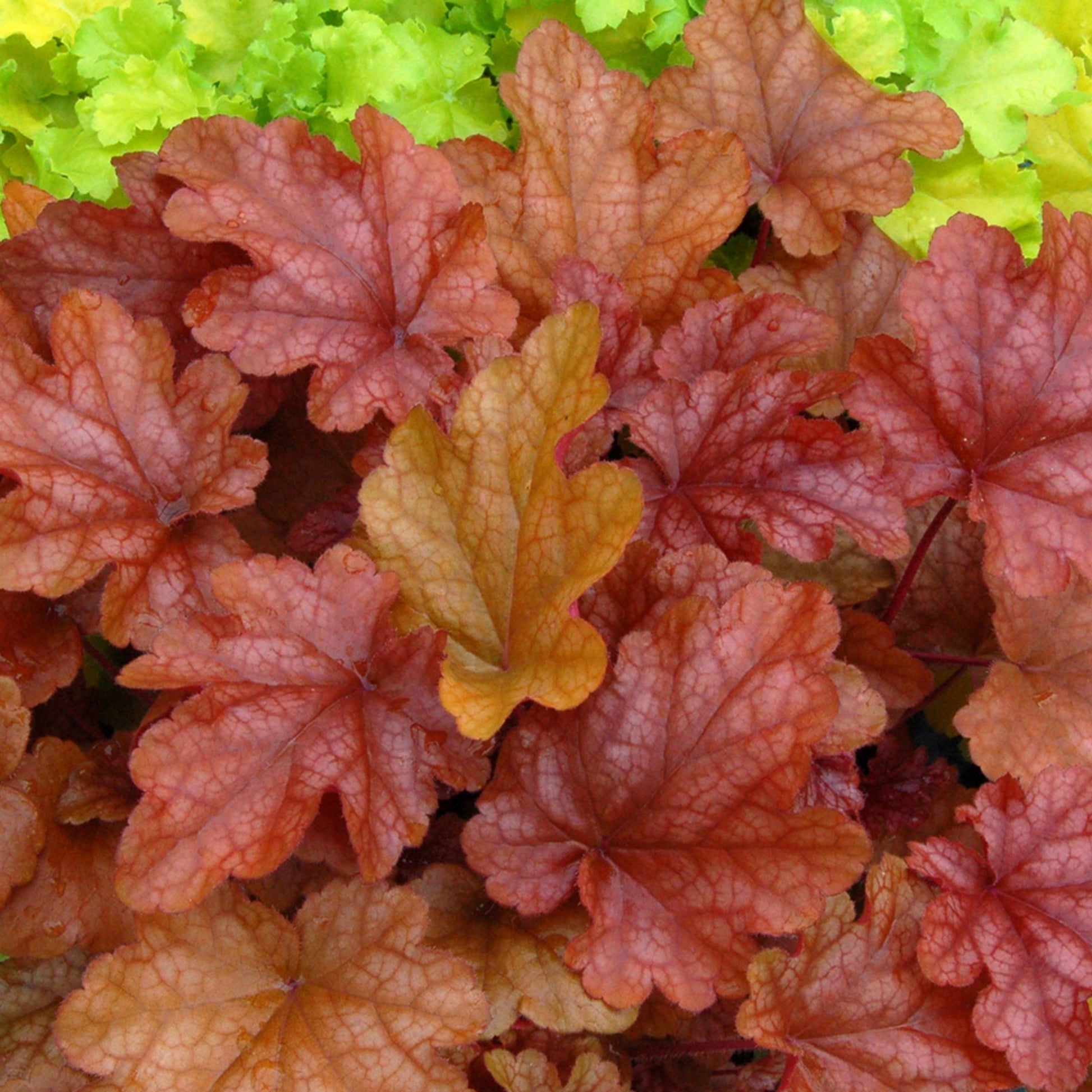 Heuchera Peach Flambe is a dense, clump forming, evergreen hardy perennial with attractive bright peach leaves which turn rich burgundy in autumn. They are topped by wiry stems bearing open panicles of pretty, creamy-white flowers which appear from Spring to Summer.