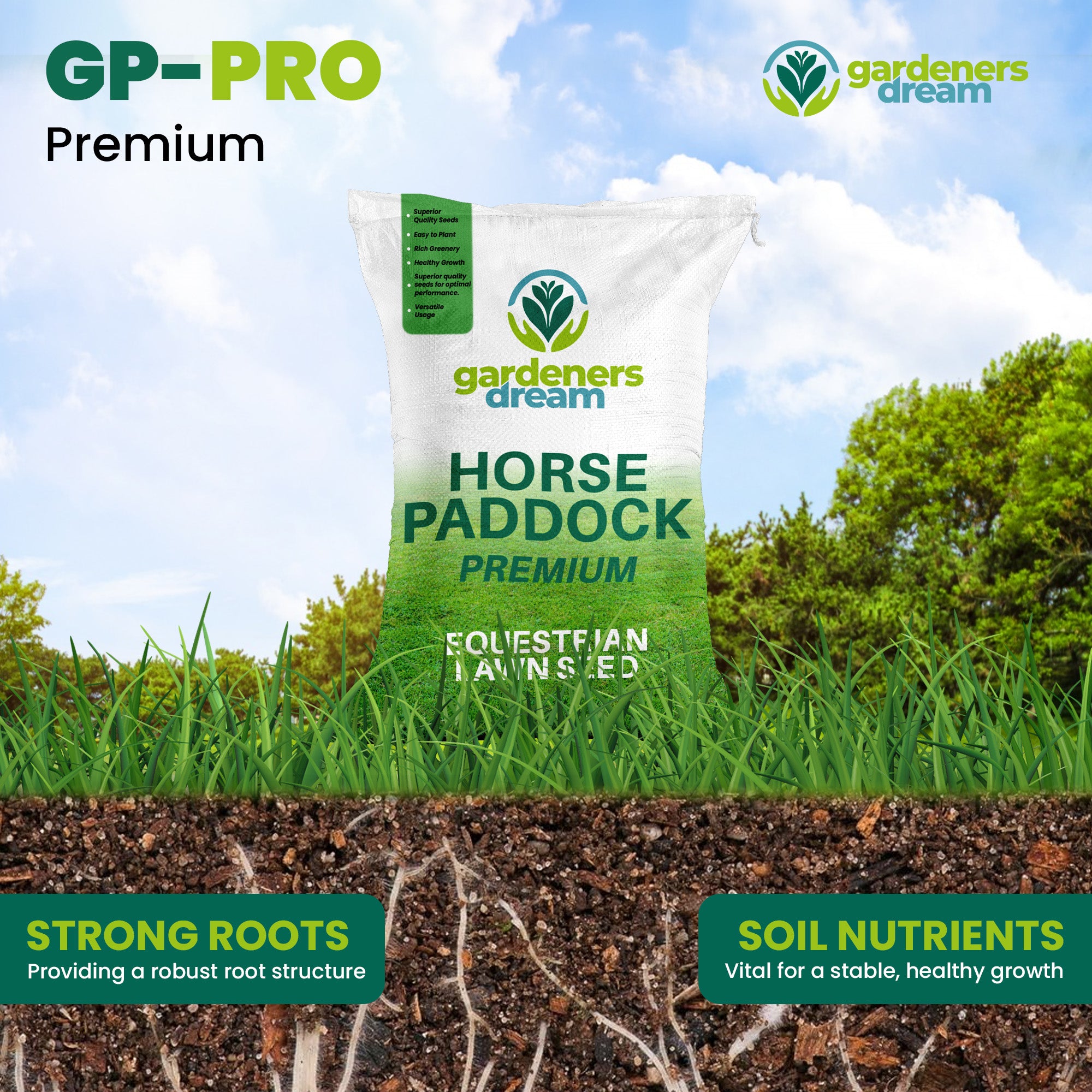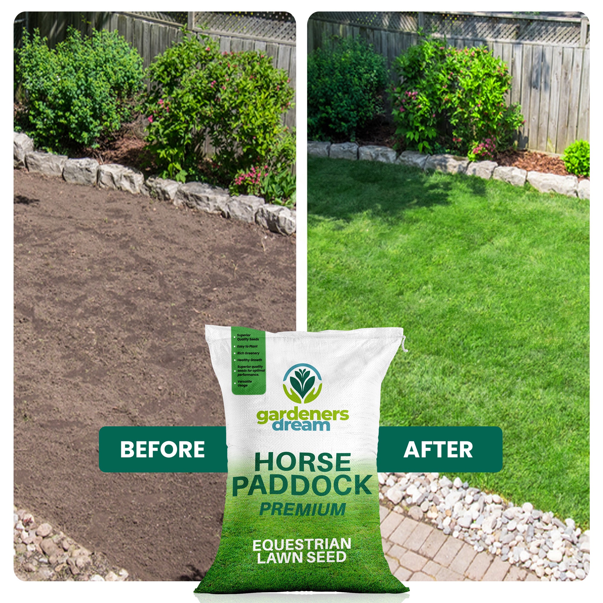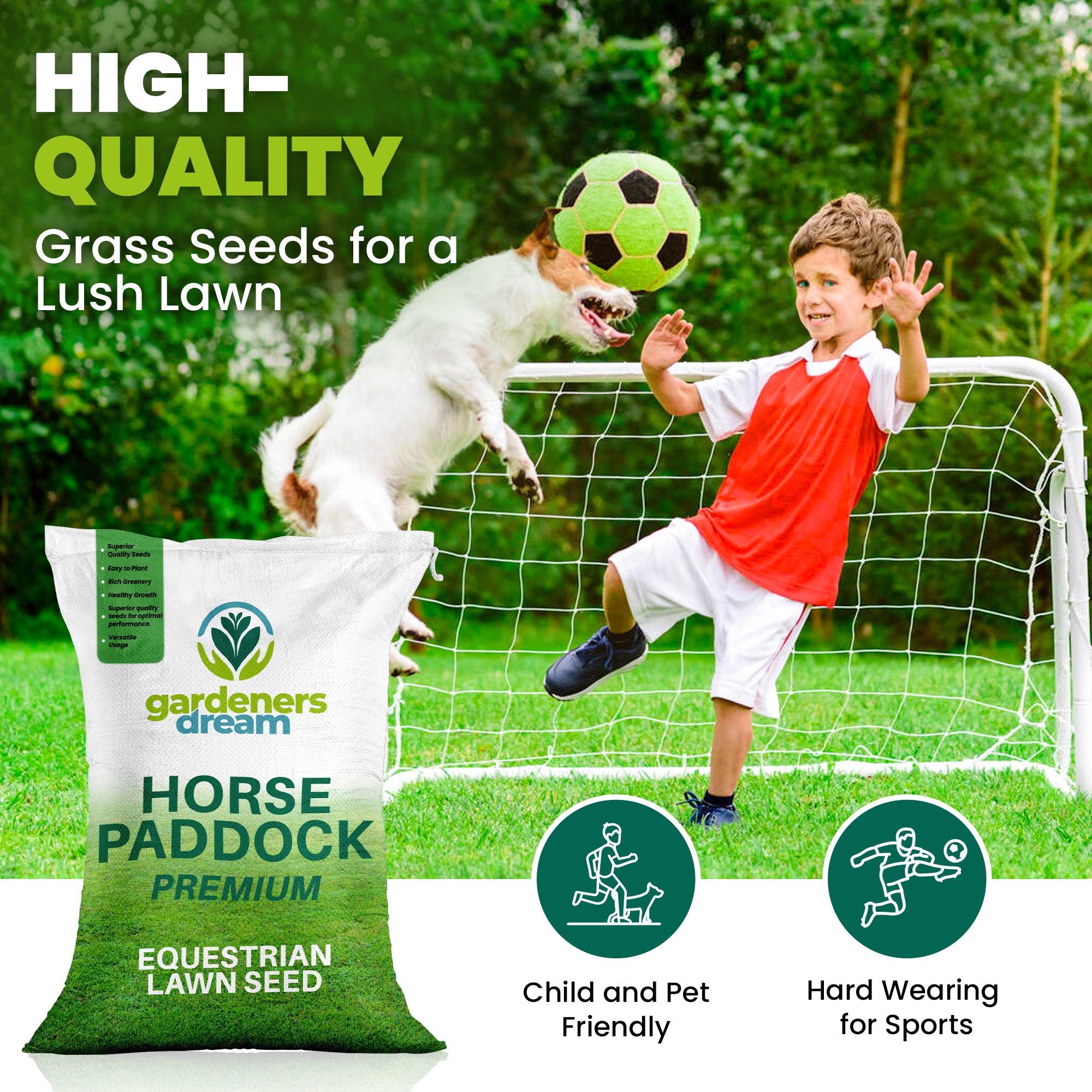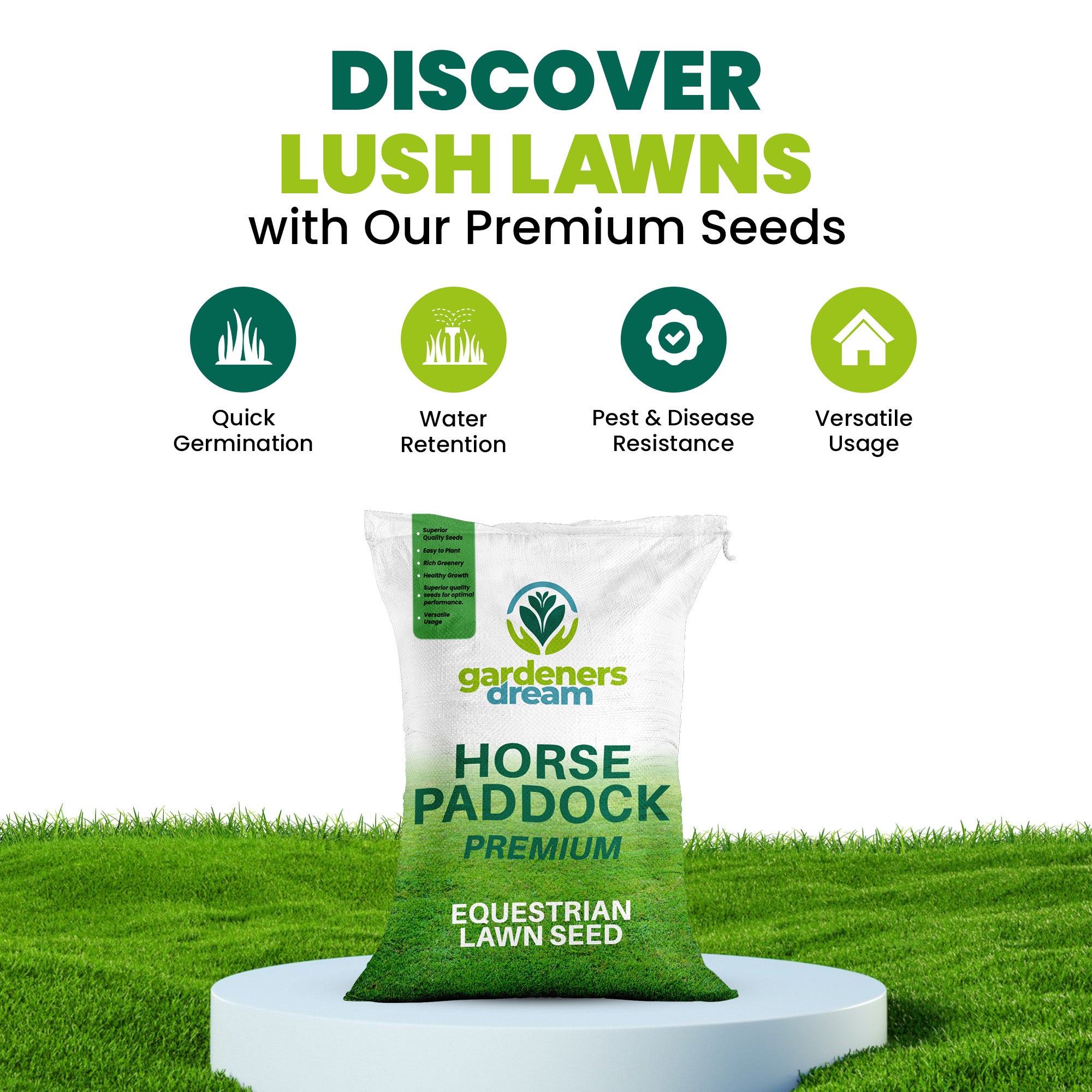 Introducing Gardener's Dream Horse Paddock Grass Seed, the premier choice for horse paddock gateways and grazing areas in the UK. This special blend is crafted to flourish in the UK's distinct climate, providing a superior grazing ground that stays lush and green across all seasons.