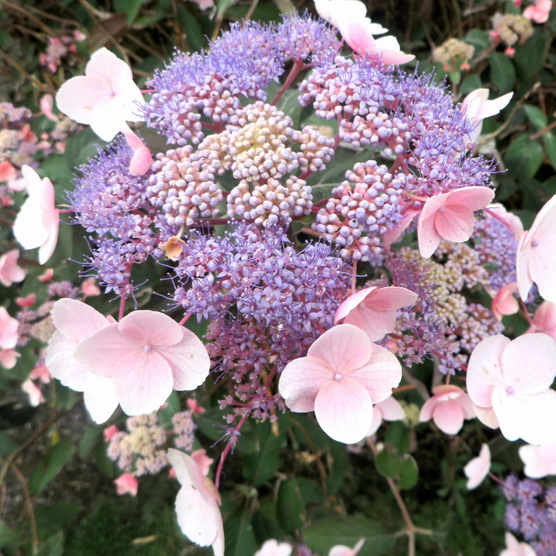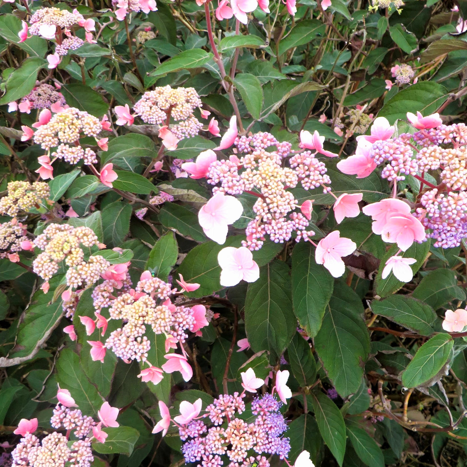A lovely, versatile shrub that is a wonderful addition to just about any area of the garden. This low maintenance Hydrangea ‘Hot Chocolate’ is a distinctive variety with large,felted, toothed leaves of dark green flushed with purple when young and a purple-red underside. The flowers begin as clusters of violet-blue buds above the foliage, before blooming into beautiful pink lacecap flowers from early Summer through to the Autumn.