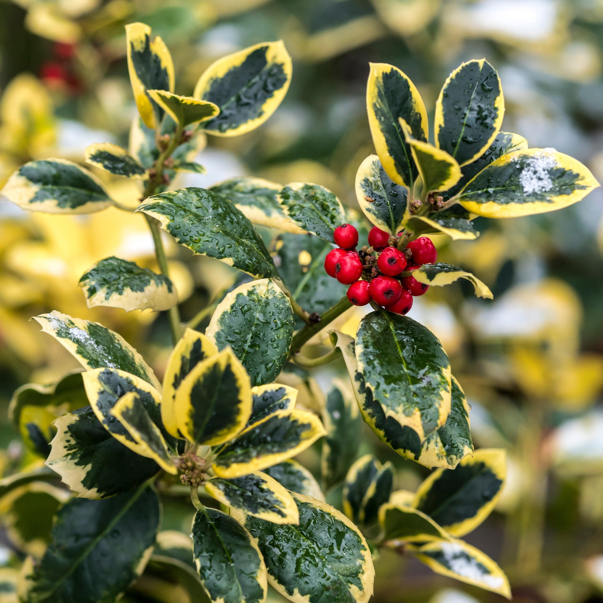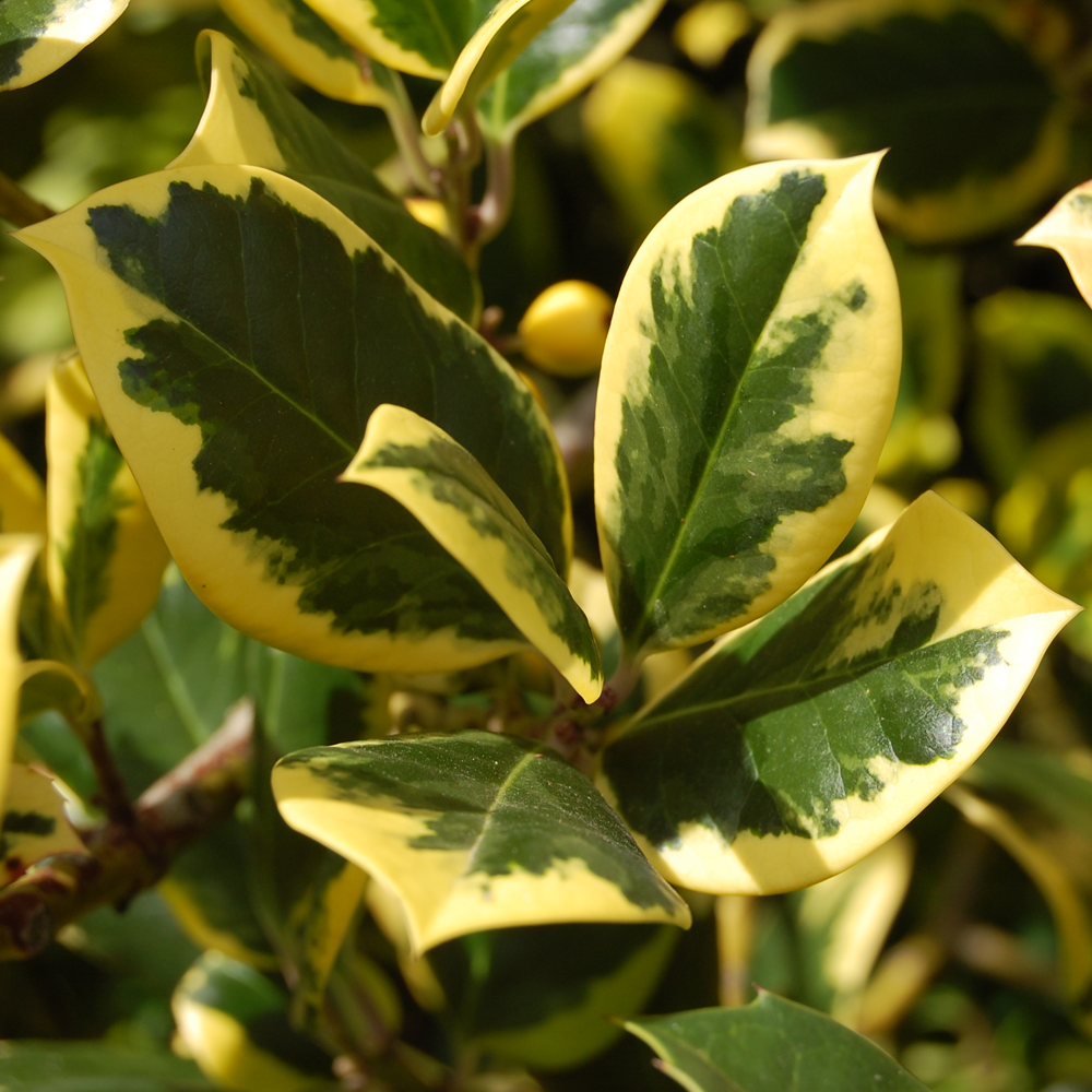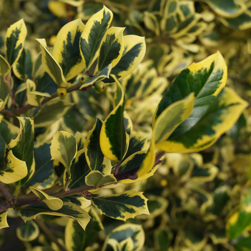 The Golden King Holly is a small evergreen shrub that offers glossy green leaves with beautiful golden yellow margins. The colder the weather, the deeper the yellow colour becomes.