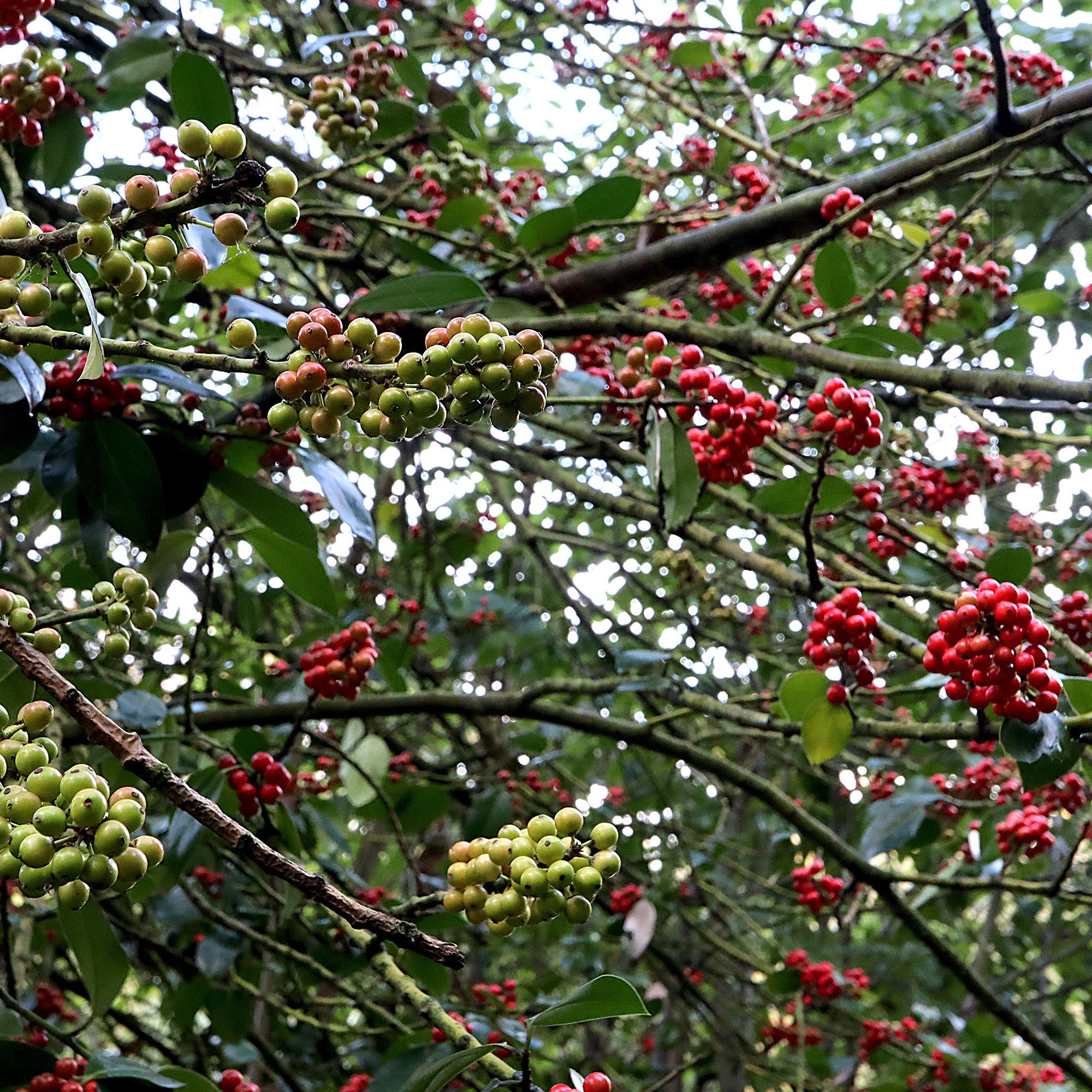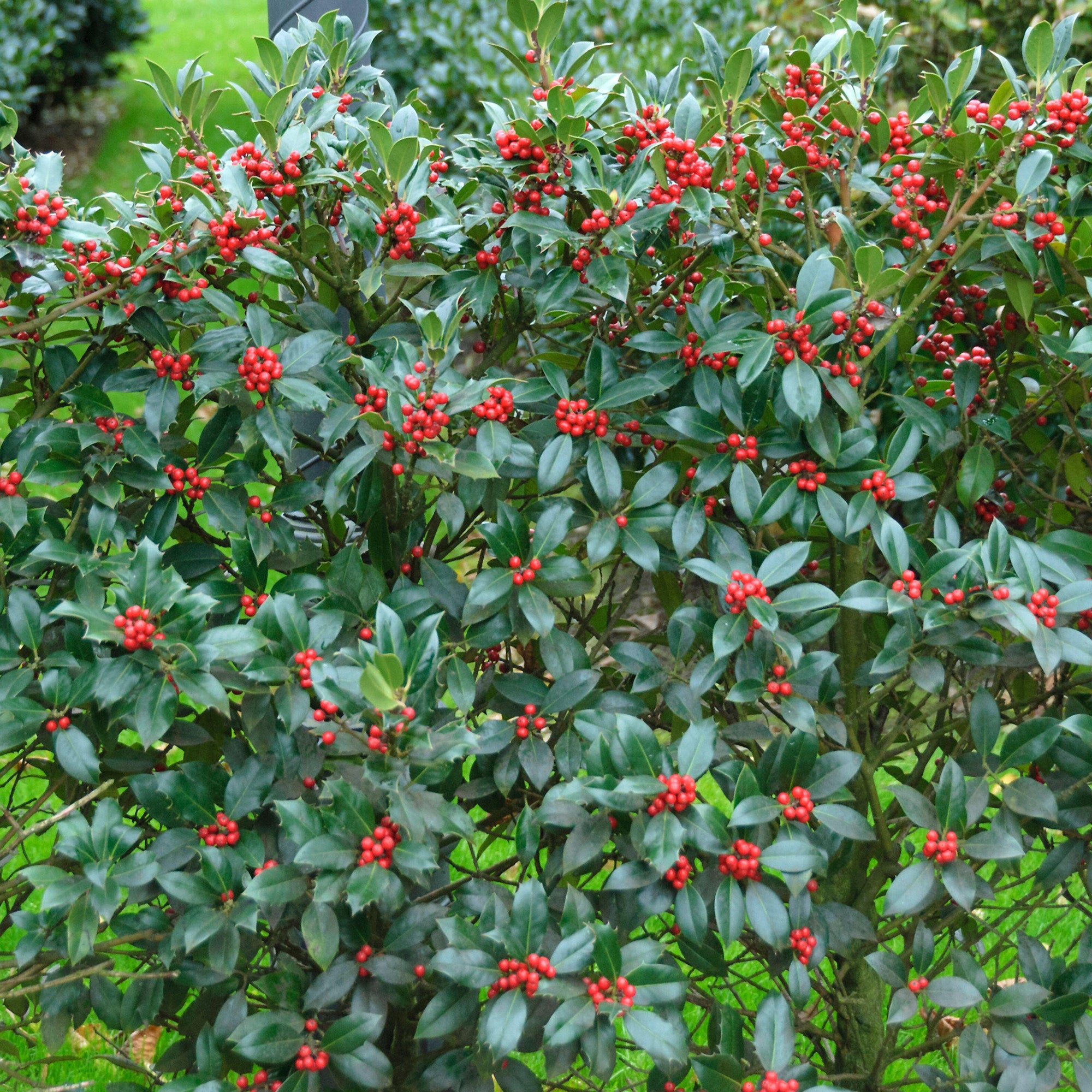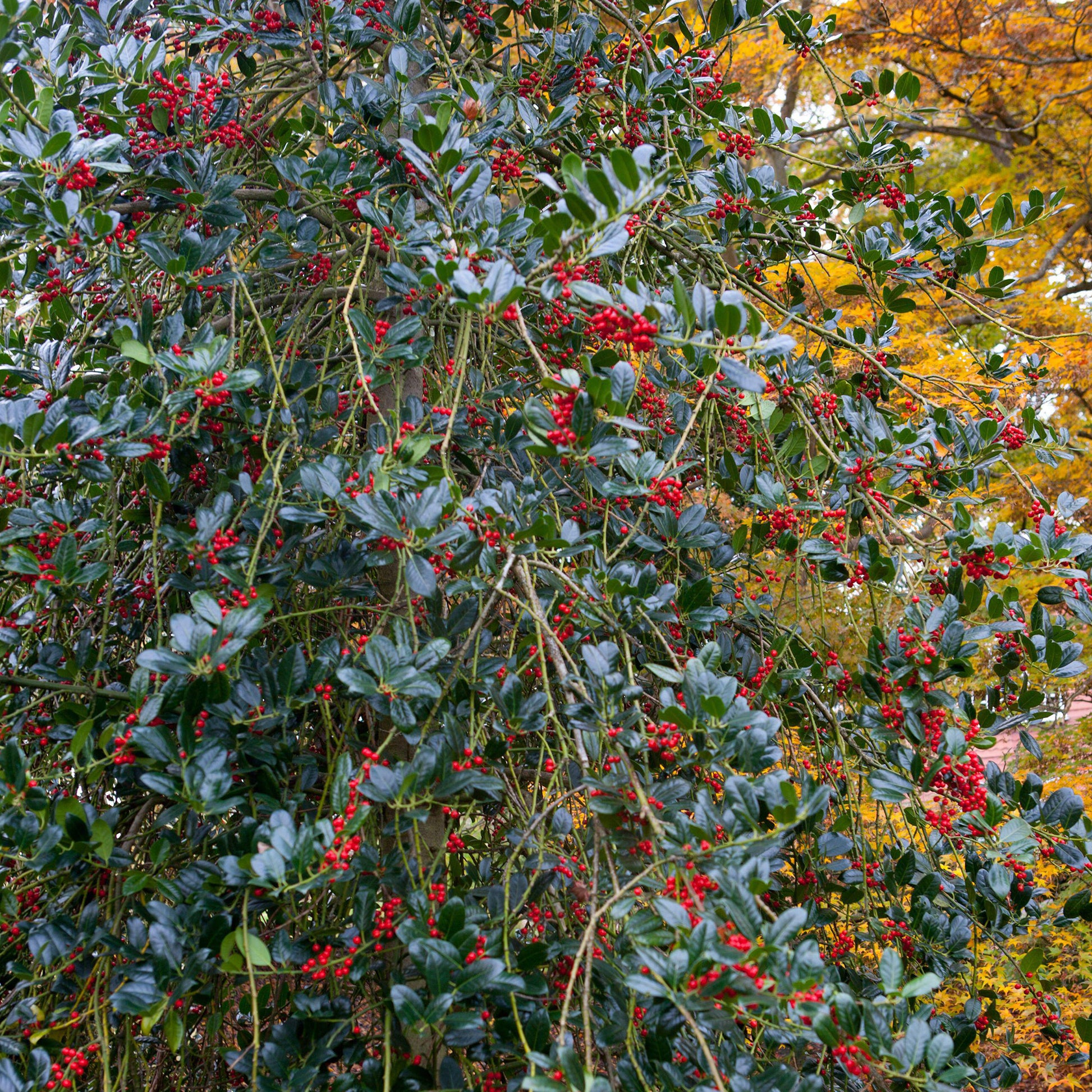 This holly's dense, bushy, and evergreen habit makes it a highly versatile garden shrub. It forms an excellent standalone specimen, where its berried branches can create a stunning focal point, but it is also one of the best varieties for creating a hedge due to its spineless nature, which makes for much easier trimming. It has a naturally tidy, somewhat conical shape and is very low maintenance once established. Planted in sun or partial shade, it will provide excellent year-round structure and a vital food source for birds.