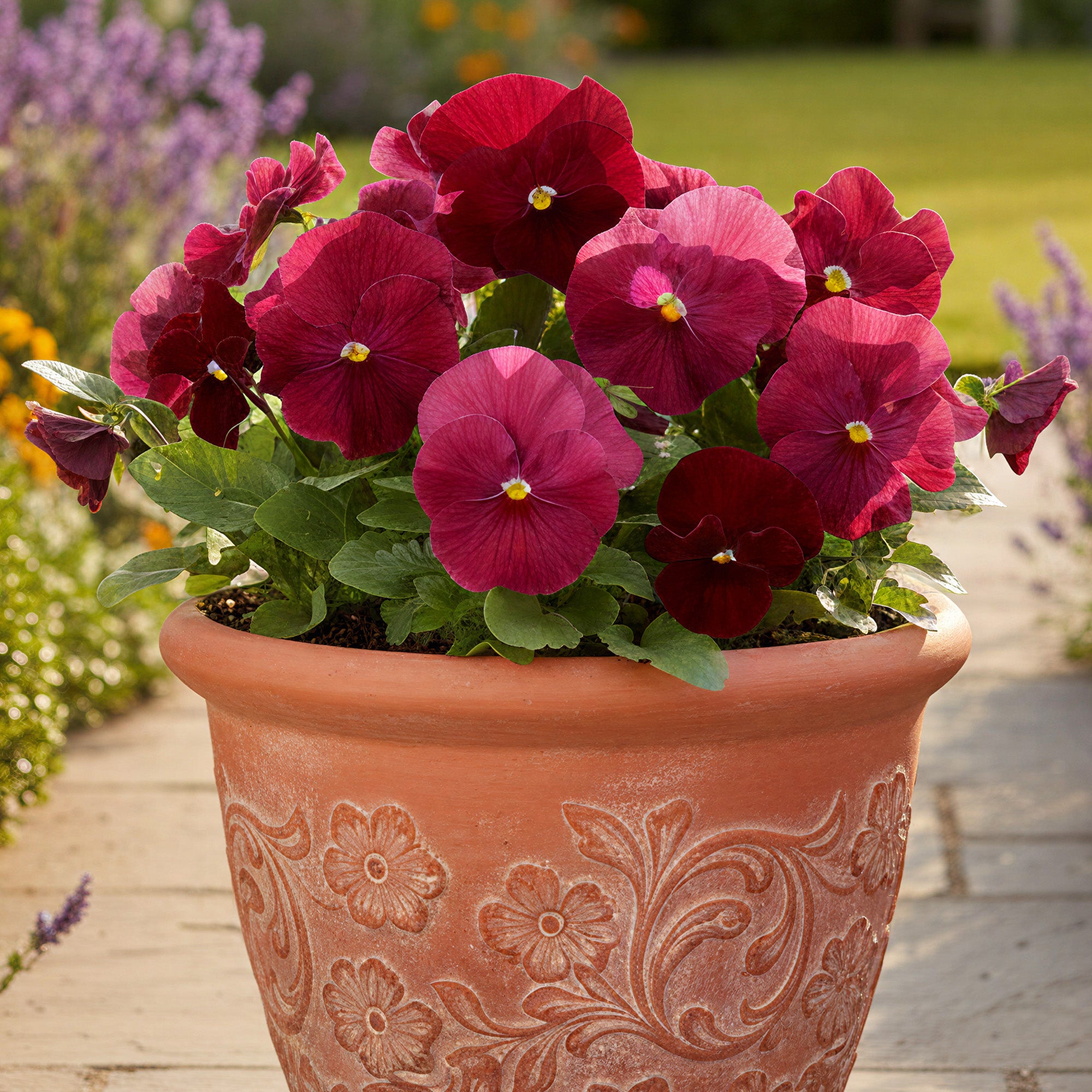 Add a splash of rich rose-red colour to your garden this season with the Jumbo Pure Rose Winter Pansy. Its large, velvety petals create striking displays in borders, containers, and hanging baskets, bringing warmth and vibrancy when most plants are fading. Supplied in a pot and ready to plant, it offers instant impact with very little effort.