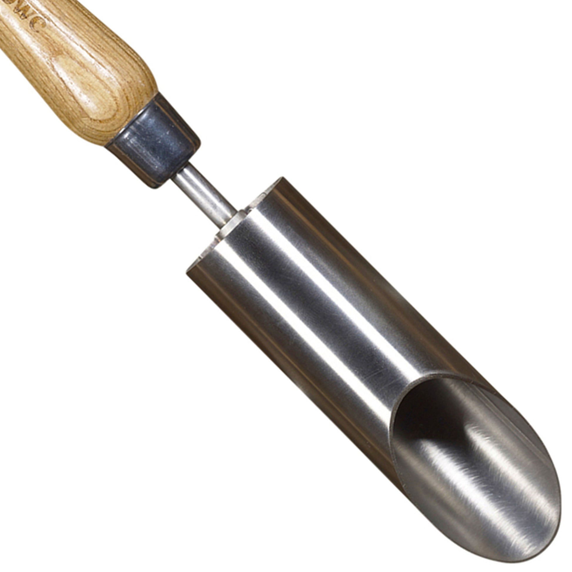 The ash wood handle is contoured for comfort, and the stainless steel, sharp, angled tool head can remove a 4cm diameter core from soil.
