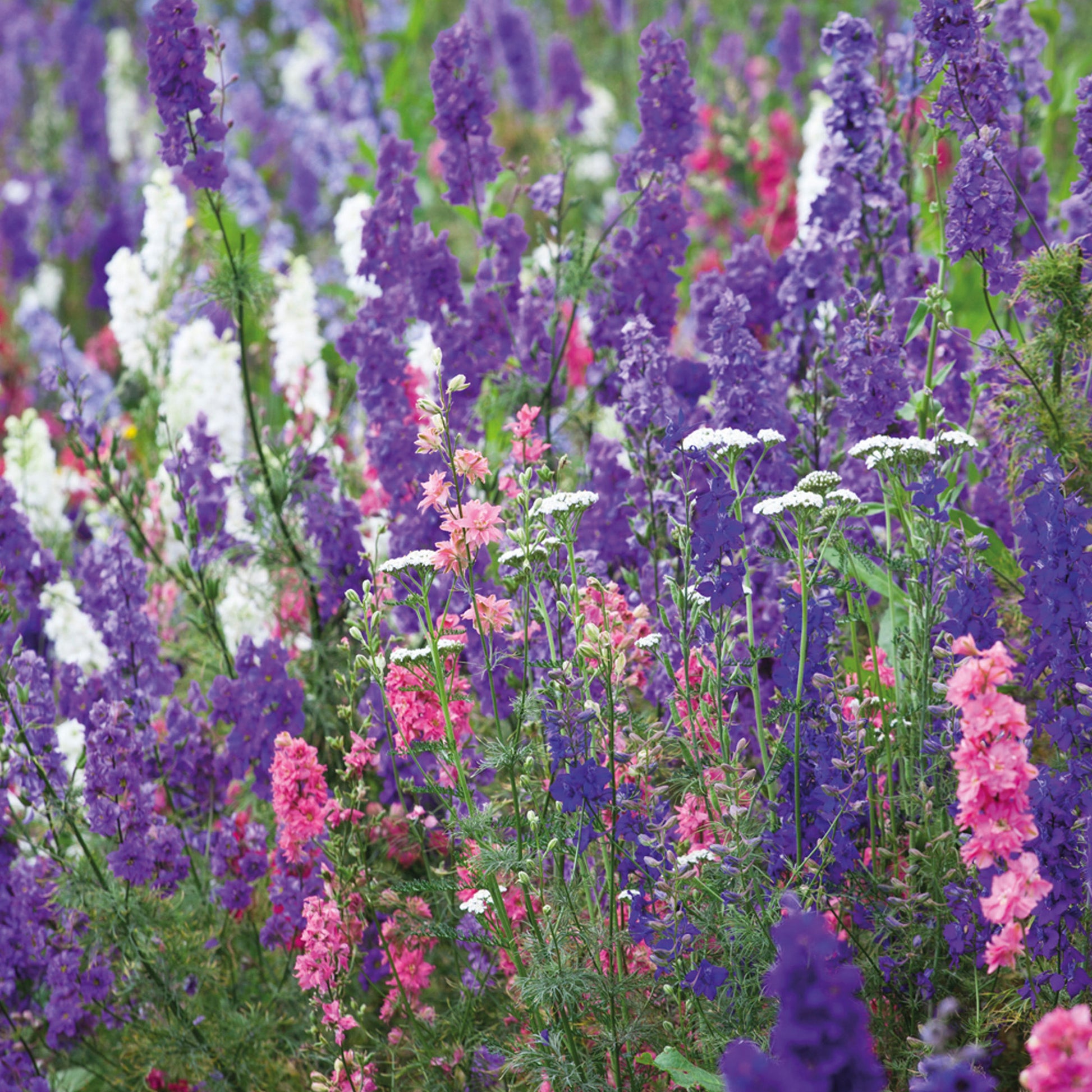 Sow seeds directly outdoors from April to May, once the soil has warmed, or in September. For best results, chill seeds in the fridge for 1–2 weeks before sowing to improve germination. Plant 1cm deep and 25cm apart in well-drained soil in full sun or light shade and keep the area consistently moist until seedlings establish. As they grow, thin the seedlings out to leave a 20cm gap between plants. Larkspur ‘Giant Imperial’ typically flowers from July to October, offering a long-lasting display of colour and texture through the height of summer and into early autumn. September sowings will flower the following year.