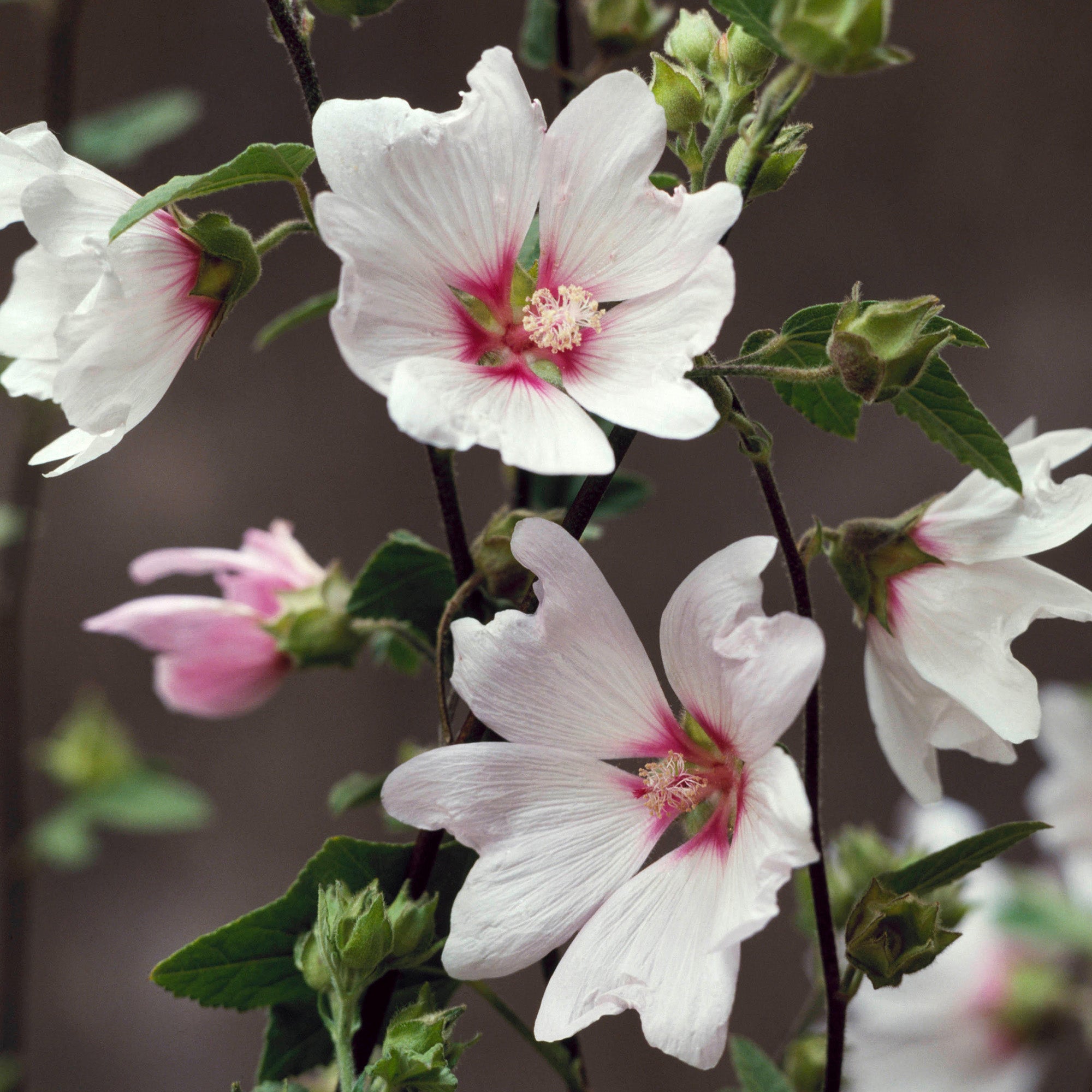Lavatera can be annuals, biennials, perennials or subshrubs, with long-stalked, palmately lobed leaves and large, funnel-shaped flowers in summer