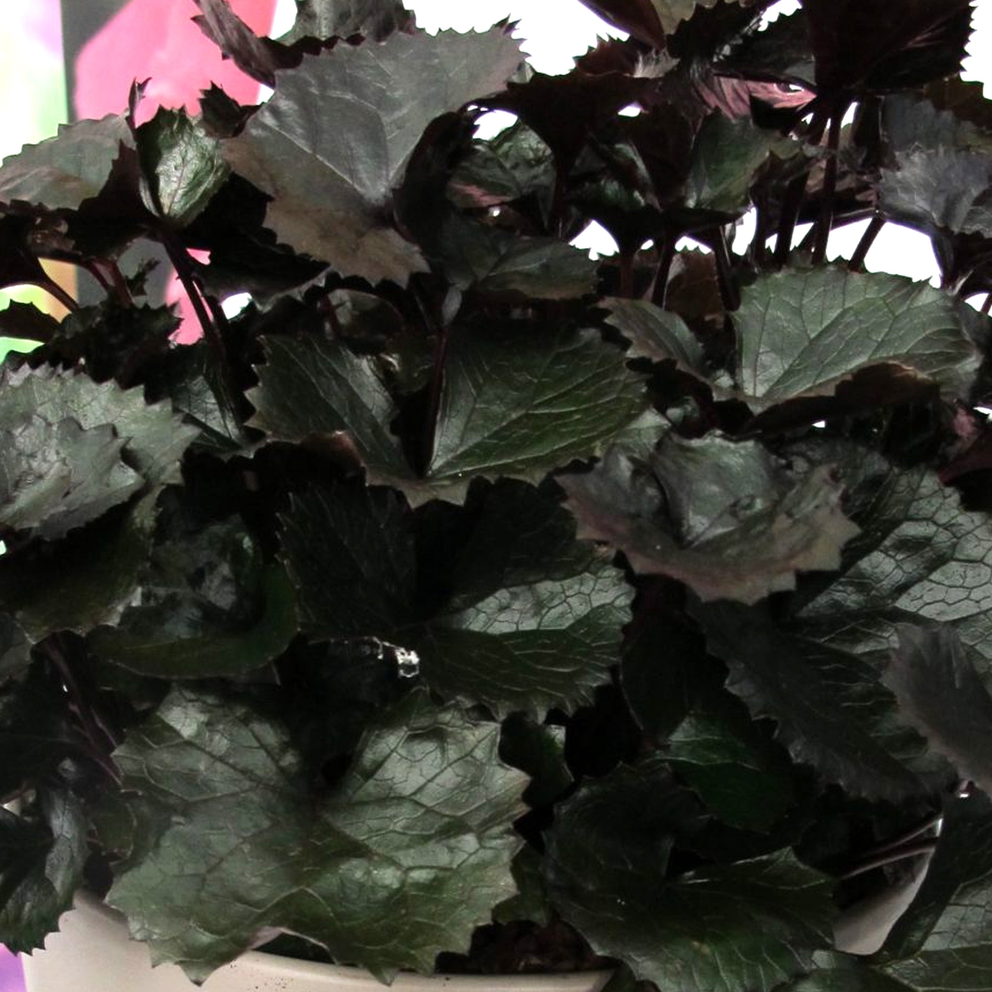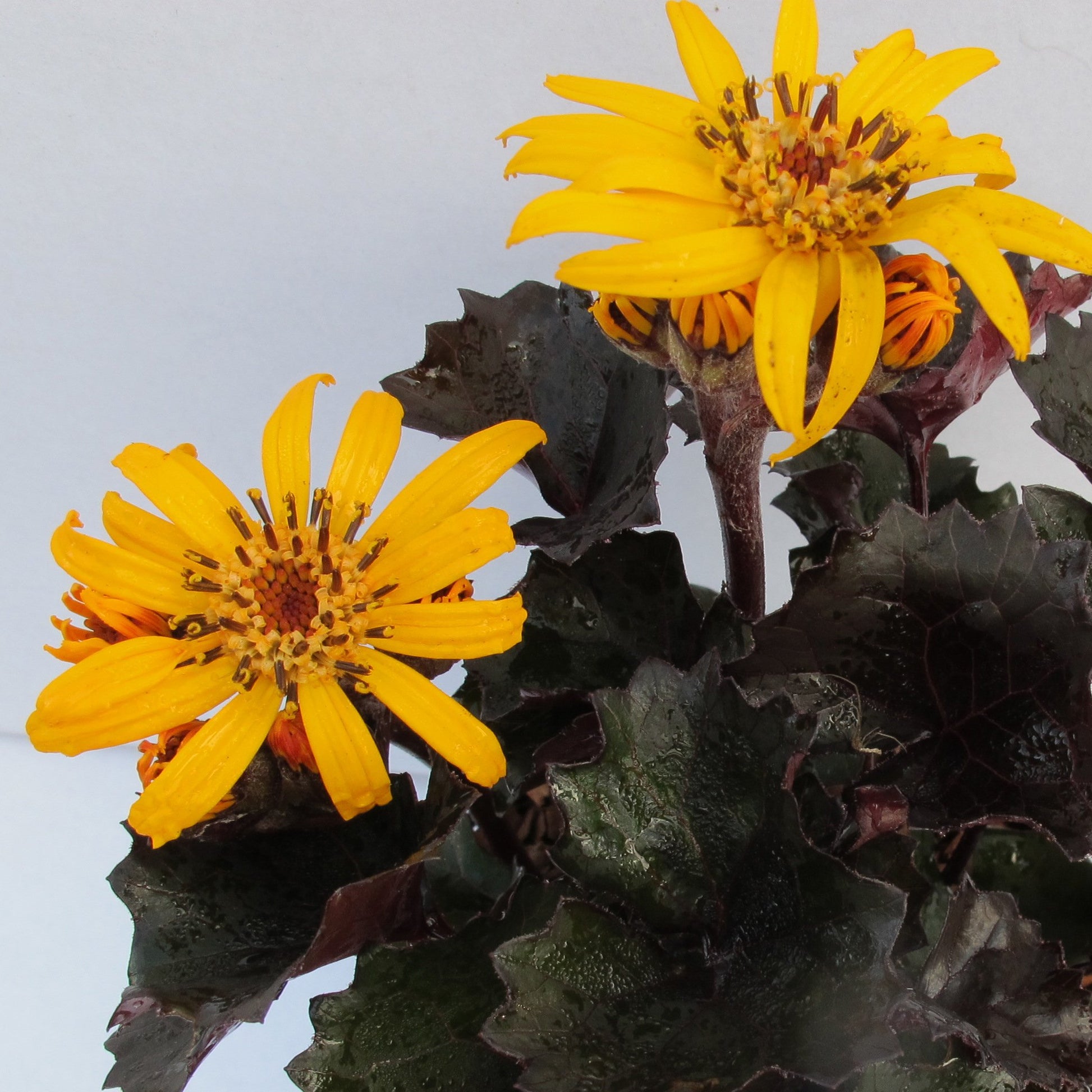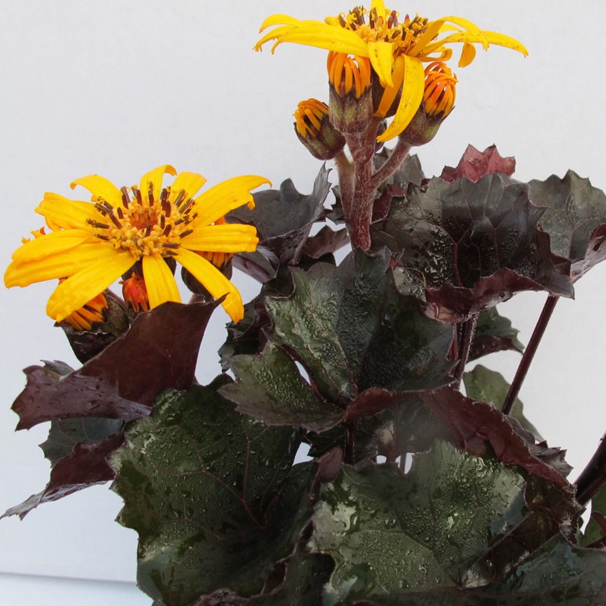 Ligularia ‘Pandora’ is a clump-forming, compact perennial with large, broad, toothed leaves which appear as a deep, dark purple and slow gain a flush of olive green as they mature. During the Summer months, short stalks bearing daisy-like golden-yellow flowers bloom, lasting through to the early Autumn.