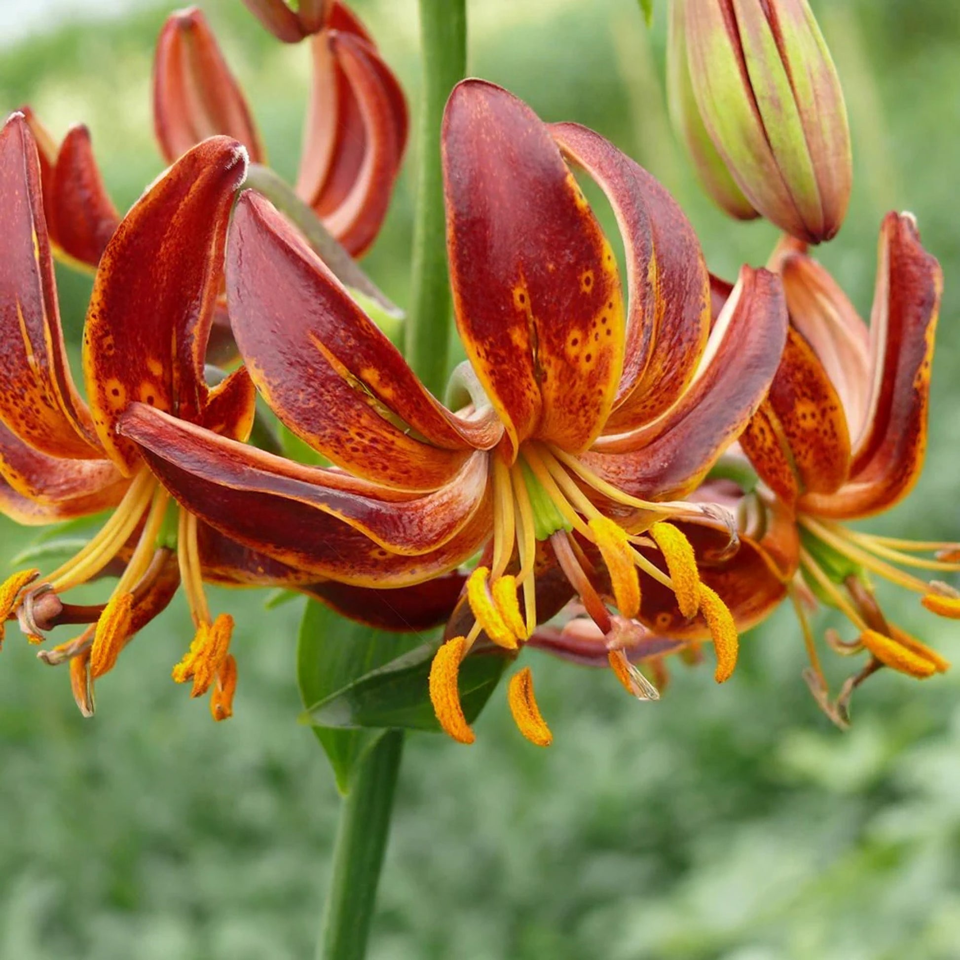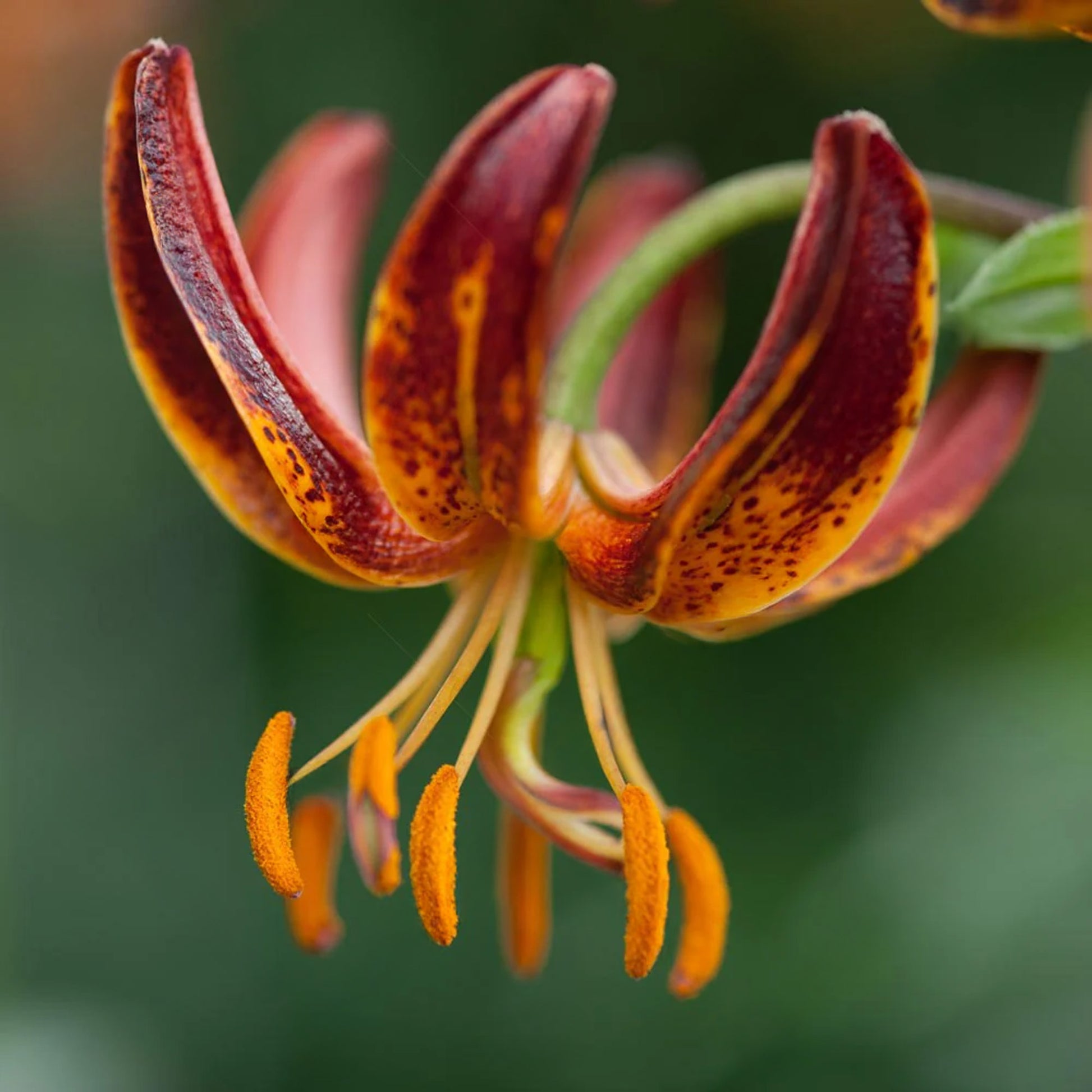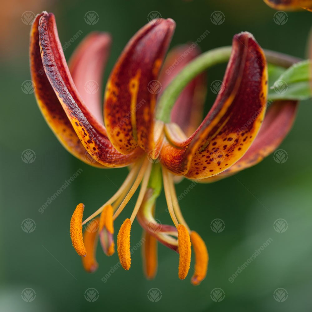 Arabian Knight is Martagon Lily and each bulb produces up to 40 flowers per stem with vibrant flowerheads of petals with golden oranges with heavy deep red spotting and markings. Golden orange anthers appear on elongated stamens and the plant has narrow, glossy dark green lanceolate-shaped foliage.