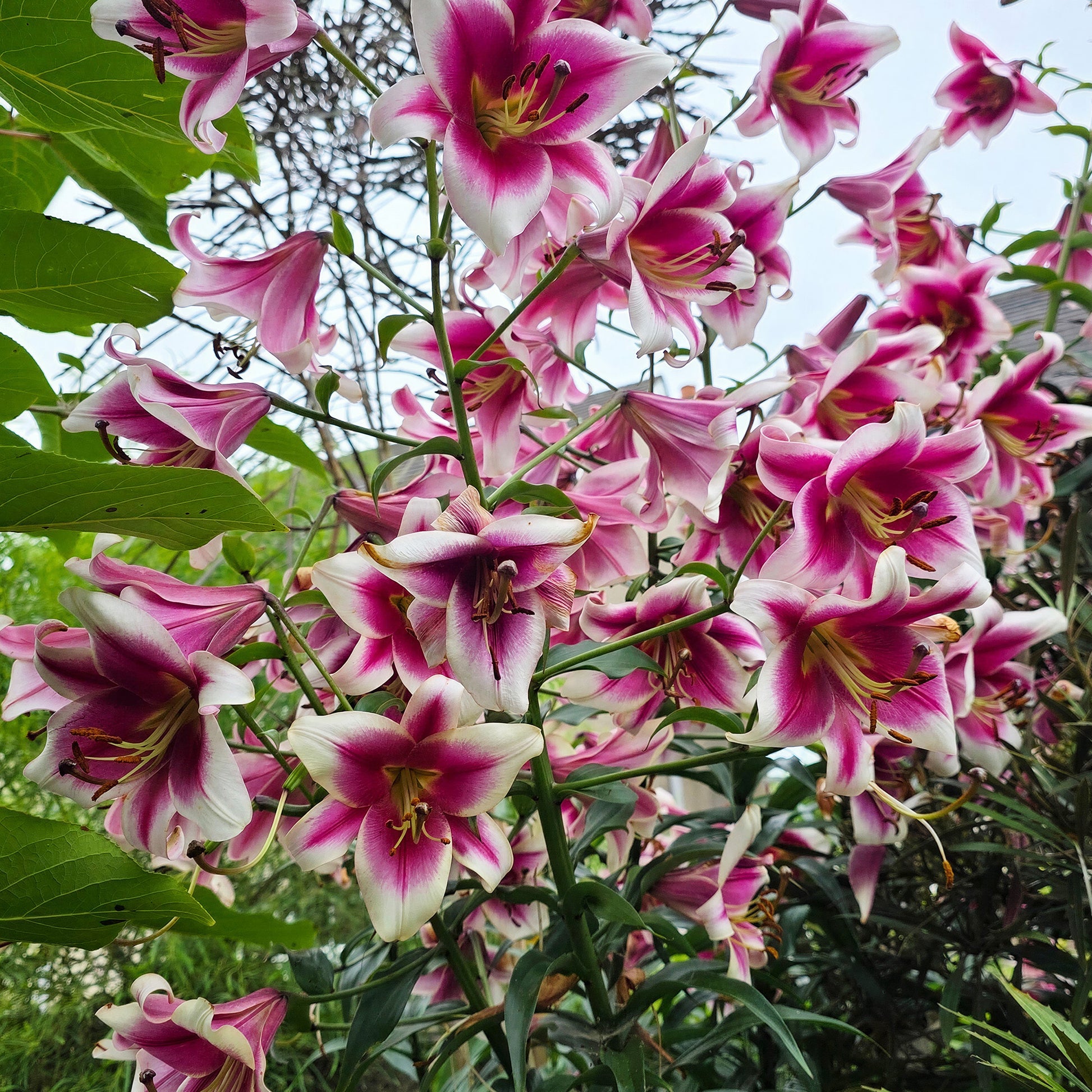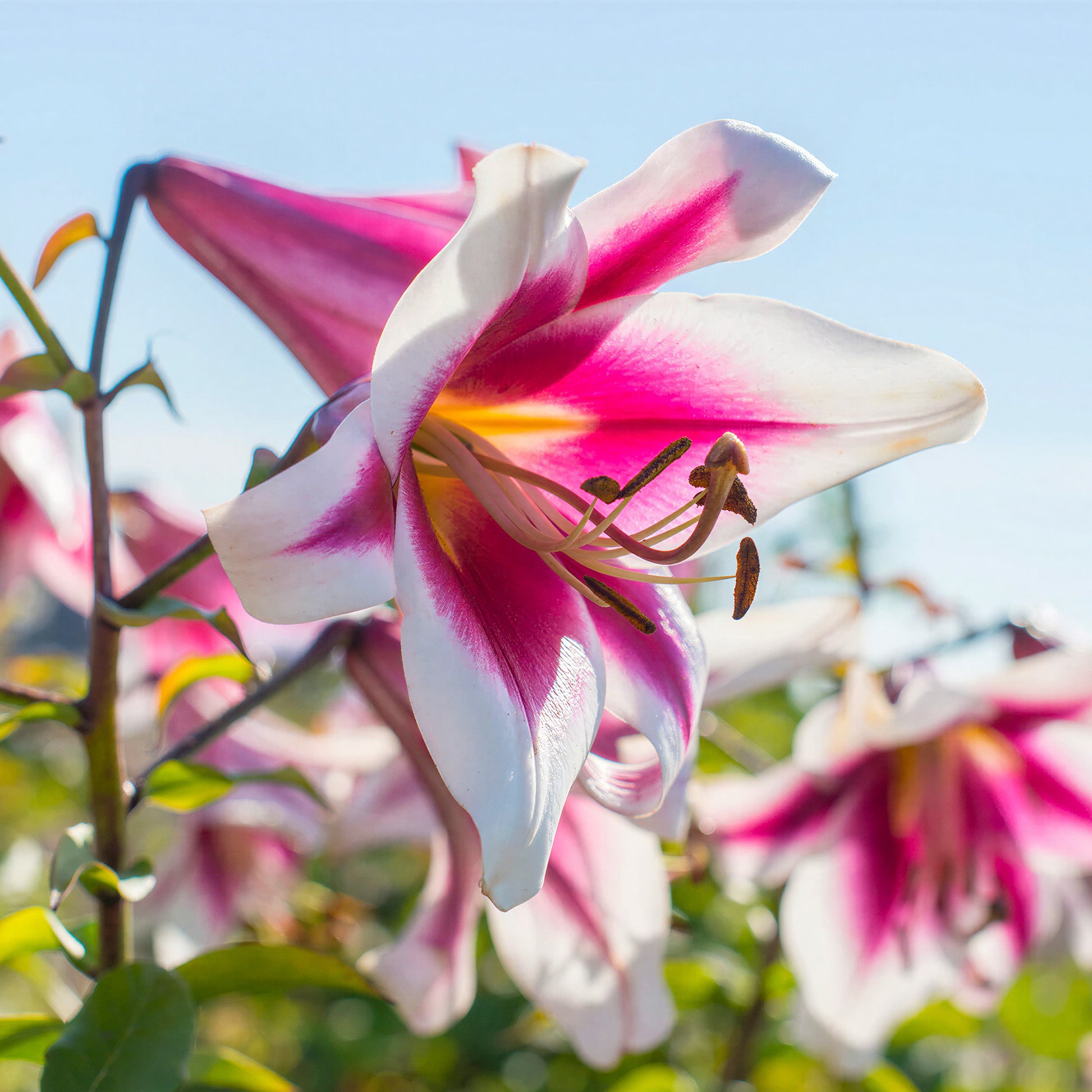Lily Skyscraper Friso brings vibrant colour and graceful height to the garden, rising on tall, sturdy stems that create a natural focal point through summer. The large blooms open in rich shades of deep pink, raspberry and soft white, giving each flower a warm, uplifting presence that stands out beautifully against green foliage. Their open, nectar rich flowers attract bees and butterflies, adding gentle movement and life to the display while keeping the overall look refined and balanced. Whether placed at the back of a border or used as a striking feature in a container, they offer height, colour and a beautifully expressive finish.