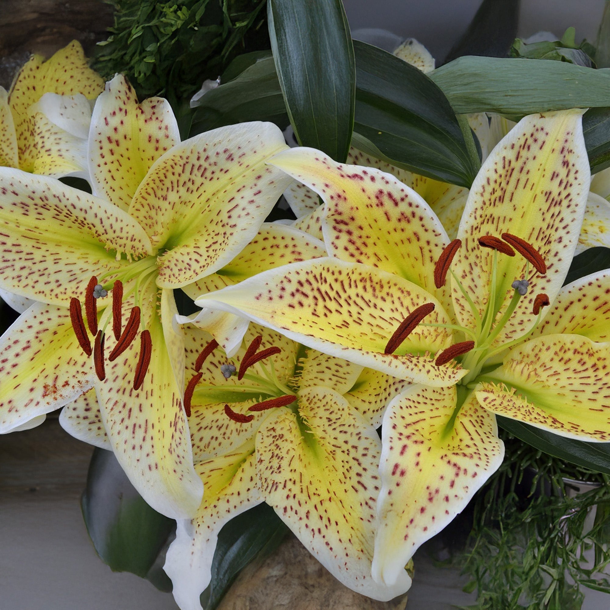'Tigermoon' is a striking double-flowered tiger lily variety that graces gardens in mid to late summer. Its large, nodding blooms feature layers of sunny yellow petals, each speckled with distinctive maroon spots, creating a dramatic and eye-catching display. The flowers are not only visually appealing but also emit a pleasant fragrance, making them a delightful addition to any garden setting.