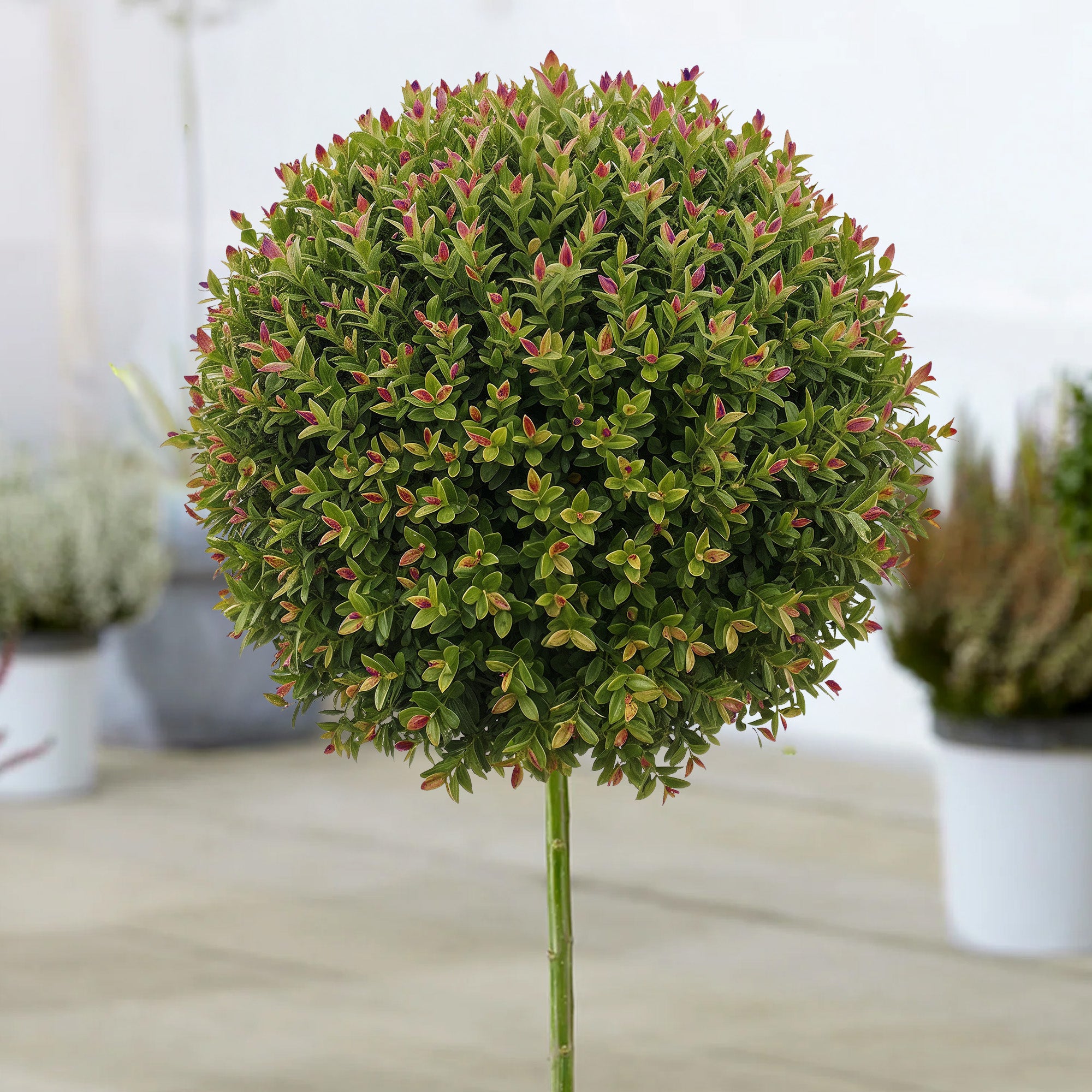 Lonicera Copper Glow patio trees are evergreen Honeysuckle plants with small, glossy green leaves edged with bronze, which grow into a neat mound. Creamy yellow flowers bloom throughout spring, followed by small, deep purple berries which are not edible. The crisp foliage is the focal point of this plant, and it will remain looking great all year round.