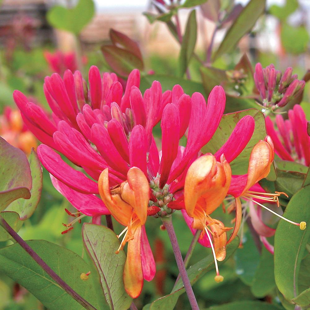 A beautiful and highly fragrant addition to any garden, Lonicera ‘Gold Flame’ is the perfect choice for outdoor seating areas with its heavy scent and bright, Summer colours. A vigorous deciduous climber, this shrub will quickly establish vines which carry clusters of vibrant pink and orange flowers which are highly attract to pollinators and may be trained for trellises, fences or on pergolas, though it will need to be tied to supports as it lacks the curling, twining vines of some other climbers.