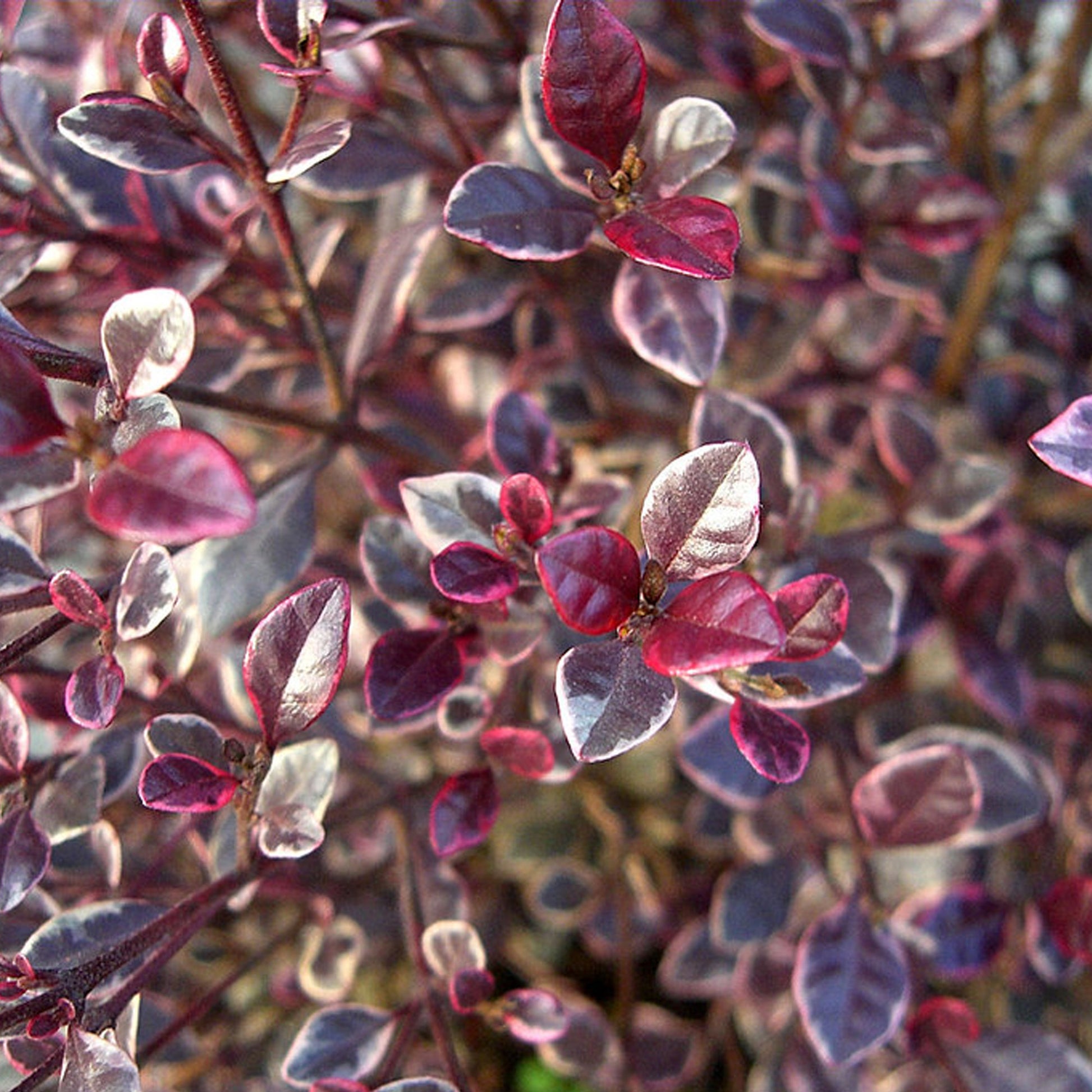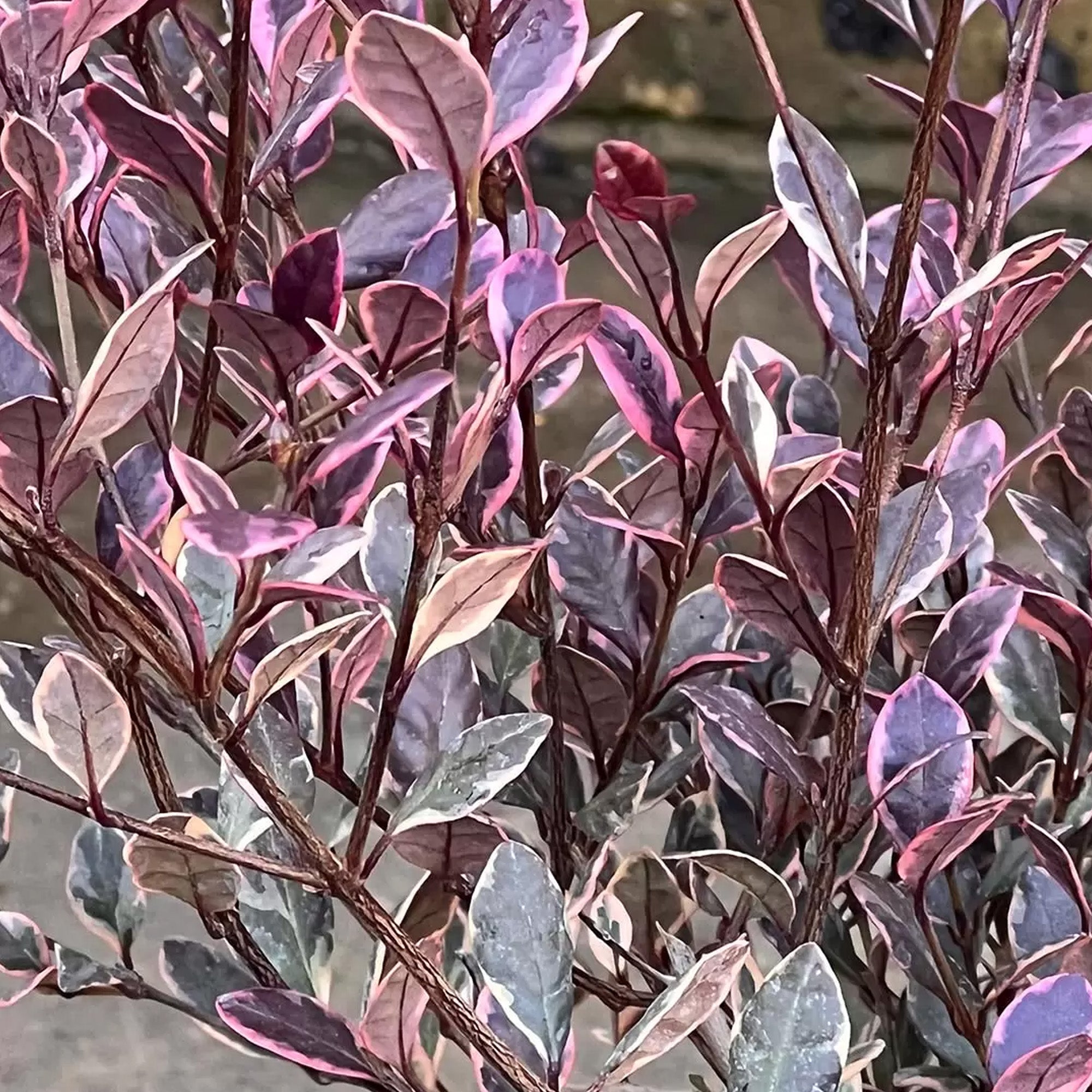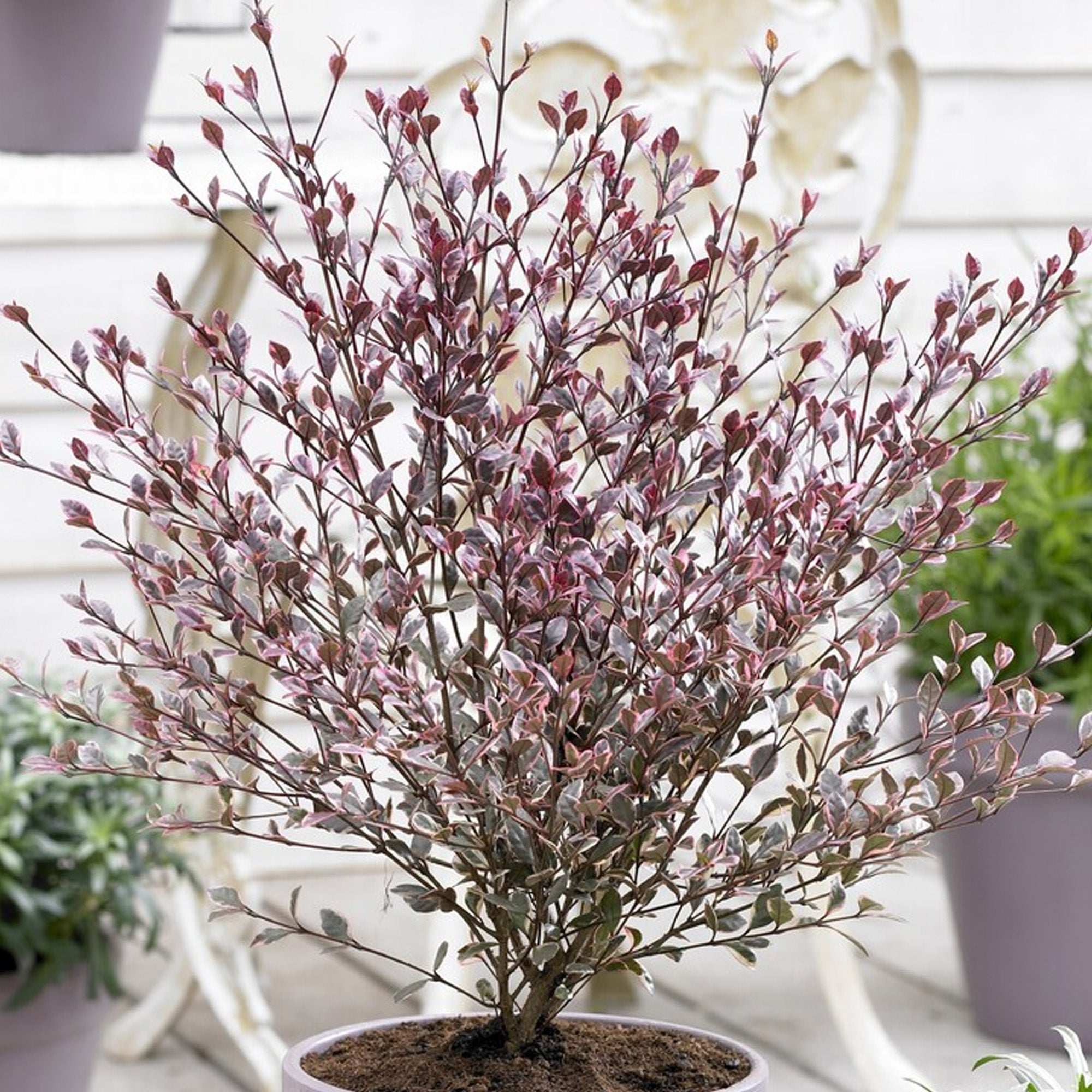 Lophomyrtus ralphii Magic Dragon is a dense, bushy evergreen shrub with dark, colourful foliage and summer flowers. Deep, reddish purple leaves are edged with creamy pink, providing colour all year long. In late summer, the plant is peppered with masses of small white flowers with a beautiful scent. In autumn, flowers are followed by small, black berries.