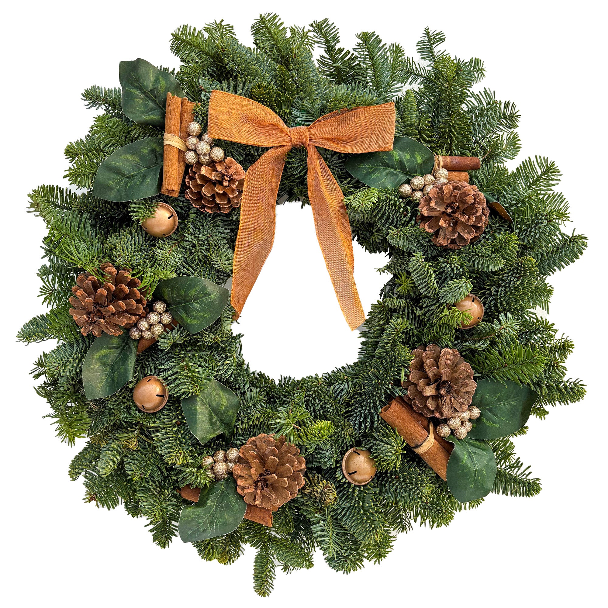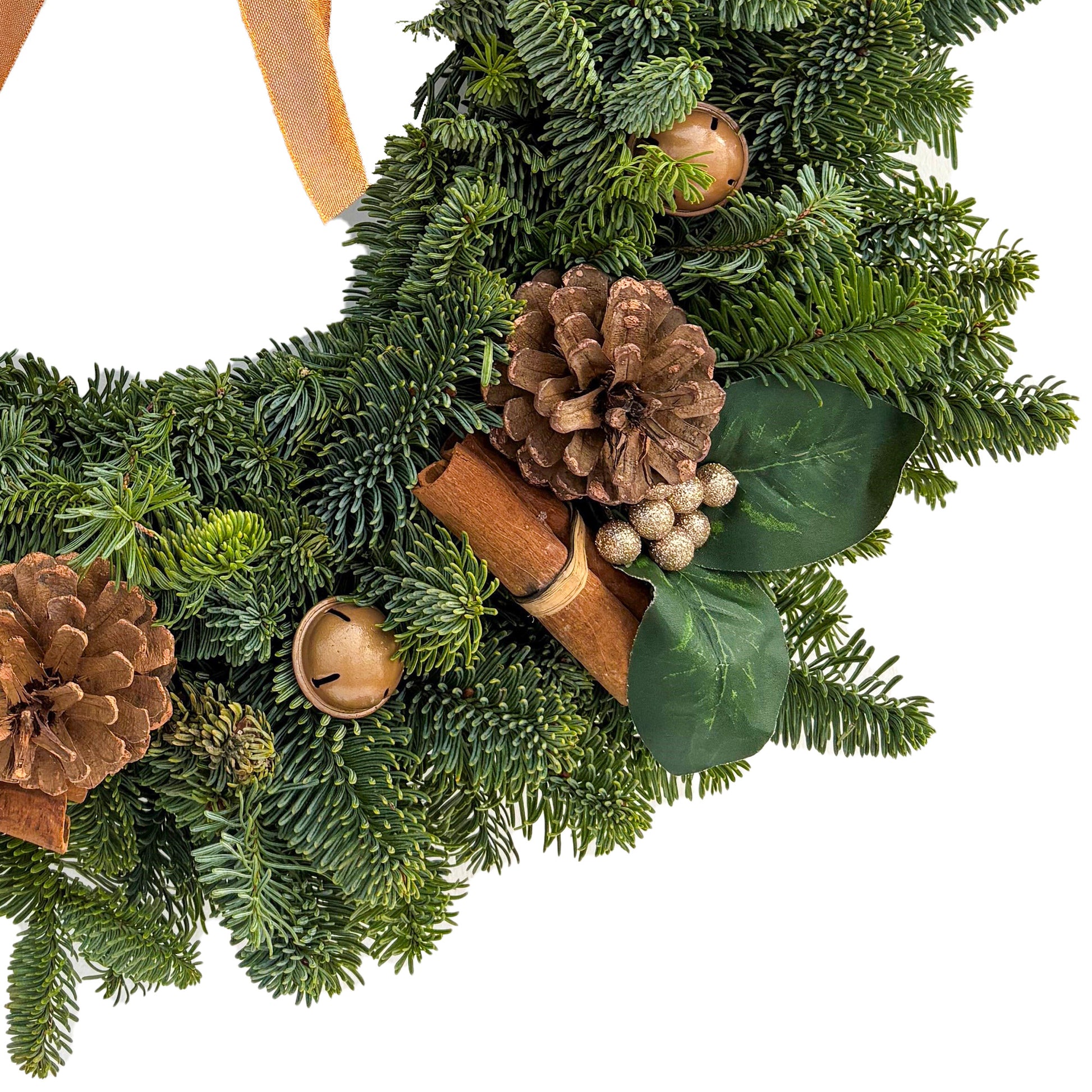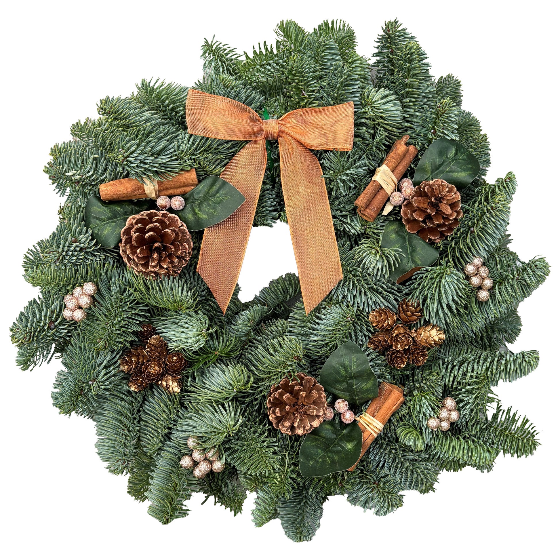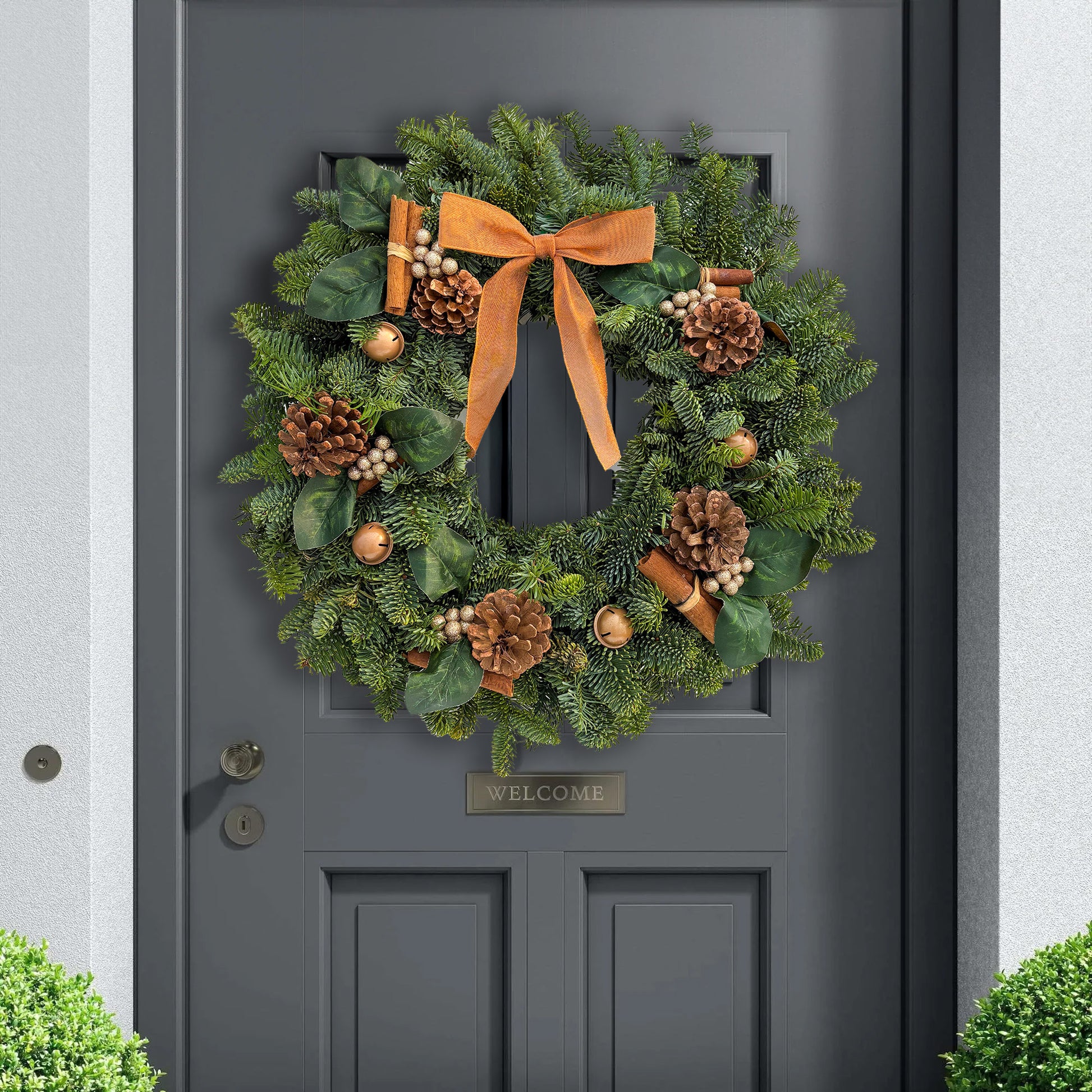 If you’re looking for a traditional front door wreath with a touch of festive sparkle, you can’t go far wrong with this Luxury Copper and Rose Gold Wreath. It is crafted using real Noble Fir foliage, providing a lush base for the warm metallic toned adornments, including cinnamon sticks and pinecones. The look is finished with a charming copper ribbon bow towards the top.