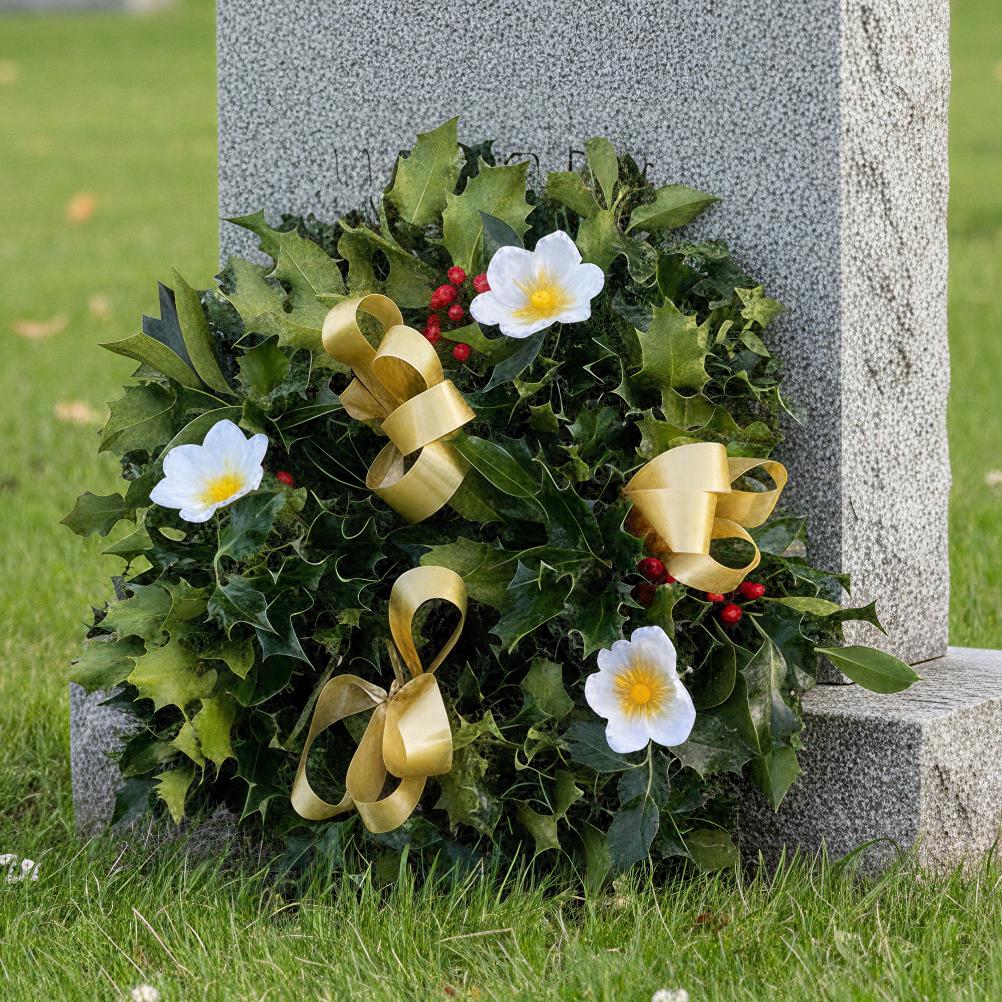 Crafted on a sturdy base for lasting freshness, the holly foliage remains vibrant even in colder weather. Perfect for placing at gravesides, memorials, or as a thoughtful seasonal remembrance gift.