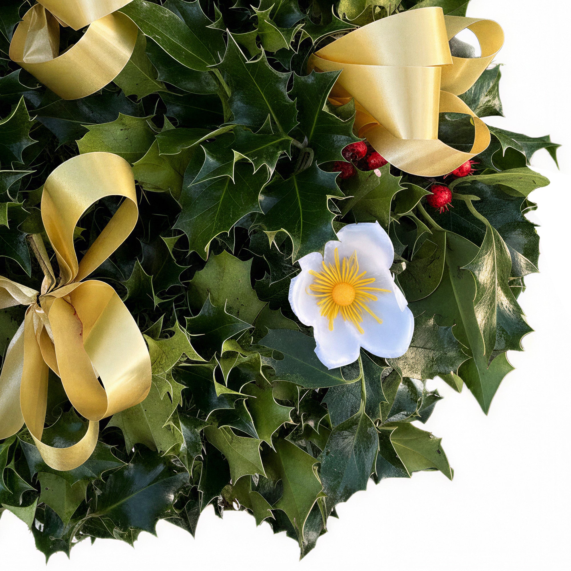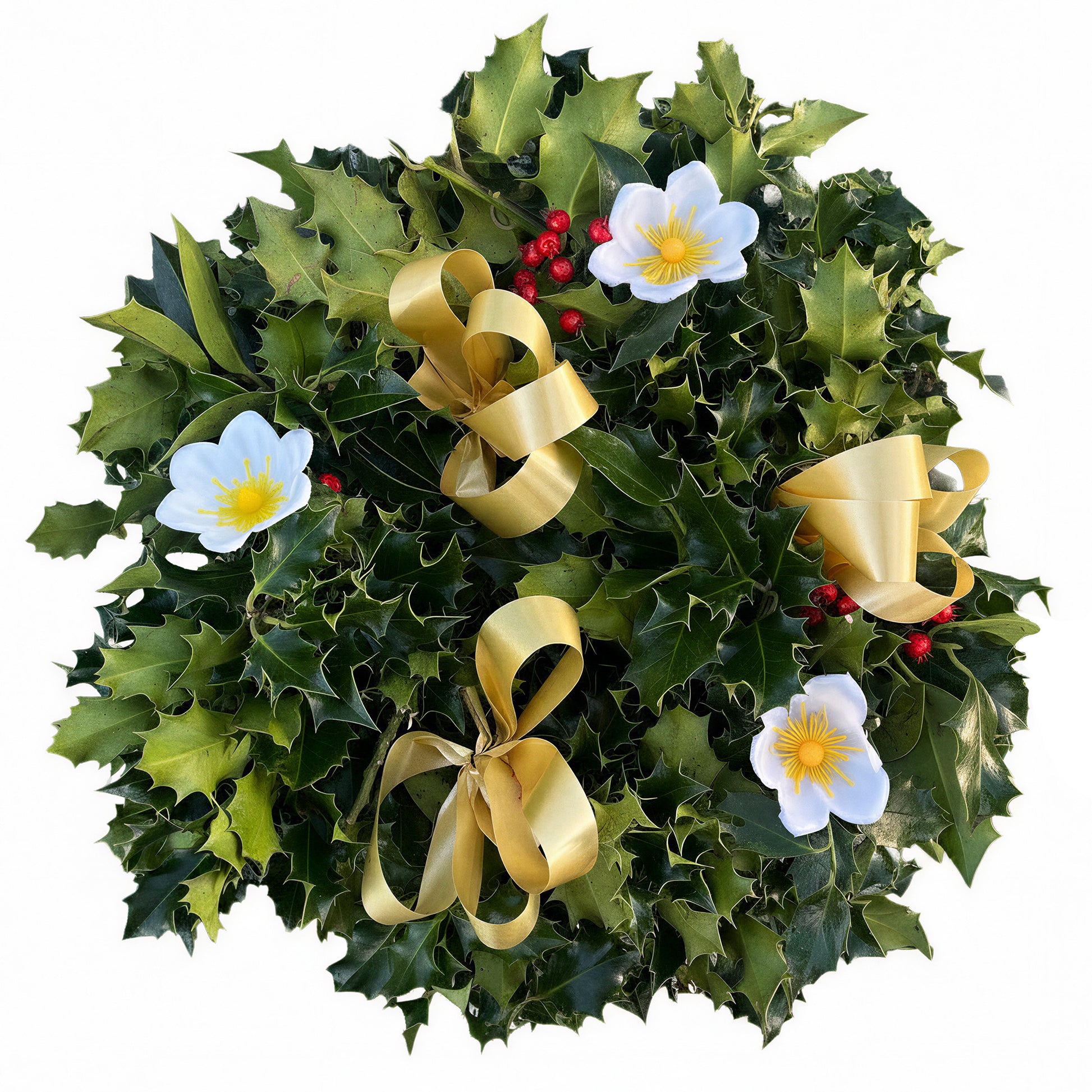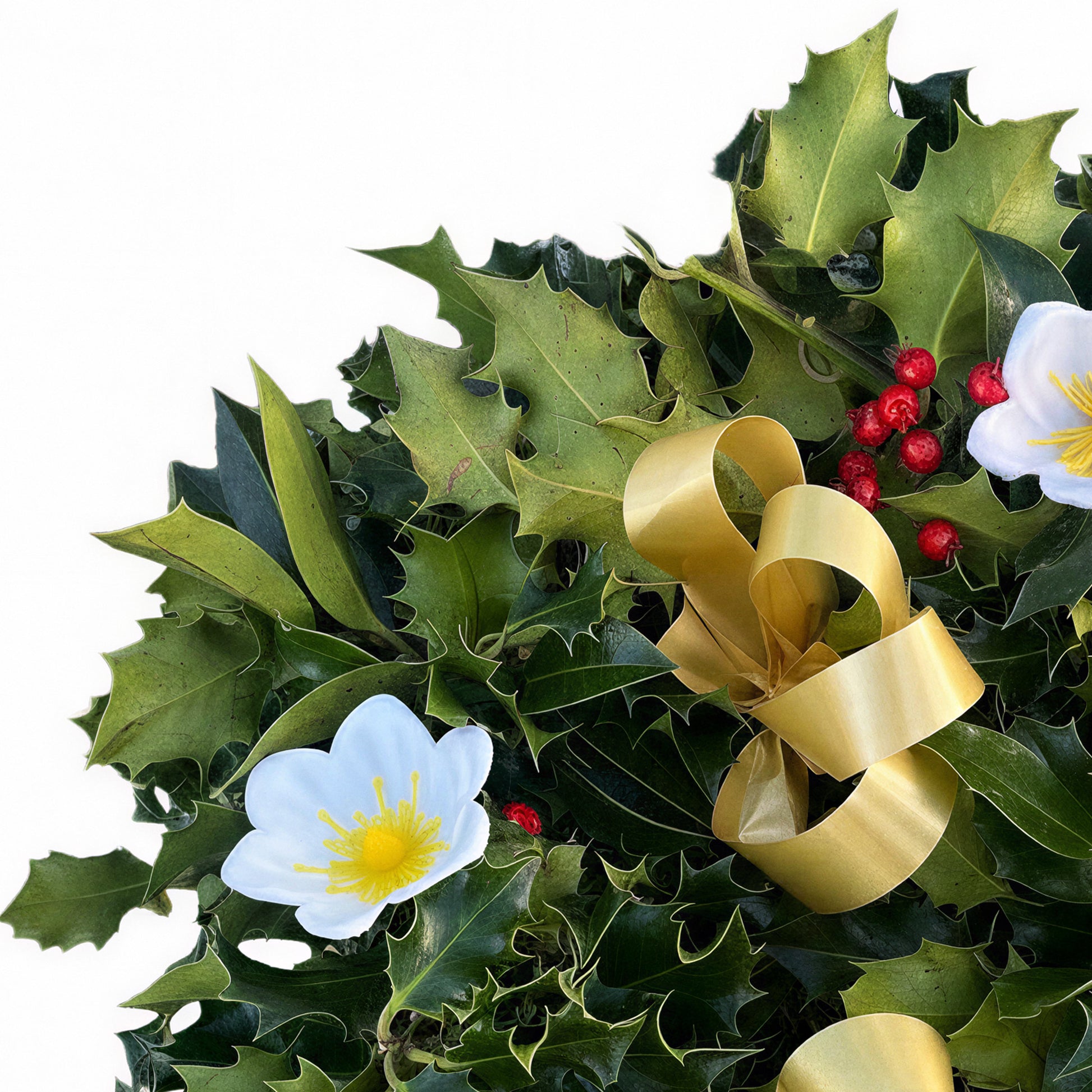 These real holly wreaths are handmade using freshly cut, real holly. This traditional grave wreath offers a timeless and respectful tribute during the festive season. Each wreath is beautifully decorated with clusters of red berries, artificial white flowers, and a striking gold ribbon. Designed to bring natural greenery and a touch of colour to memorial sites throughout winter.
