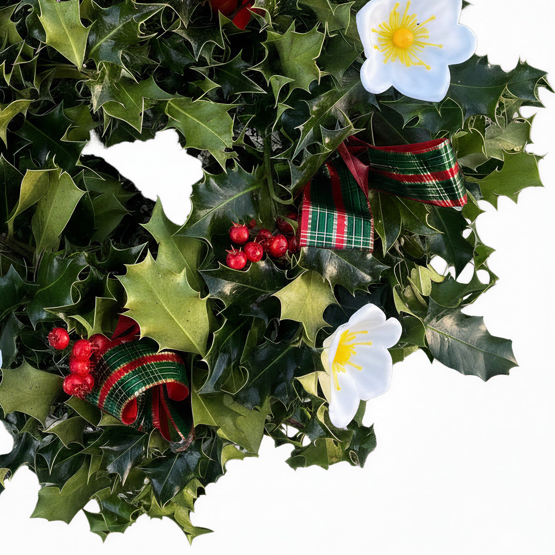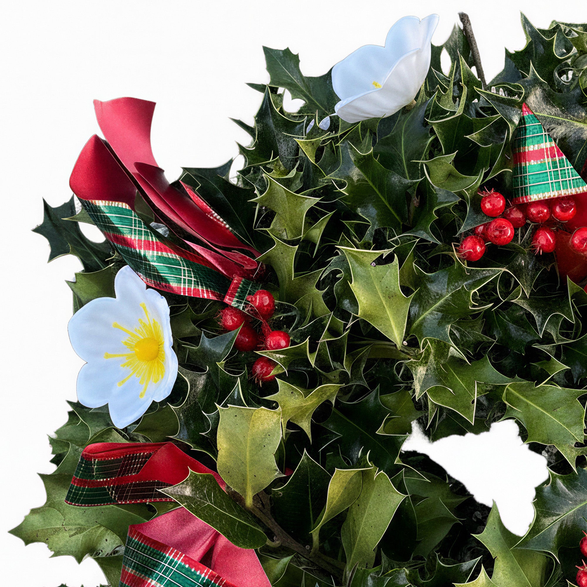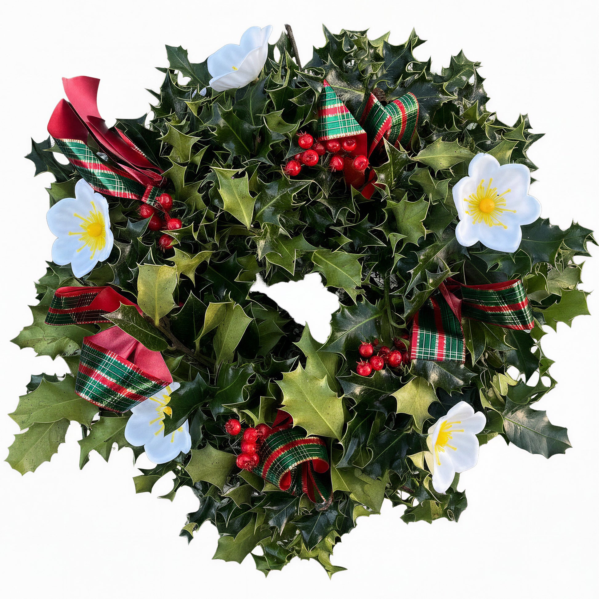 These real holly wreaths are handmade using freshly cut, real holly. This traditional grave wreath offers a timeless and respectful tribute during the festive season. Each wreath is beautifully decorated with clusters of red berries, artificial white flowers, and a striking tartan ribbon. Designed to bring natural greenery and a touch of colour to memorial sites throughout winter.