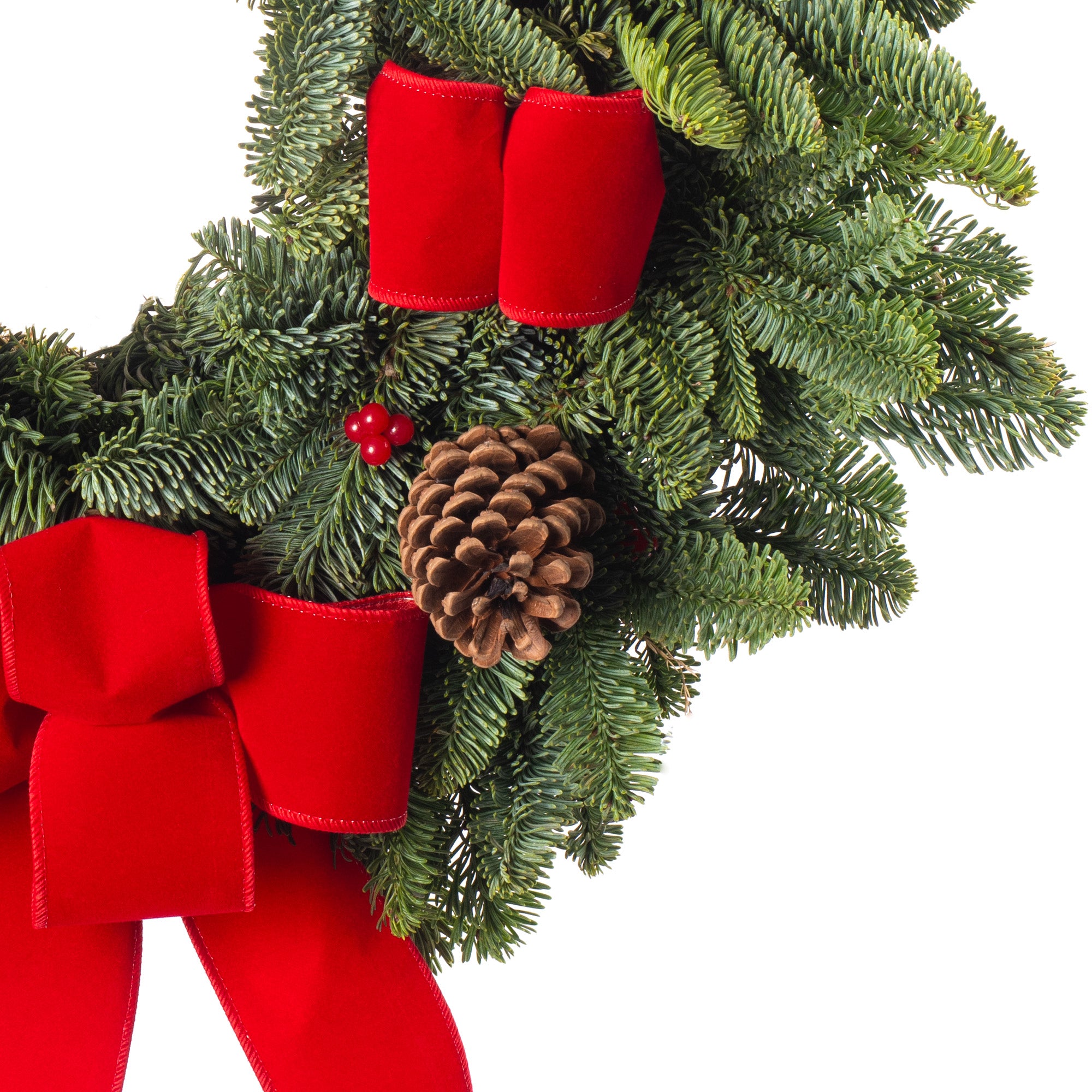 Gardeners Dream Noble Wreaths are made with freshly cut Noble branches and woven into a straw frame to provide support and structure. Attached to the wreath is a selection of pines cones and natural decorations which give it a rustic, classic feel of traditional Christmas wreaths.