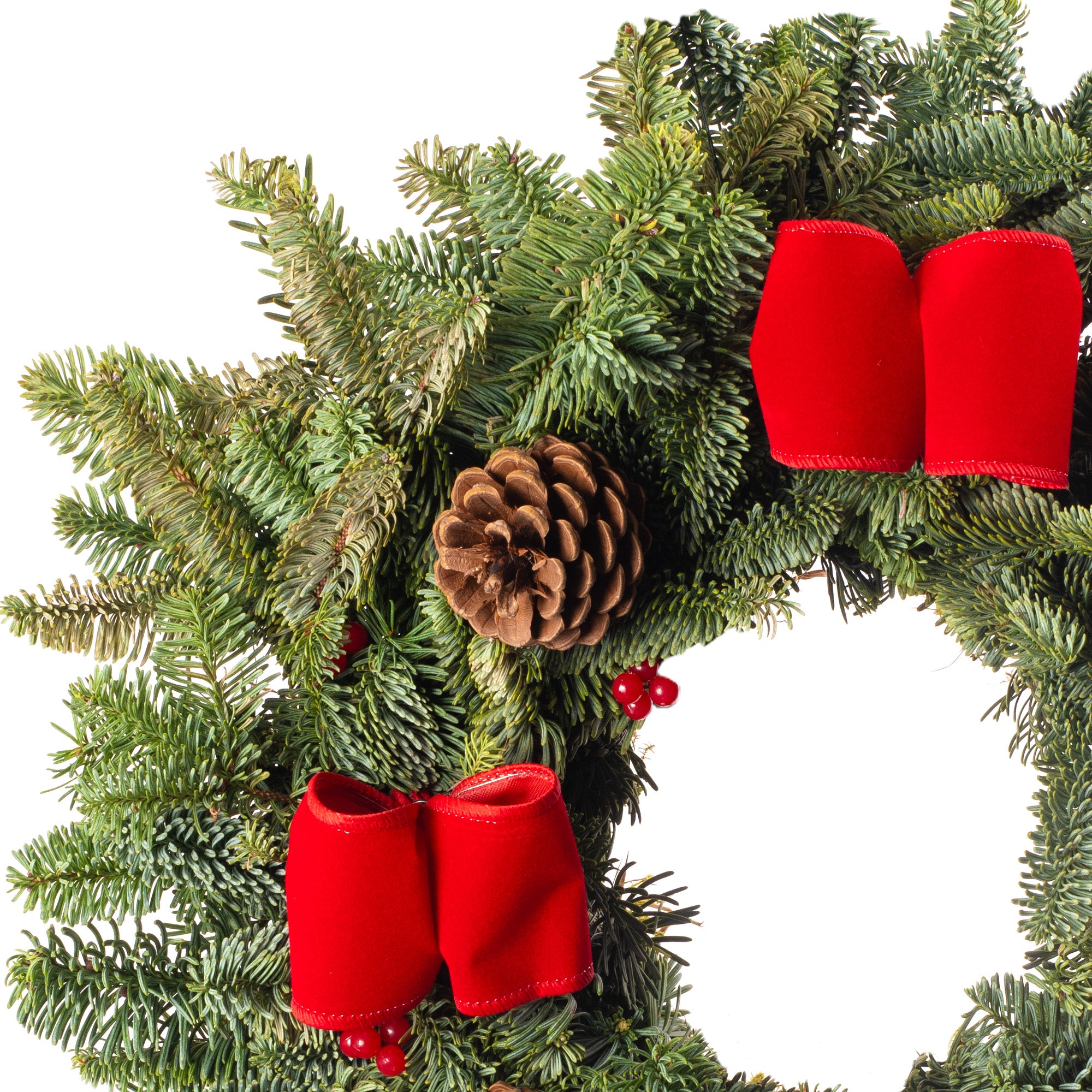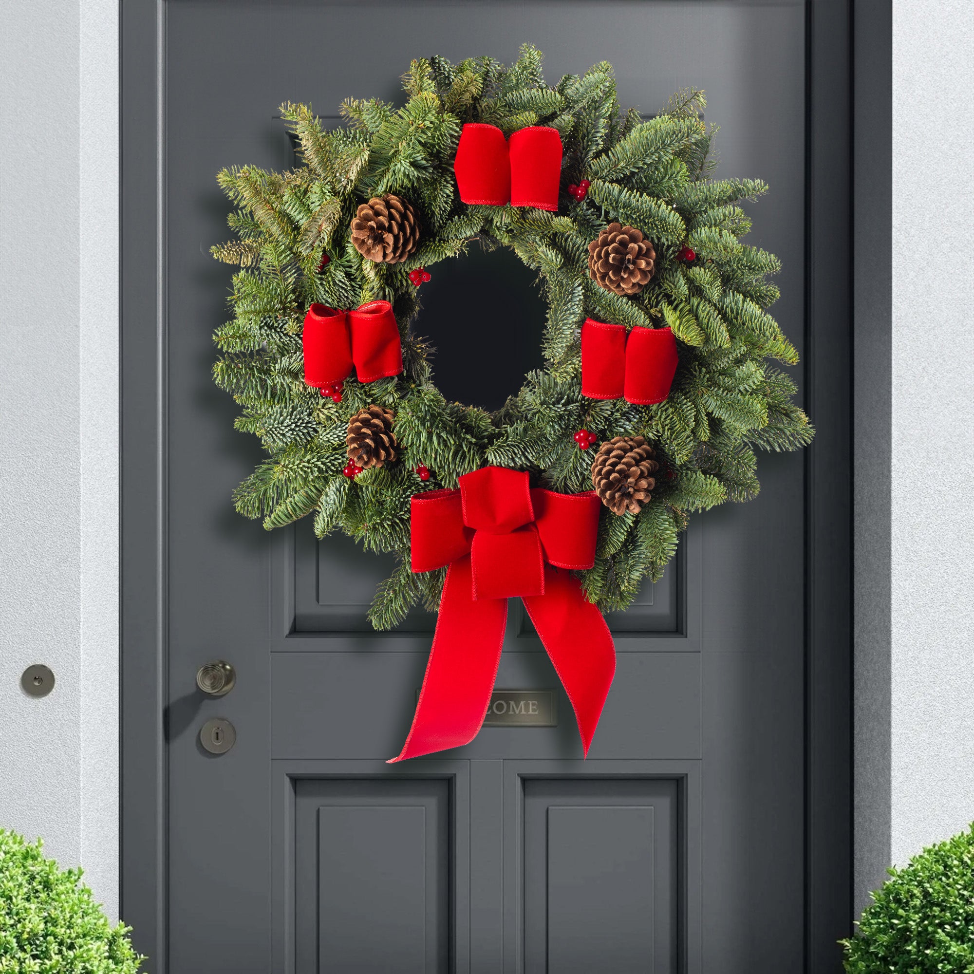 This wreath arrives adorned in red ribbons with pines cones as well as small clumps of berries and may be customised with additional decorations such as baubles and lights.