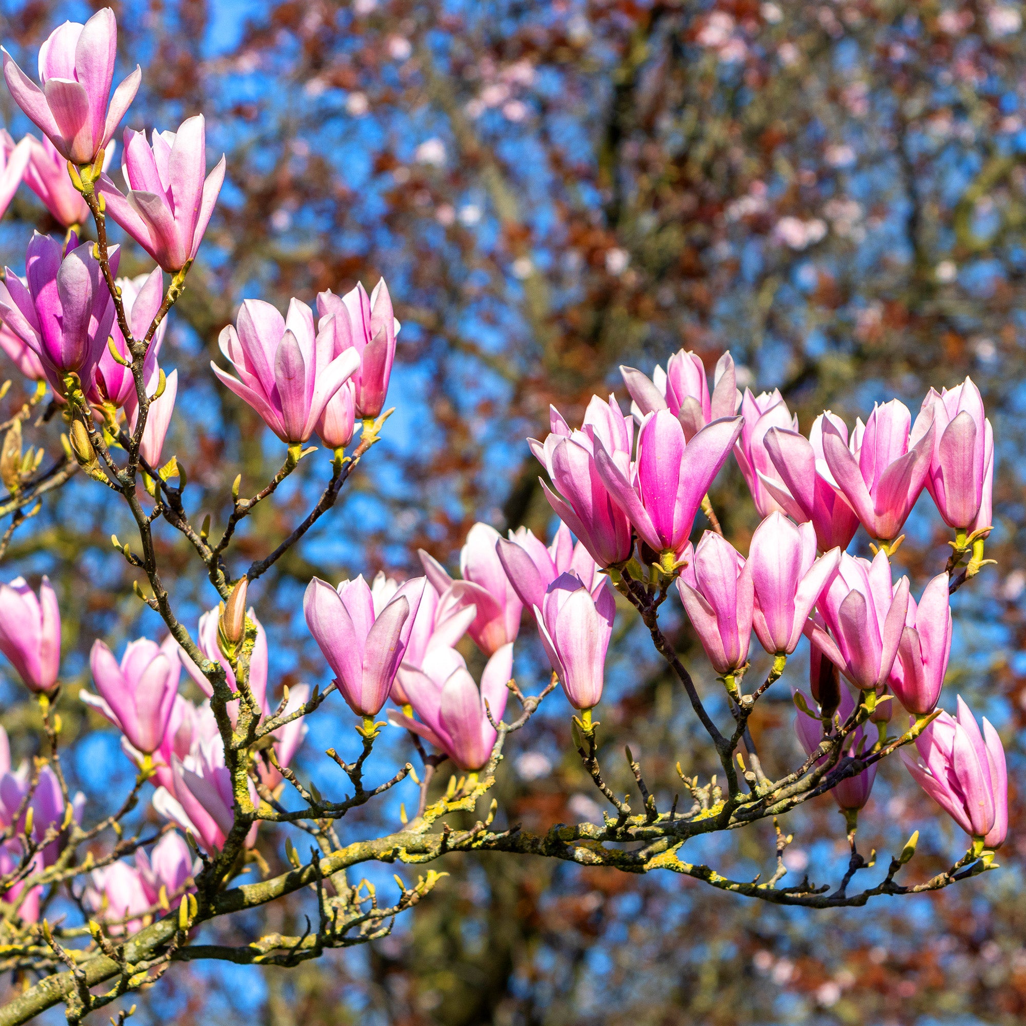 Plant Magnolias in well-draining, slightly acidic soil in a sunny or partially shaded spot. Dig a hole twice the size of the root ball, place the plant, and fill with soil. Water well after planting, and mulch to retain moisture and prevent weeds.