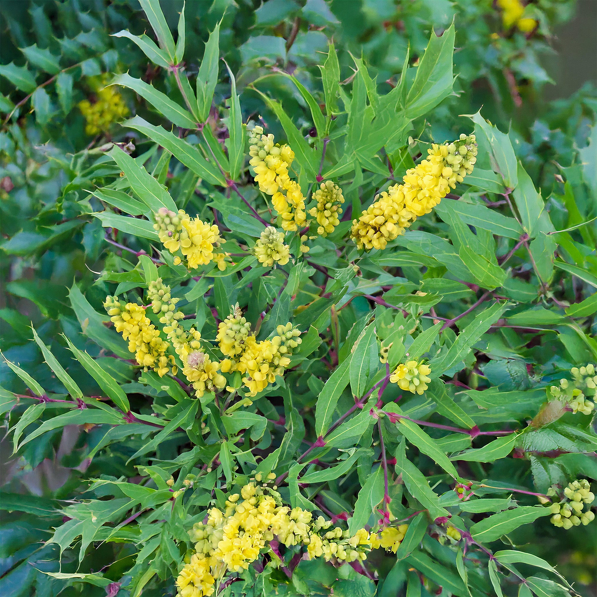 Mahonia 'Sweet Winter' is an invaluable architectural evergreen shrub, celebrated for bringing both scent and colour to the garden when little else is in bloom. Its main display consists of long, elegant sprays of fragrant, bright yellow flowers that are a vital nectar source for any active pollinators. These are held above dramatic, spiny, holly-like leaves, making it a true showpiece for structural interest.