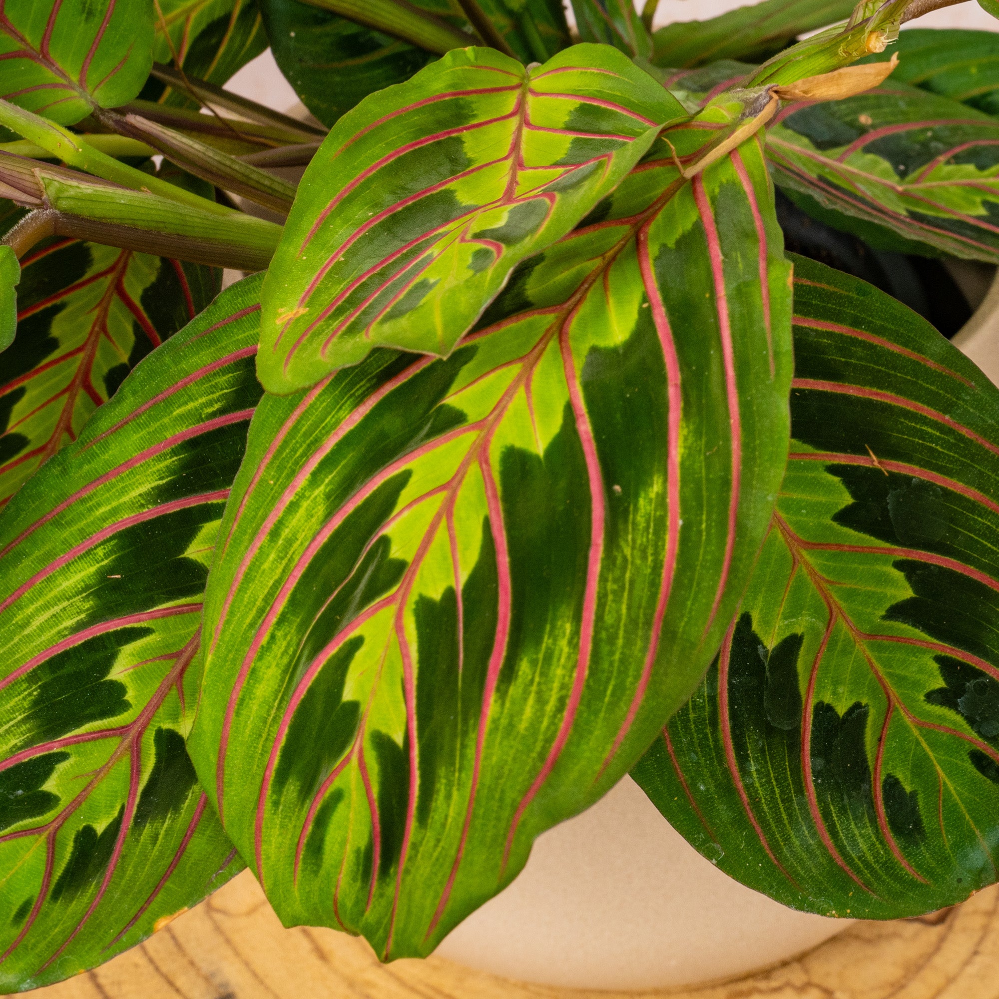 Maranta thrives in high humidity, so mist its leaves regularly or place it near a humidifier to replicate its natural tropical environment. Clean the leaves gently with a damp cloth to remove dust and allow the striking patterns to shine. Rotate the pot every couple of weeks to ensure even light exposure and promote balanced growth. With proper care, Maranta will remain a vibrant and eye-catching addition to any indoor space.
