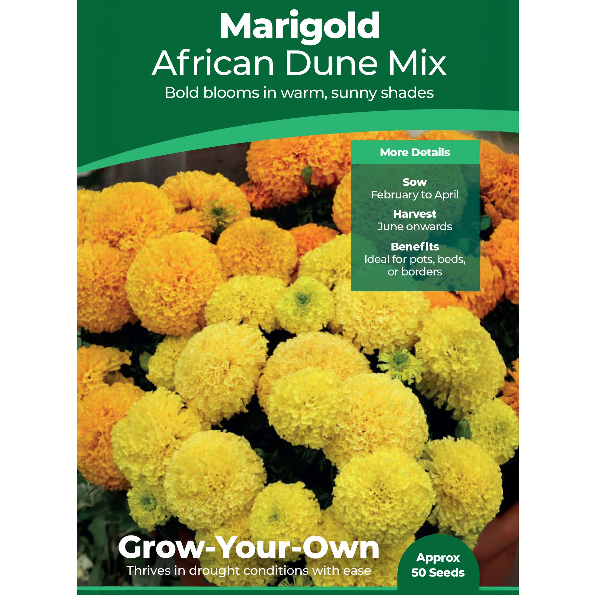 Bursting with cheerful summer colour, this African Dune Marigold variety fills beds, borders, and pots with bright shades of yellow, gold, and orange from June through to October. The double flowers are a magnet for pollinators, making them a popular choice for a bee and butterfly garden, while the unique petal formation means excess water drains away freely rather than being held in the blooms. This makes them extremely weather resistant, resulting in an extended flowering period all the way into autumn.
