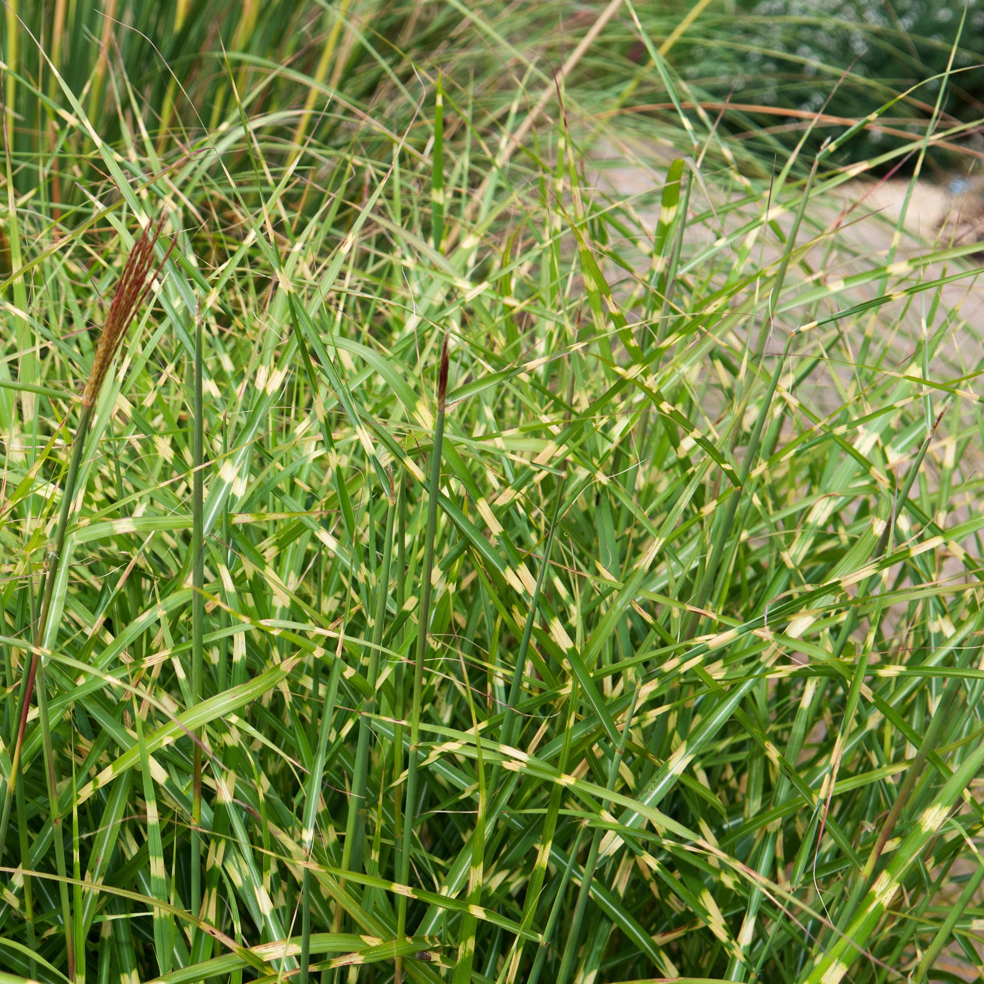 A fantastic dwarf variety of Zebra Grass, 'Little Zebra' features distinctive, bright golden-yellow horizontal bands striping across its narrow green leaves. Late in the season, it produces striking, reddish-purple flower plumes that mature to a fluffy, silvery-tan, offering excellent texture and movement in smaller gardens.