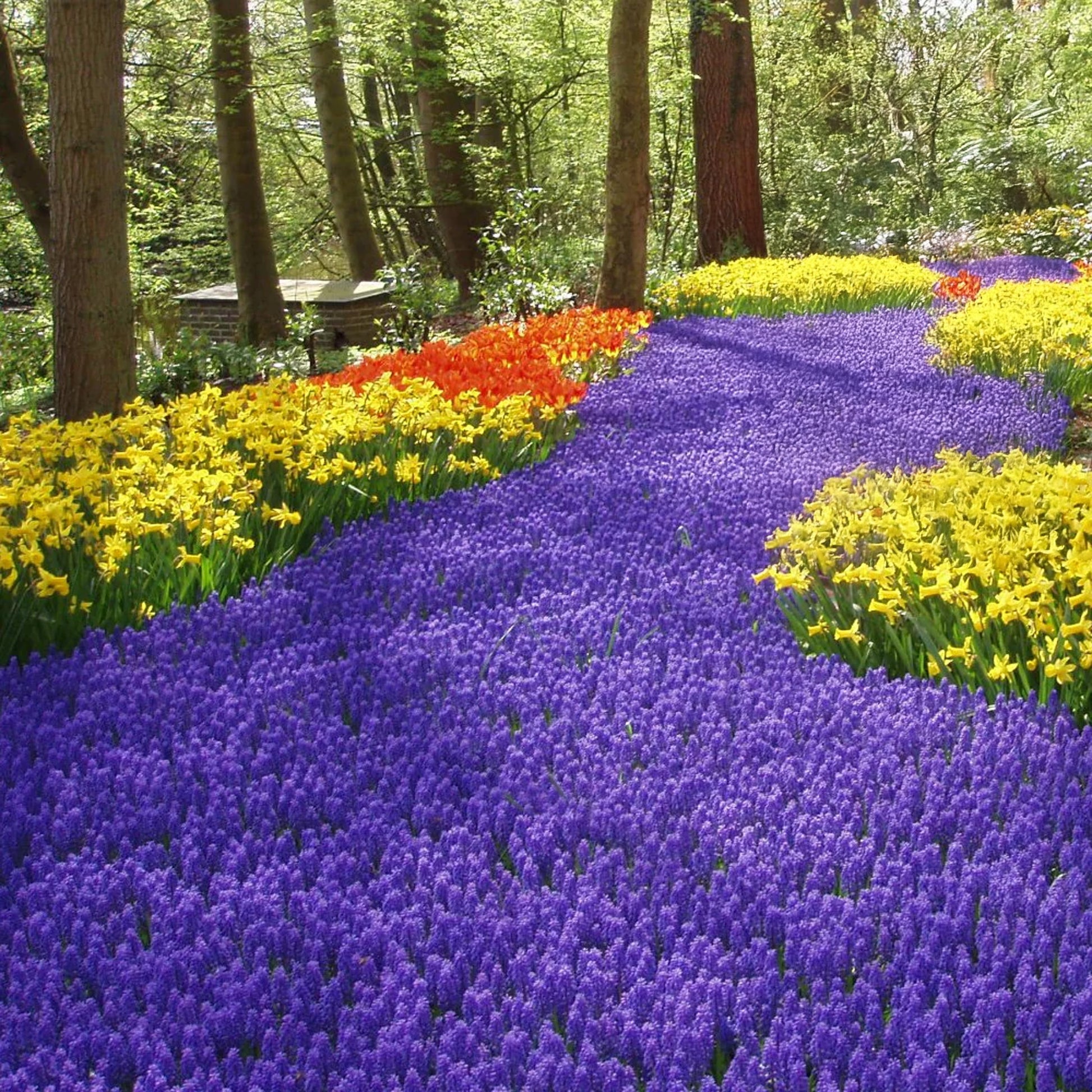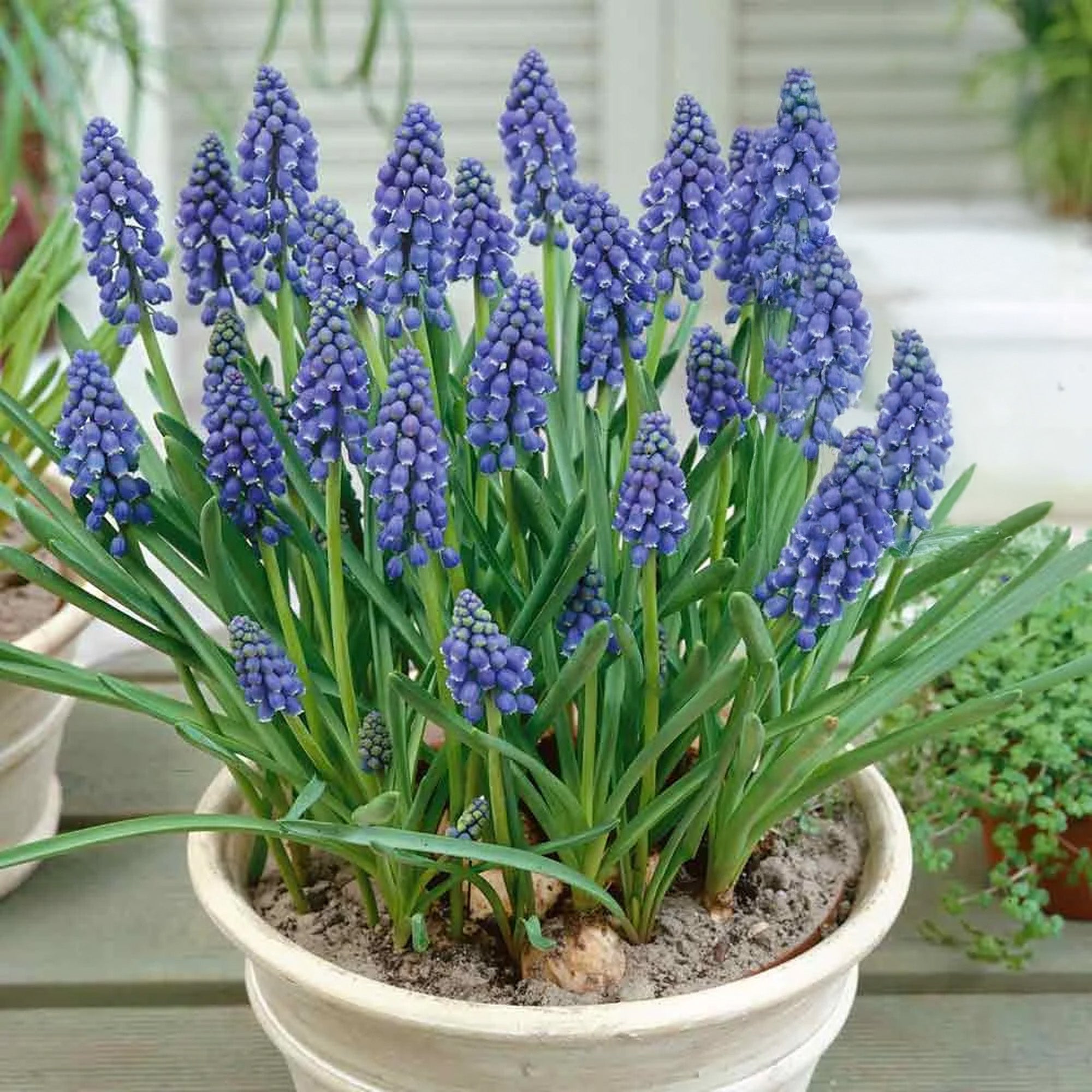 Plant Muscari bulbs in well-draining soil during autumn. Choose a sunny or partially shaded spot, and plant bulbs 5-8cm deep with the pointed side up, spacing them 5cm apart. Cover with soil, press gently, and water thoroughly to settle the soil.