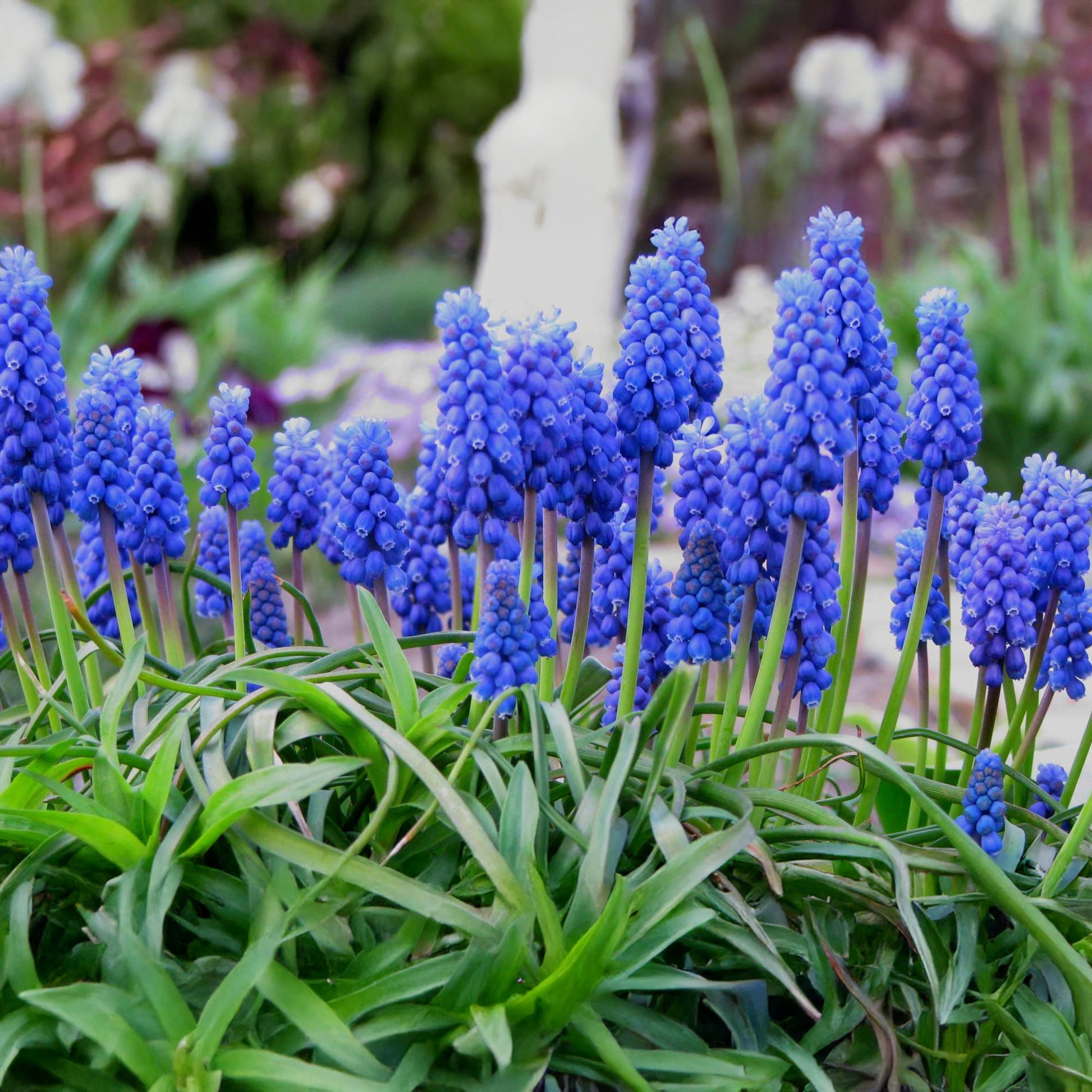 Plant Muscari bulbs in clusters for a dense, vibrant display, and leave foliage to die back naturally for better blooms next year.