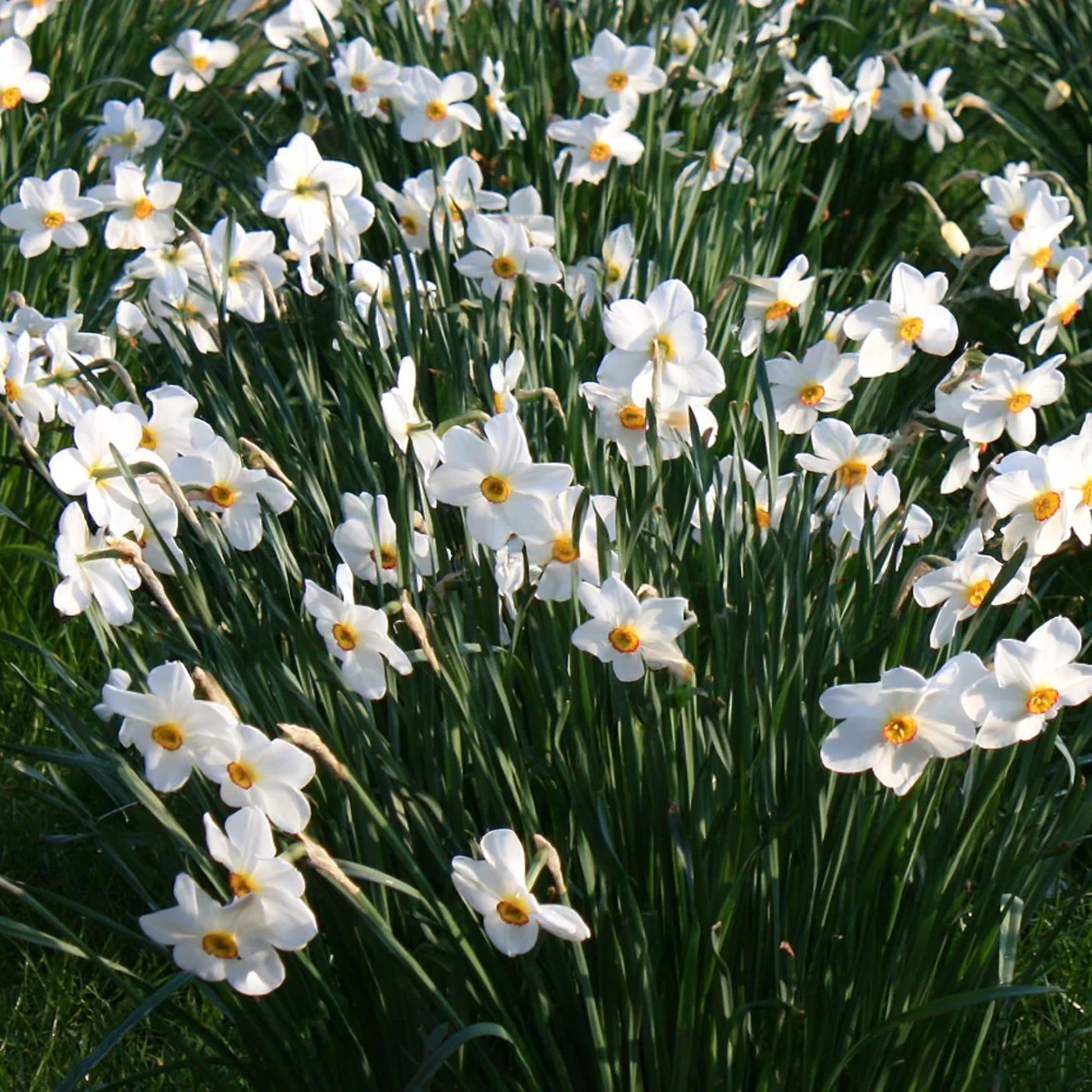 Plant narcissus bulbs from September to November in full sun or partial shade with moderately fertile, moist but well-draining soil. Dig holes around 5-10cm apart and plant one bulb in each hole at a depth 3 times the height of the bulb. Ensure the pointed end faces upwards then backfill with soil and compost, firm down, and water in well.