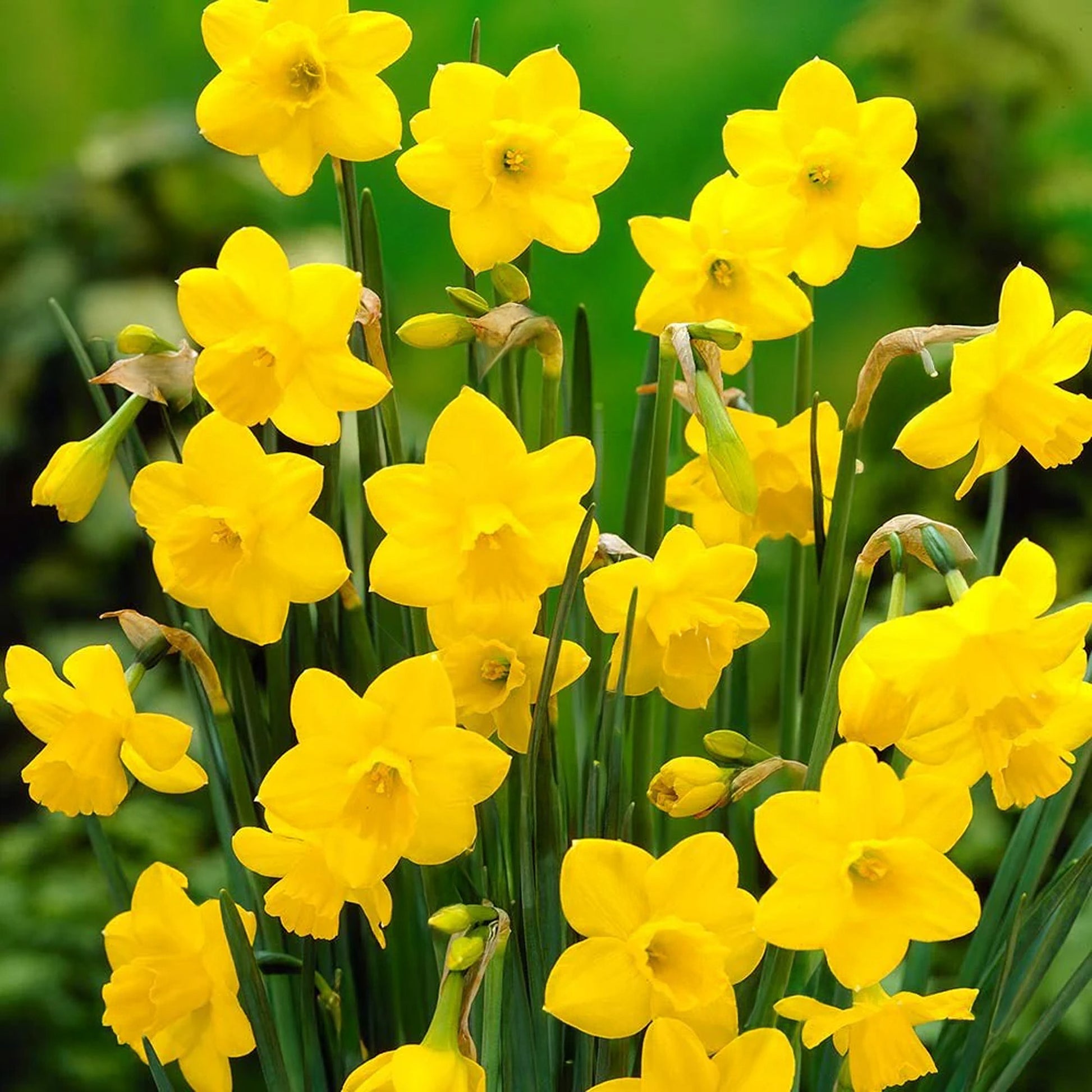 Quail is a division 7, Jonquilla Daffodil with elongated coronas that match in colour to the golden yellow petals. The scented blooms develop in groups of 2-4 per stem and gently overlap.