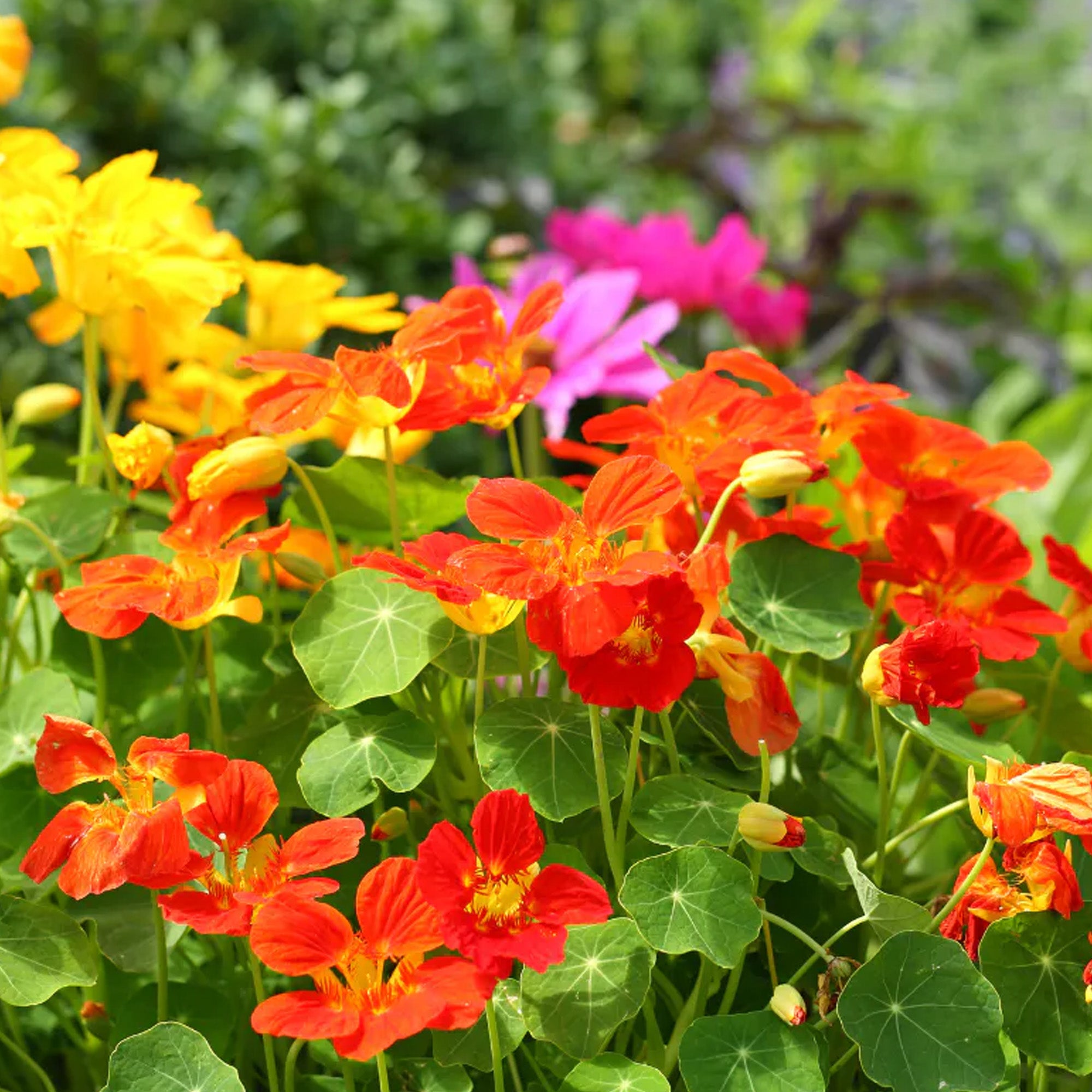 Nasturtiums attract pollinators, making them great for companion planting. Deadhead faded blooms to extend flowering and keep the plant looking tidy. They’ll continue to thrive with just occasional care and regular sun exposure.