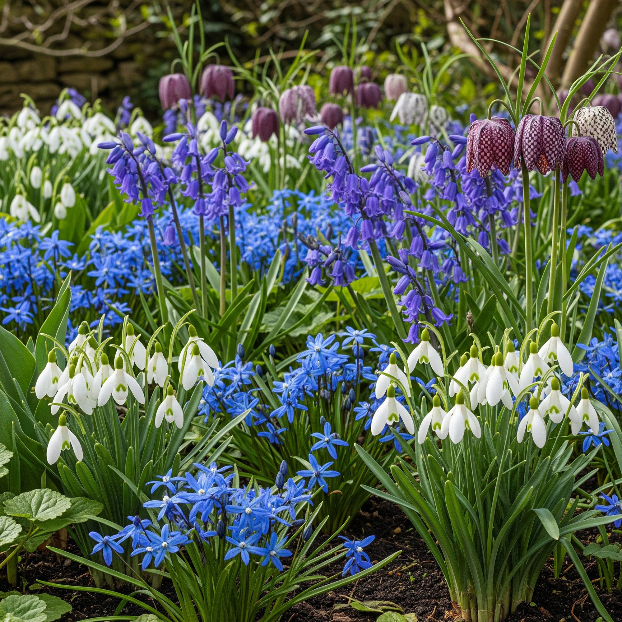 Bulbs Included:, 40 × Snowdrops (Galanthus nivalis), 25 × Siberian Squill (Scilla siberica), 20 × Snake’s Head Fritillary (Fritillaria meleagris), 15 × English Bluebells (Hyacinthoides non-scripta)