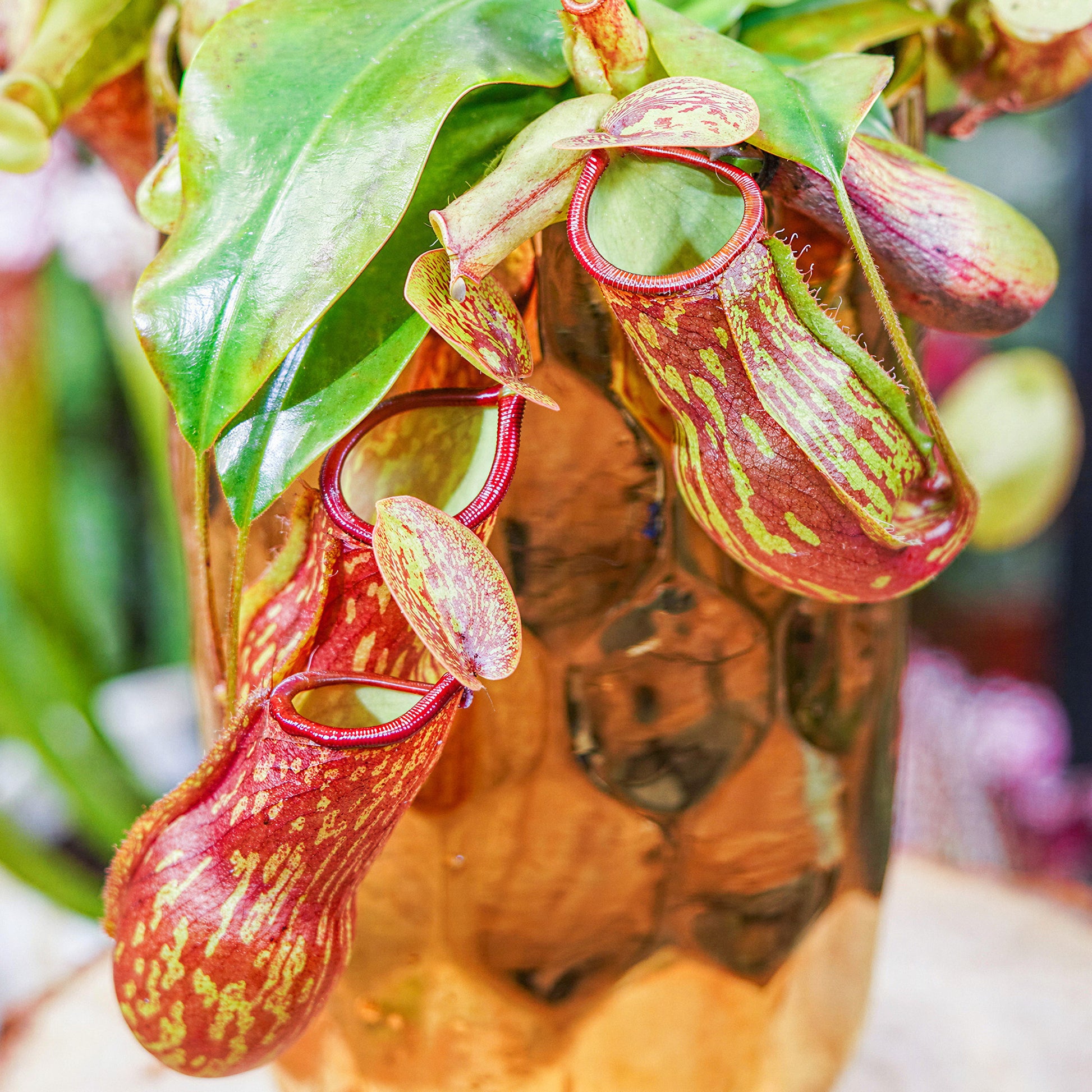 Caring for the Monkey Jars Pitcher Plant is refreshingly simple. It thrives in bright, indirect light, with soil kept consistently moist using rainwater or distilled water. Occasional misting helps maintain the humidity it enjoys, while trimming away old pitchers encourages fresh growth. With straightforward care, this plant will flourish year round, combining exotic looks with natural pest control.