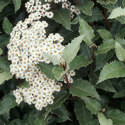 New Zealand Holly or Olearia “Macrodonta” is an evergreen shrub with very unique foliage. Its leaves are ovate in shape and have jagged, toothed edging. Also, the leaves are quite thick and leathery with the topside of the leaf being a dark green colour that contrasts with the underside which has felt-like texture and is of a grey to white colour.
