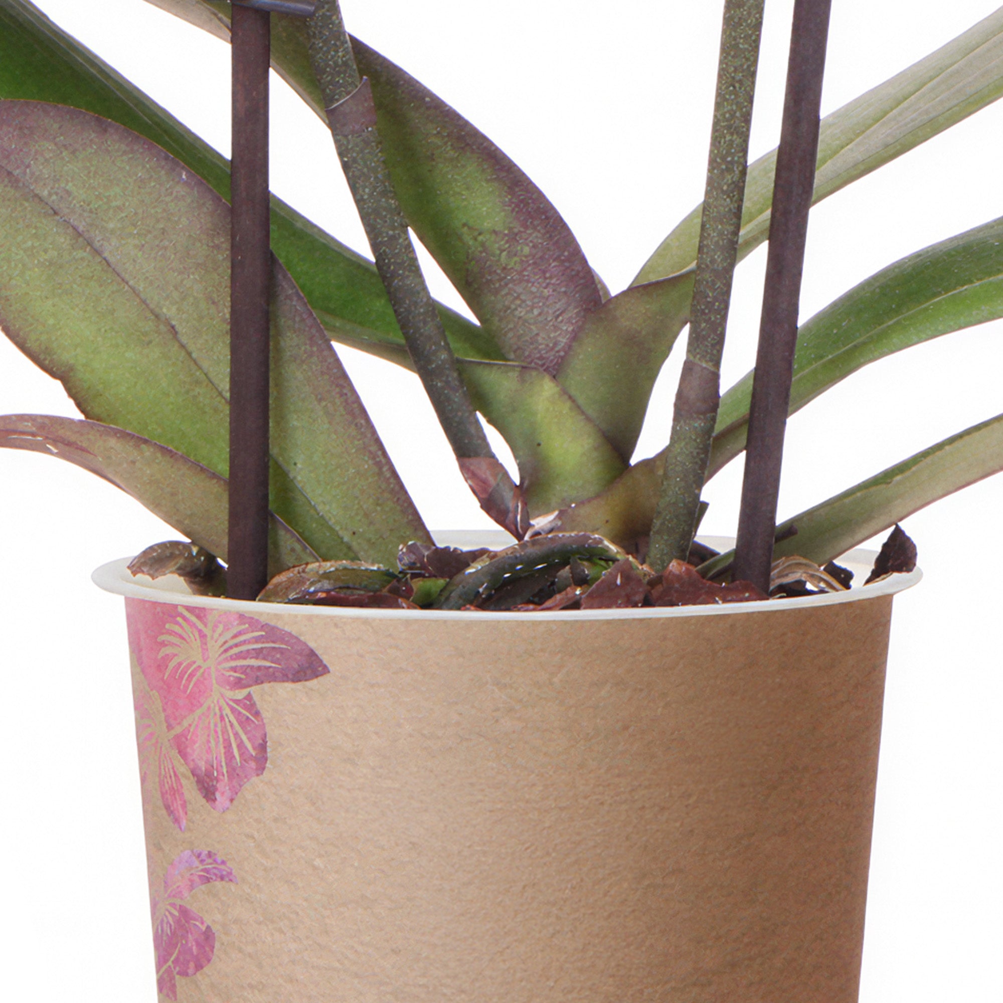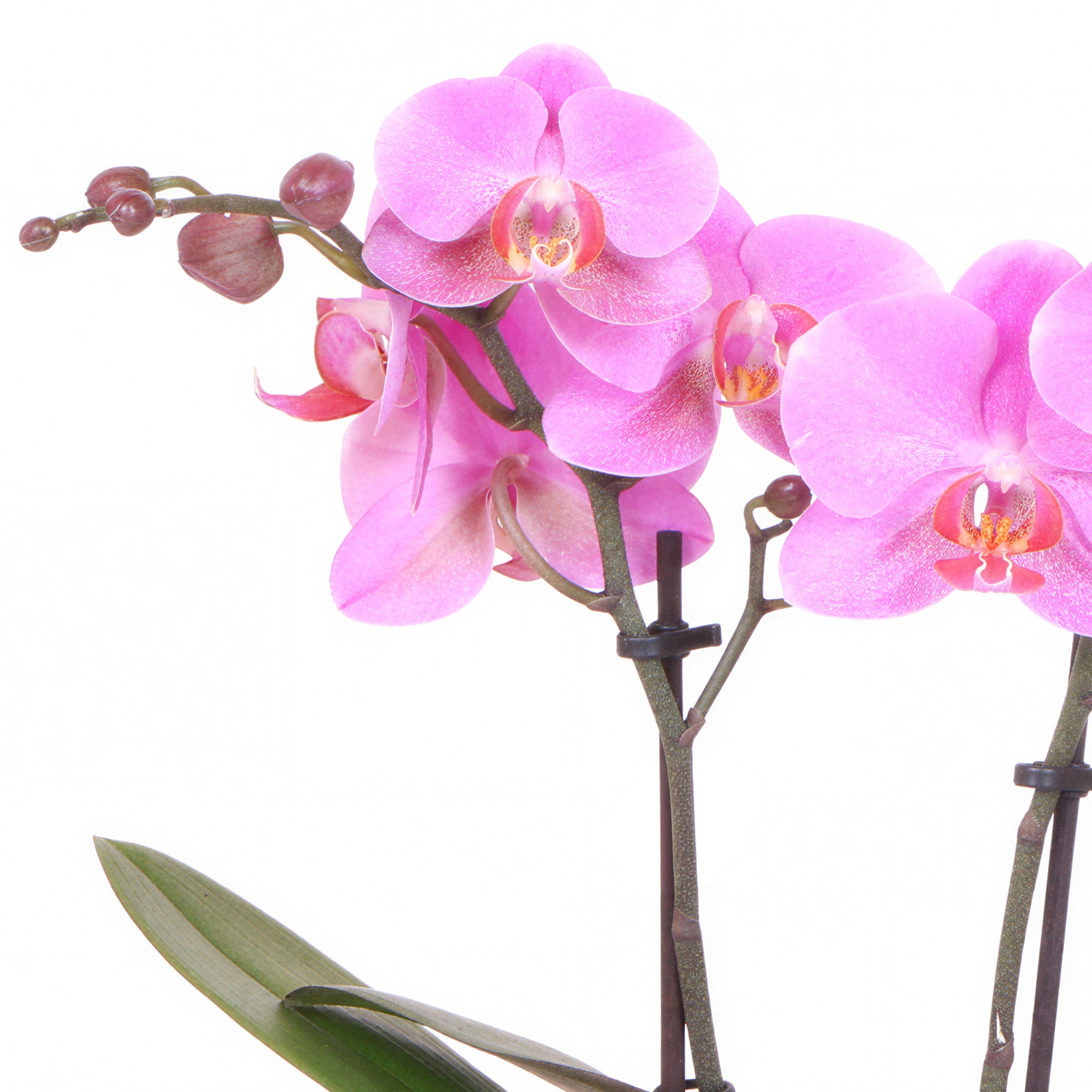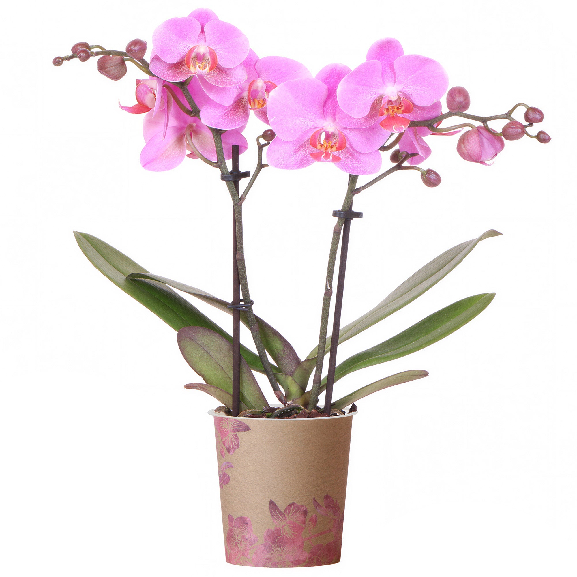 Orchid Phalaenopsis 'Frederikstad', a charming variety of Moth Orchid, is a delightful plant for the home. It grows with large, glossy green leaves at the base, supporting elegant stems of beautiful flowers. This plant can bloom at any time of year, and the flowers endure for up to three months, adding a lasting floral touch to your environment.