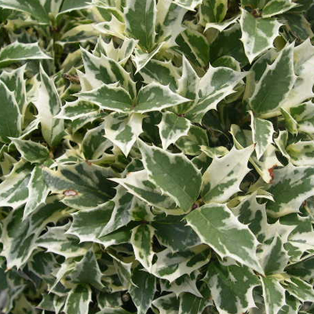 āVariegatusā or holly olive is a broadleafed evergreen with shiny, dark green leaves. These leaves have spiky teeth and fantastic modern art-like combinations of creamy whites and dark greens mixed together on its leaves, though the white tends towards the fringes.