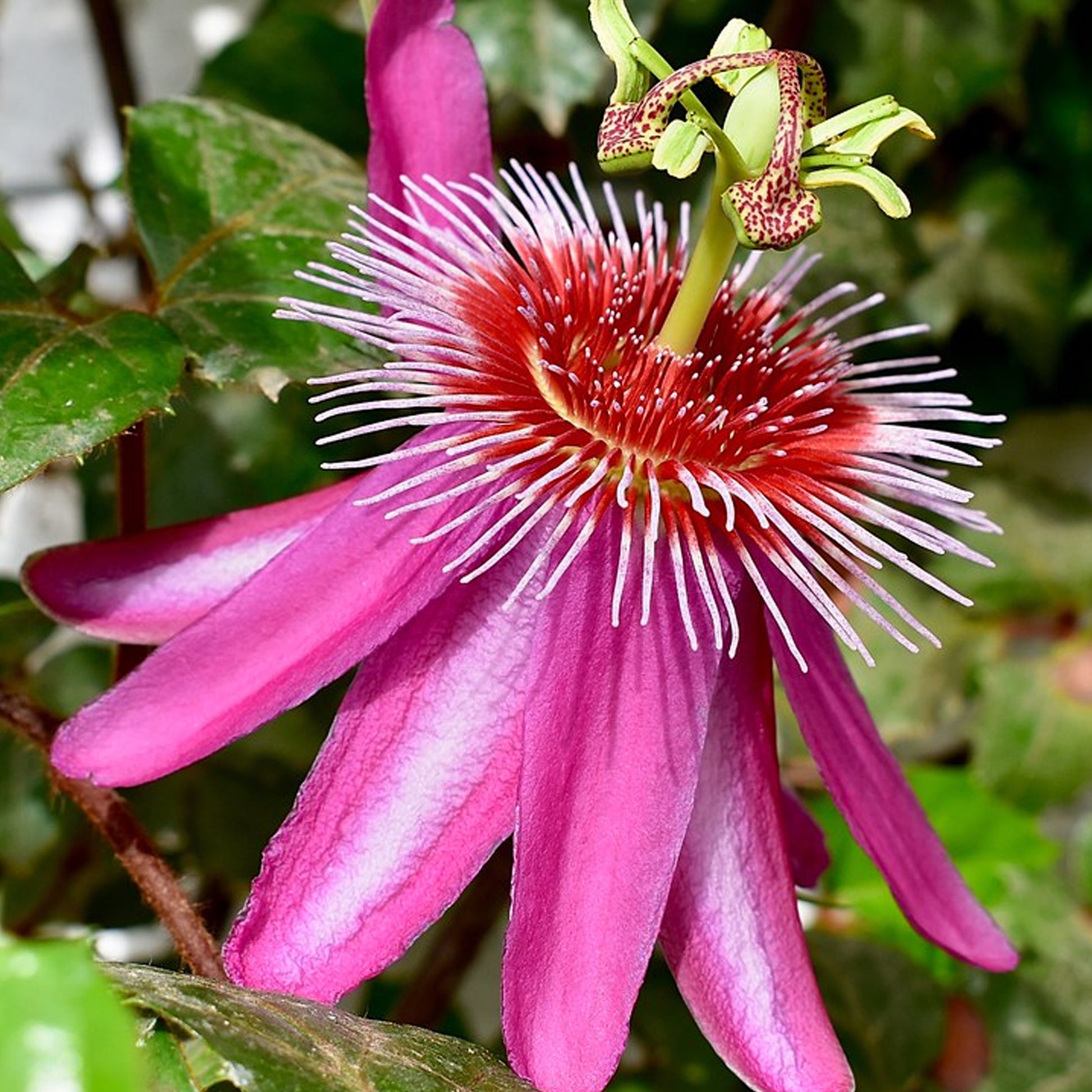 This attractive looking Passiflora hybrid, Anastasia, bears unique, vibrantly pink flowers adorned by a deep red corona with slender, white-tipped terminals. Acting as a direct contrast, the dark green foliage makes the gorgeous red hues stand out.