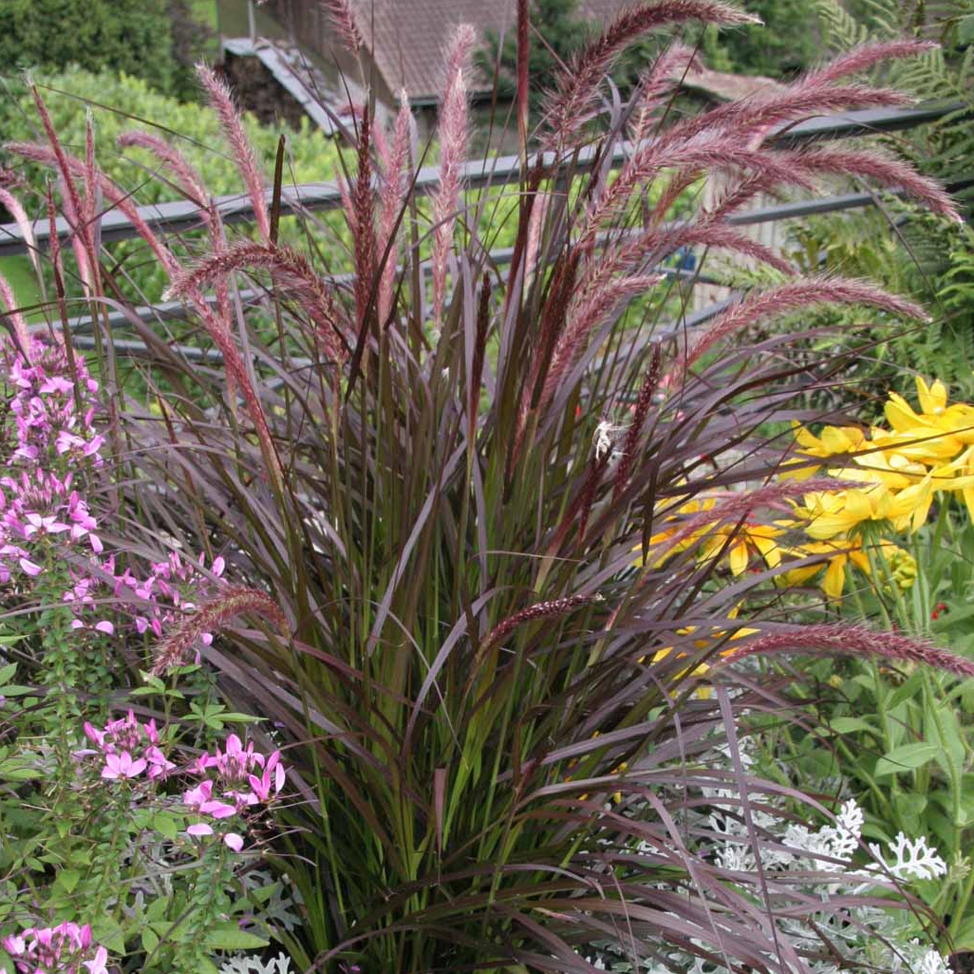 This stunning hybrid grass requires very little care and provides lovely colour to every garden. The dark red foliage emerges in spring, followed by the silvery-red bottlebrush shaped flowers in late summer to Autumn. The grass plant is not very hardy and requires shelter. It grows best in containers or in small gardens.