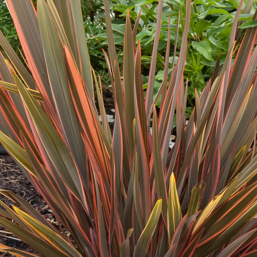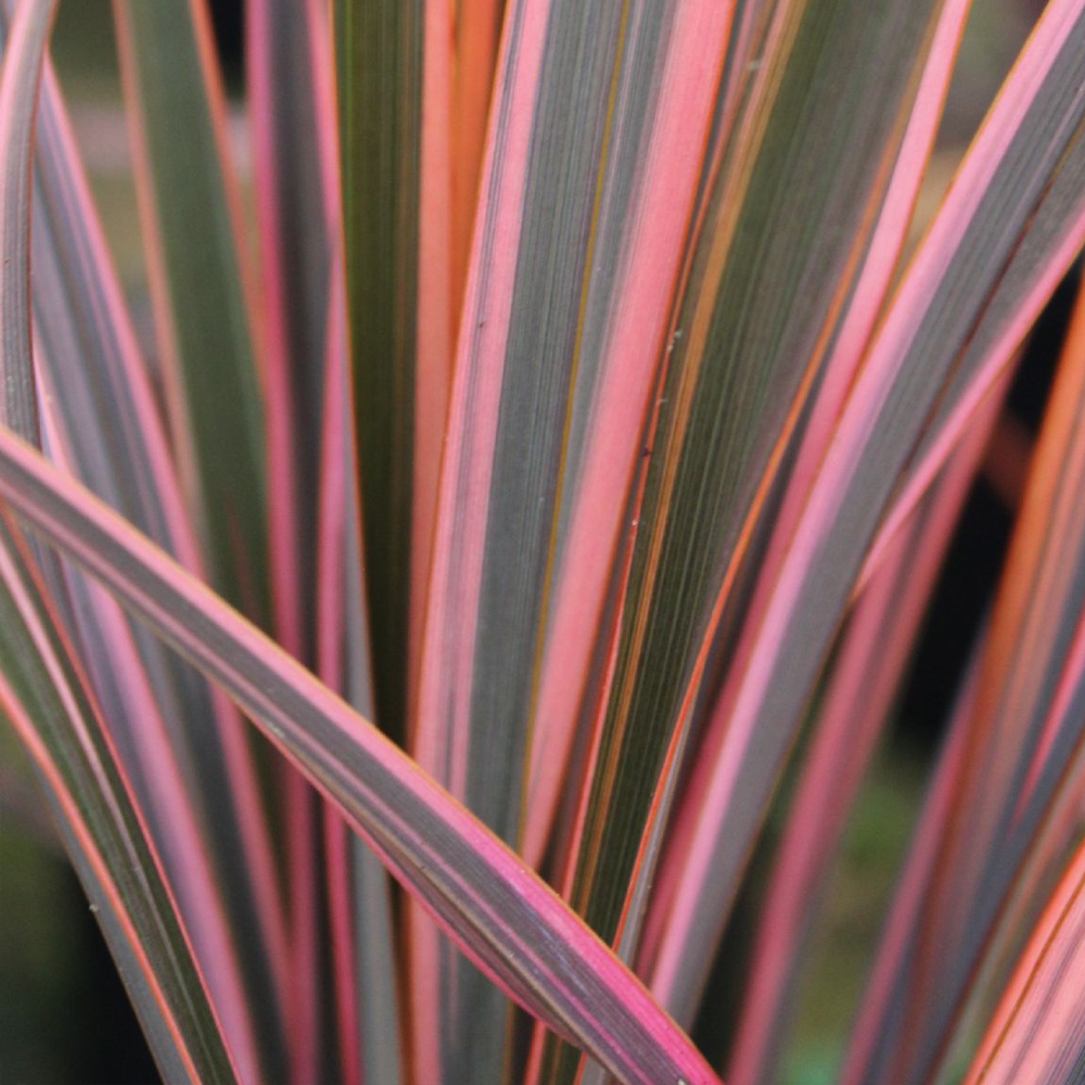 Phormium 'Sundowner' is a compact evergreen perennial shrub. The foliage of the variety develops characteristically long sword-like leaves which are predominantly green but develop bronze stripes that are sometimes interspersed with pink and red edges, giving this plant a lovely multicoloured effect. Flowers occasionally accompany the foliage of this plant, although they are rarely seen, so if your plant sprouts yellow flowers during the spring then you are very priveliged. This plant prefers well-drained soil and fully-sunny positions in the garden, but can tolerate partially shaded areas also.