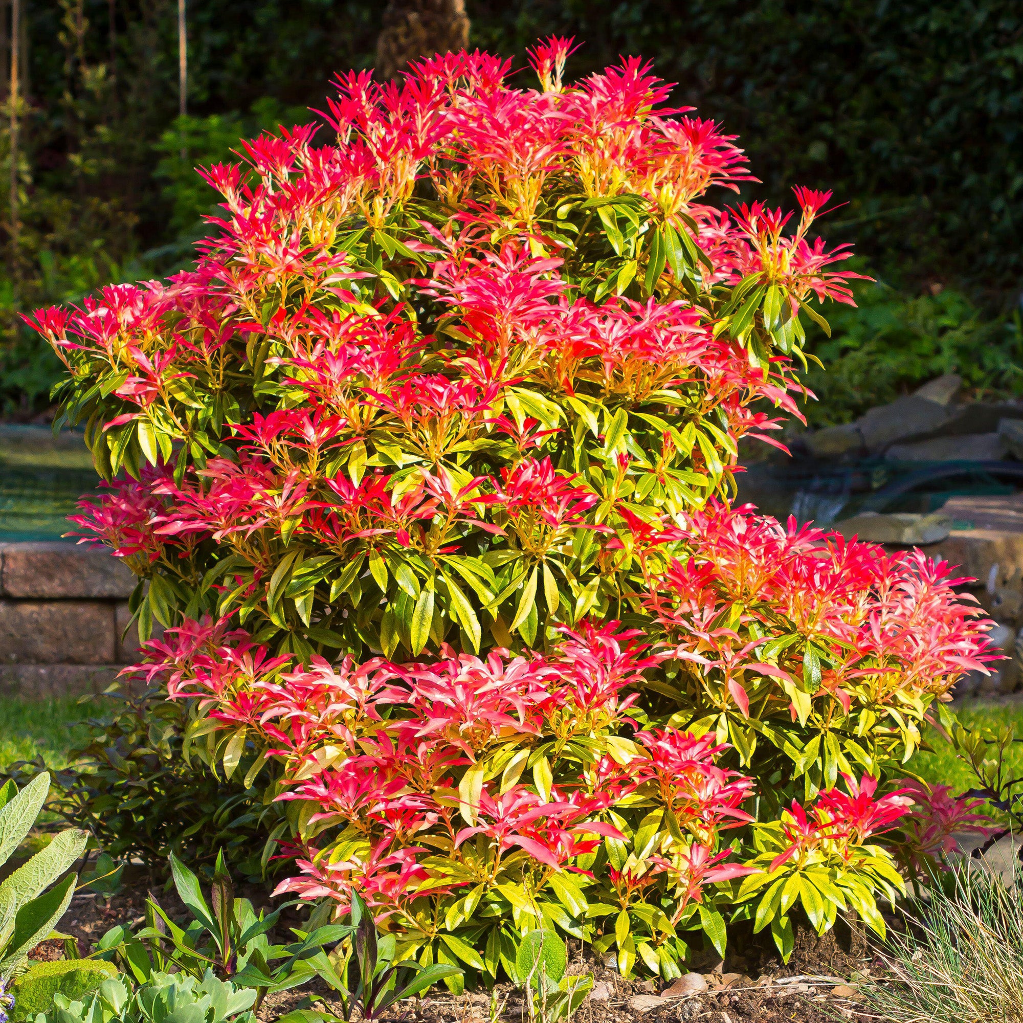 This Pieris Mountain Fire shrub is renowned for its bright red foliage when the leaves are young. They then take on a coppery-green colour, before turning fully dark green. The striking evergreen Pieris shrub's foliage is accompanied by gorgeous creamy-white flowers when they bloom in Spring. It will perform well throughout the seasons as it is evergreen, meaning your flower beds, pots, containers and more will gain a beautiful plant for all seasons.