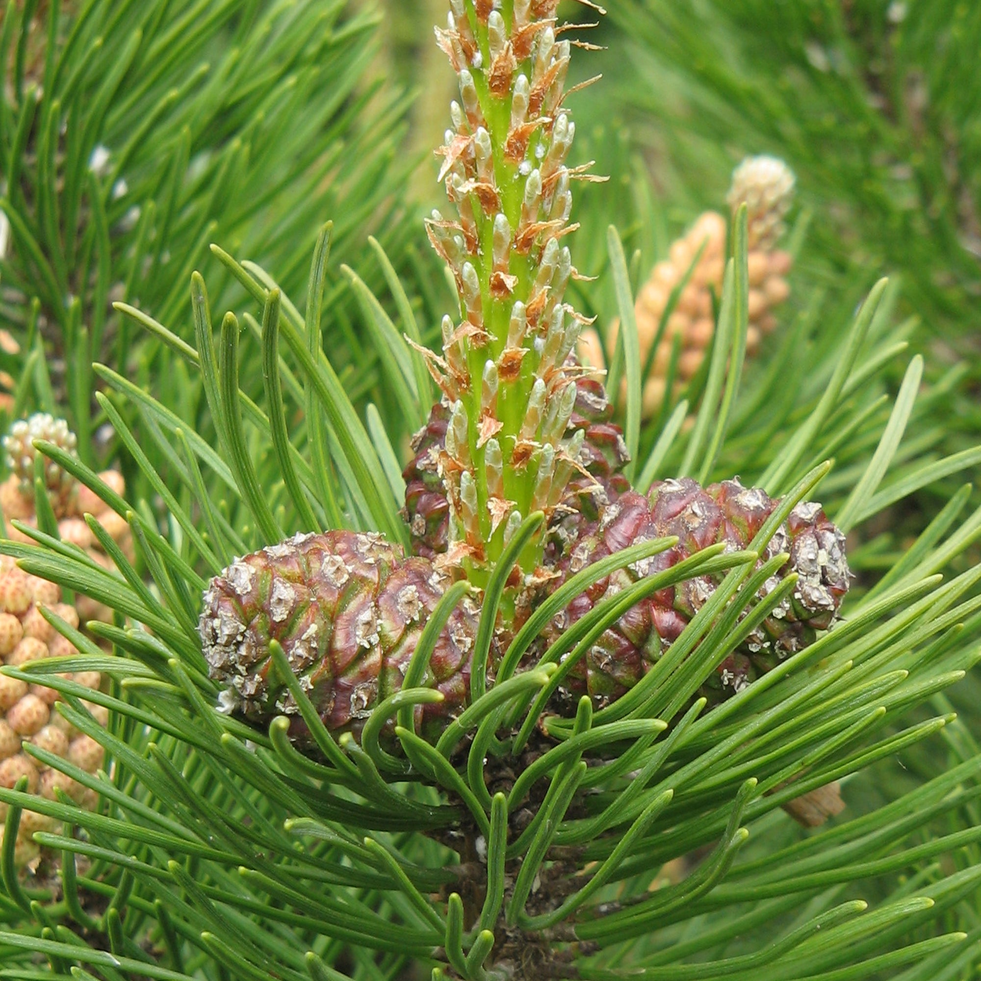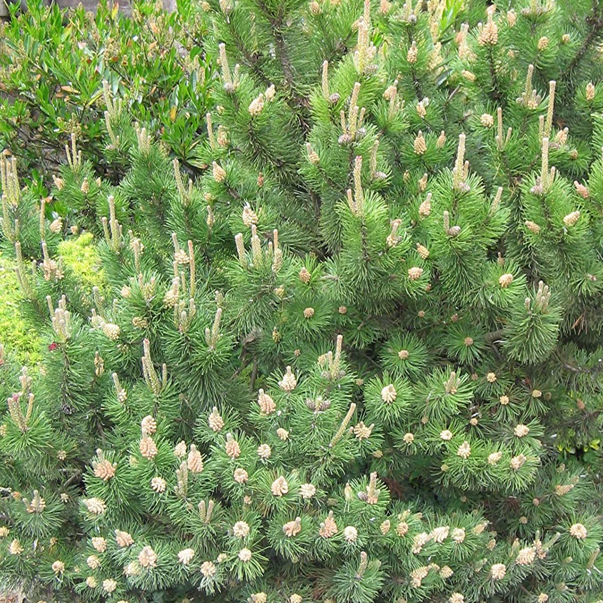 Pinus ‘Mughus’, or Mountain Pine is a very hardy dwarf variety of conifer with compact, slower growth and an upright, spreading habit. The dense, dark green needle-like foliage appears on structured, upright branches. A good option for rockeries and Japanese style gardens with its natural symmetry, shape and low growth.