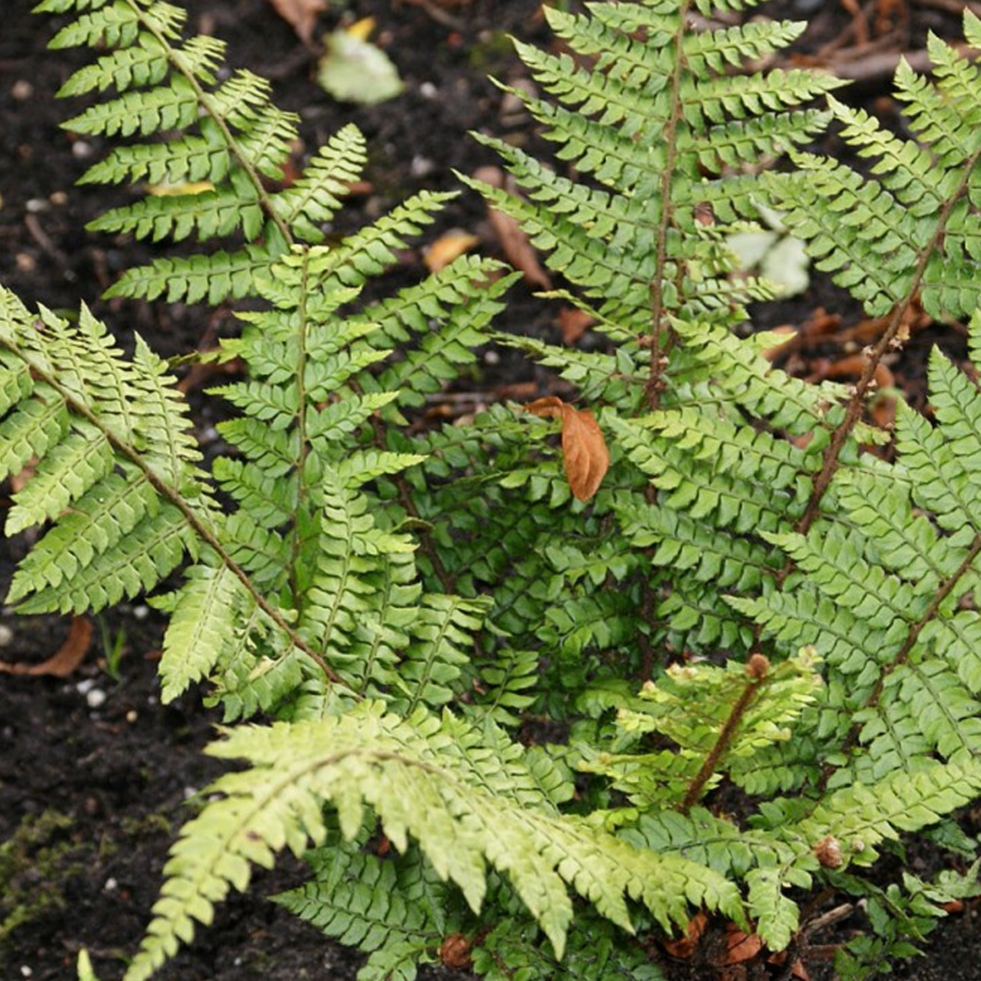 An evergreen, clump-forming, hardy fern, commonly known as Makinoi's shield fern. Polystichum makinoi plants produce a rosette of olive green fronds with brown stems and midribs.