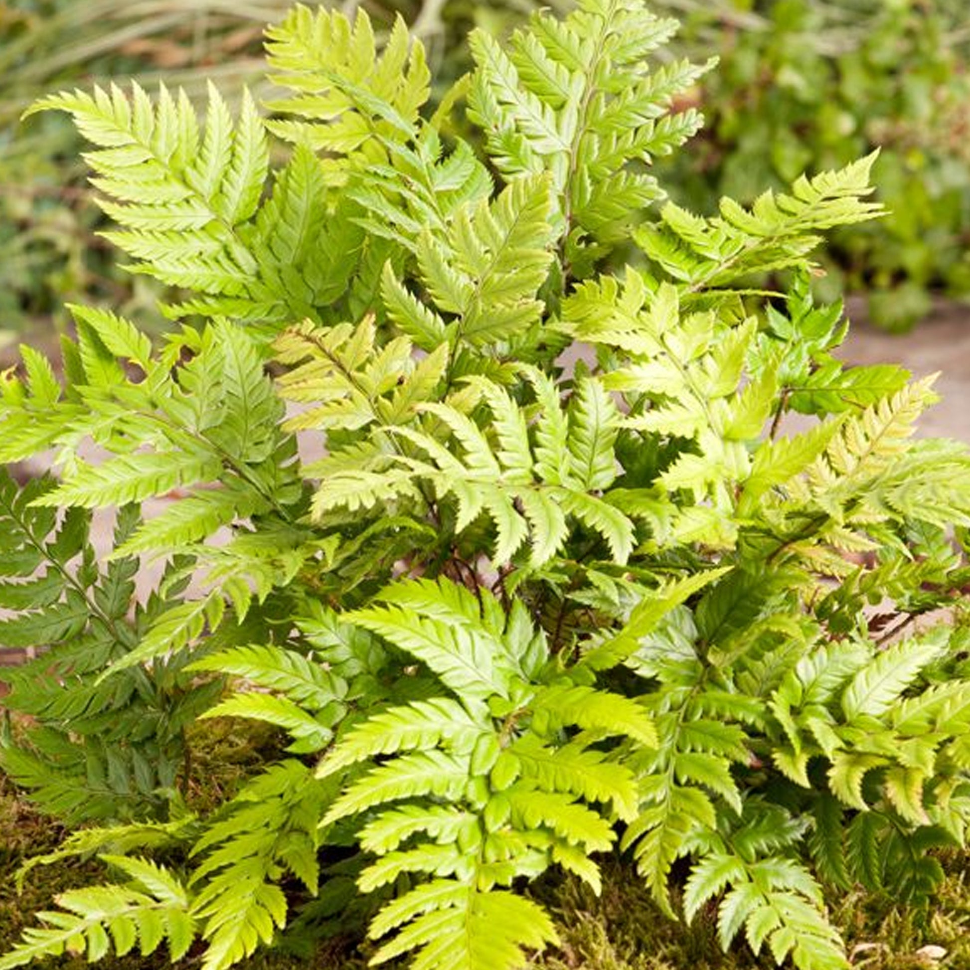 A compact and slow growing variety of evergreen fern, the Polystichum rigens or ‘Rigid Holly Fern’ is an interesting plant with a mound-forming habit and arching, triangular, bipinnate, mid-green frond with a rough, slightly leathery texture and stiff, pointed tips which sometimes fade in colour slightly under the sun. An easy to grow plant that is suitable for pot or patio growing or as part of small rockery displays. Also works well as a woodland groundcover at the base of trees.
