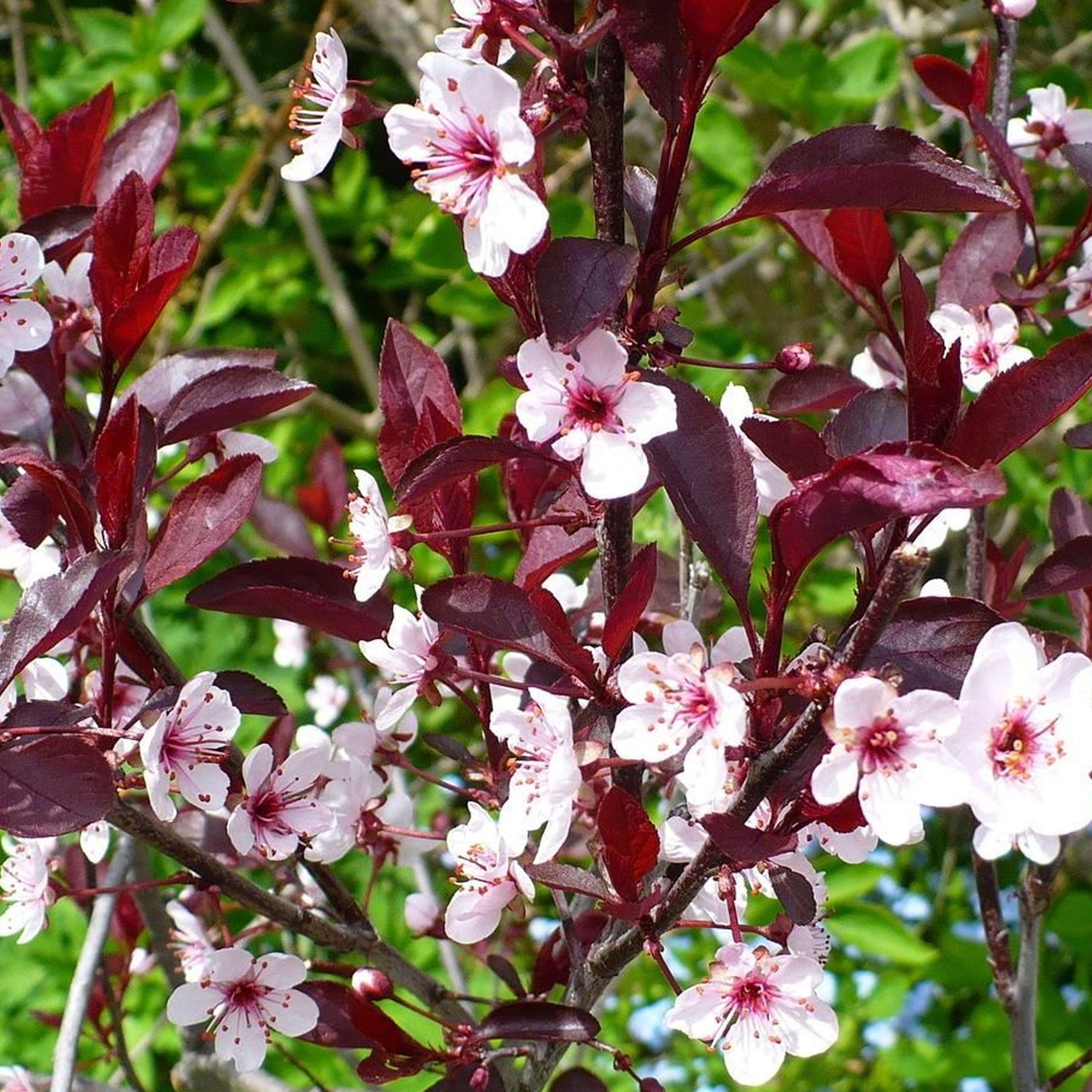 Prunus Cistena are deciduous ornamental trees with colourful foliage and attractive flower blooms that develop in spring. New foliage appears in a shimmering purple colour. In autumn, the leaves offers a striking display of fiery orange and bronze, before they fall towards winter. In winter and in regions that get really cold, any snowfall enhances the tree making the branches look stunning, iced in white. The flowering cherry tree offers a wonderful eye-catching display of double petal deep pink flowers in spring, April to May, clustering on the branches.