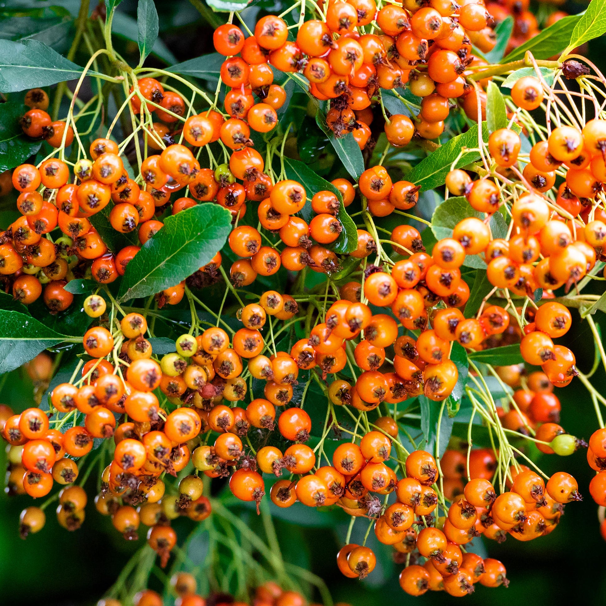 Pyracantha 'Saphyr Orange' is a modern cultivar of Firethorn, specifically bred for superior health and garden performance. Its most important attribute is its excellent resistance to common diseases like fireblight and scab, which ensures the plant remains healthy and produces a reliable display year after year. The result of this vigour is a truly spectacular show of countless, brilliant orange berries that smother the branches in dense clusters. This fiery display is held against a backdrop of dark green evergreen foliage.