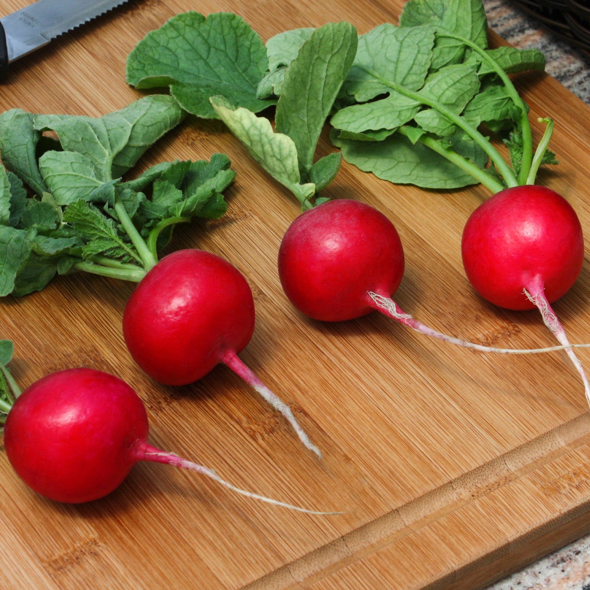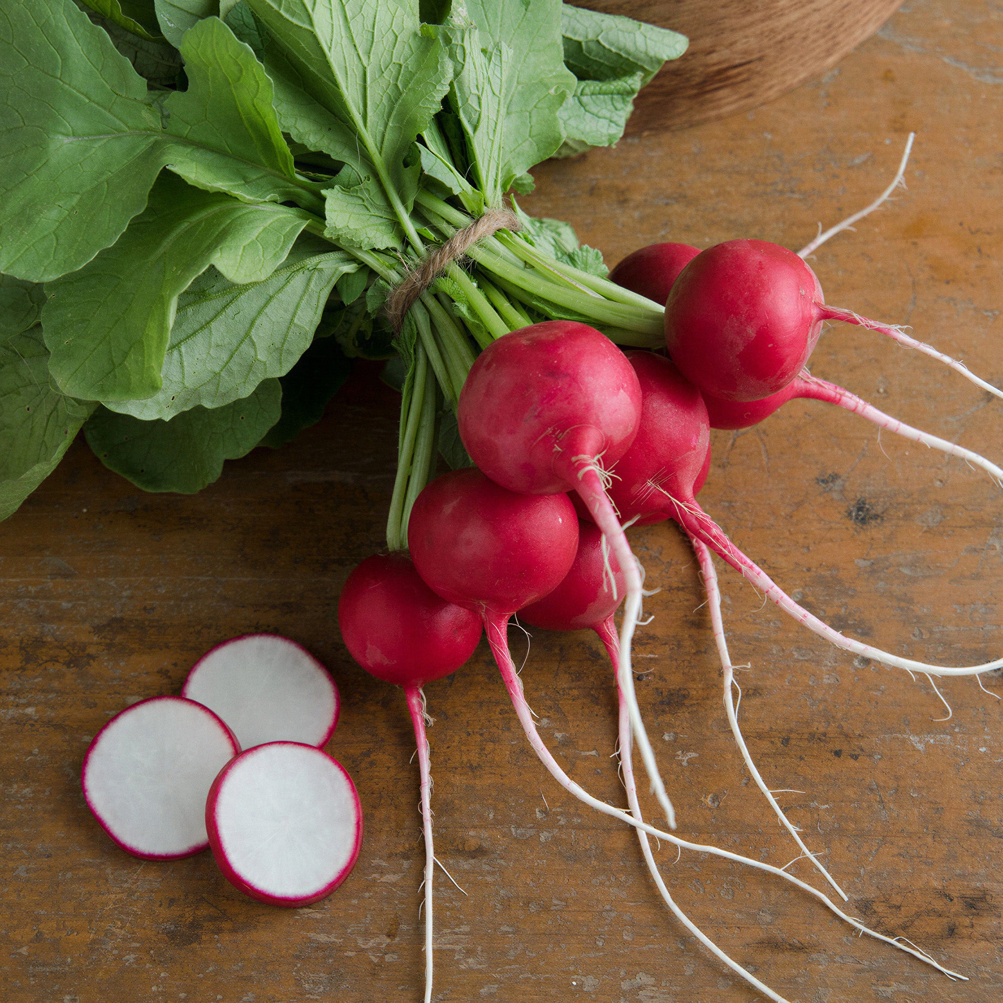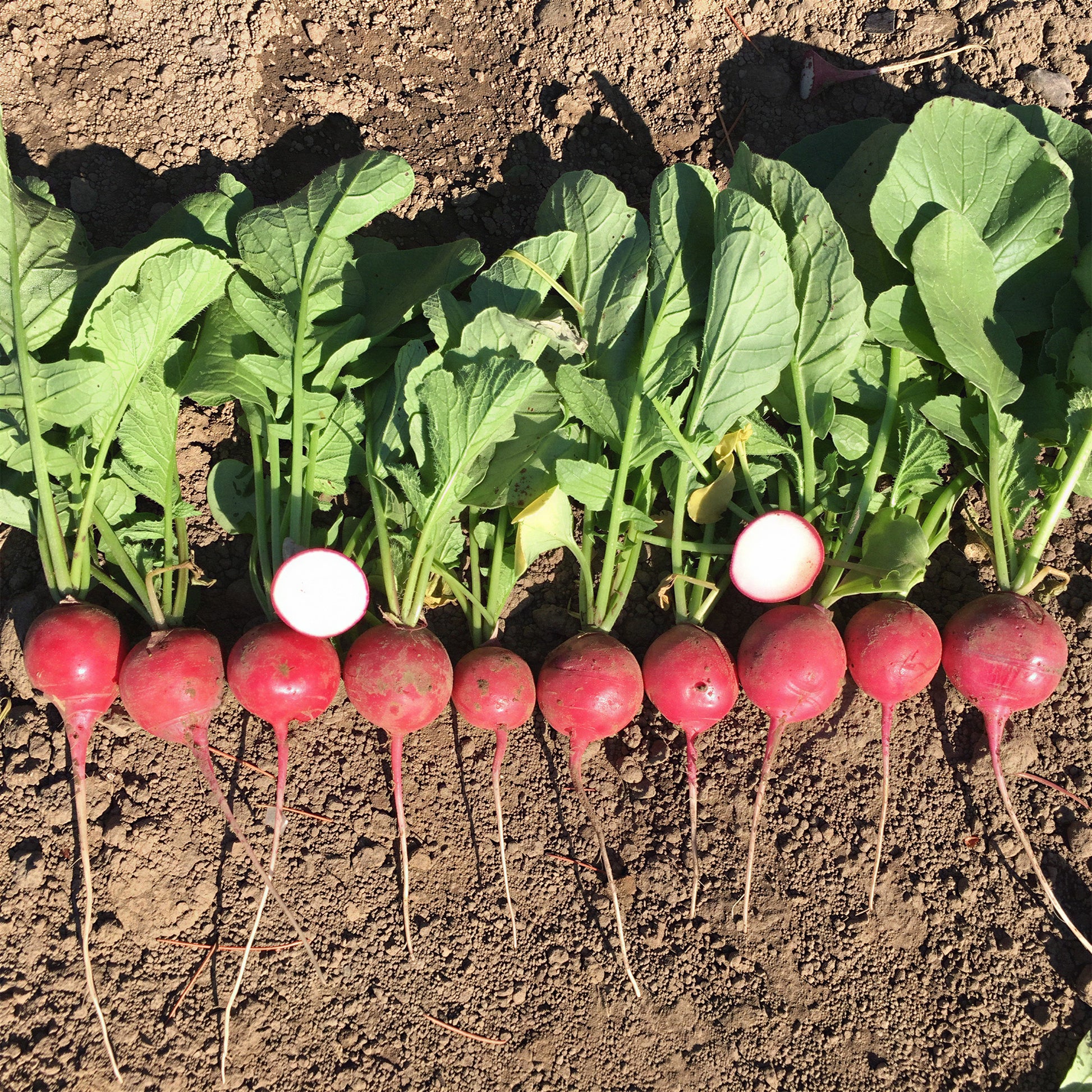 Sow seeds directly into well-drained soil from March to September in a sunny or lightly shaded spot. Make the drills shallow, around 1.5cm deep, and leave around 30cm between rows. Keep the soil moist and thin seedlings to prevent overcrowding, which helps roots develop evenly. Harvest from April to October, around 4 weeks after sowing, when the Radishes reach about 2–3cm across, for the best texture and taste.