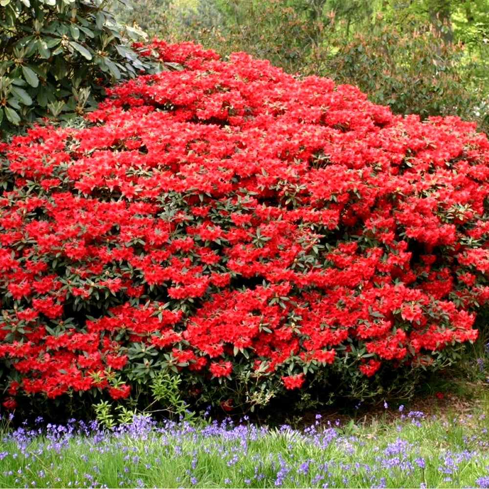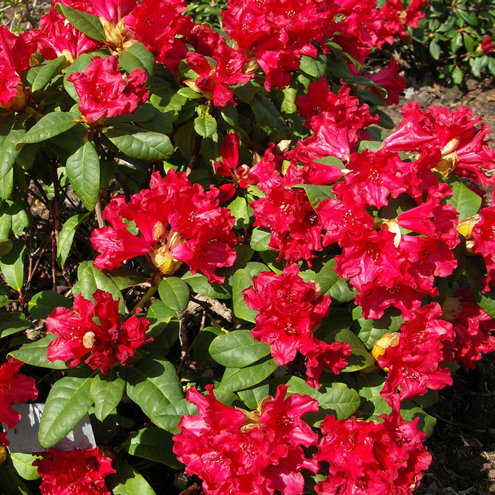 “Baden Baden” is a Rhododendron varietal that is compact and in the right acidic conditions, produces multitudes of vibrant, scarlet-red and small to medium-sized flowers. The flowers grow on trusses in groups of 3 to 5.
