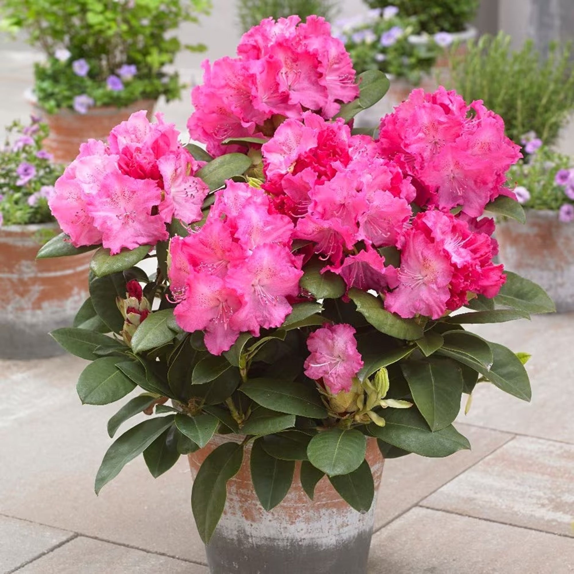 Rhododendron Germania is an evergreen shrub with green foliage surrounding an array of hot pink, bell-shaped flowers. They will bloom from Spring into Summer, whilst the plants leaves provides year-round interest wherever you choose to place it. The vibrant nature of each flower allows it to be an eye-catching variety to make a noticeable impact in borders, pots, containers or sitting pride of place amongst a patio or porch display.