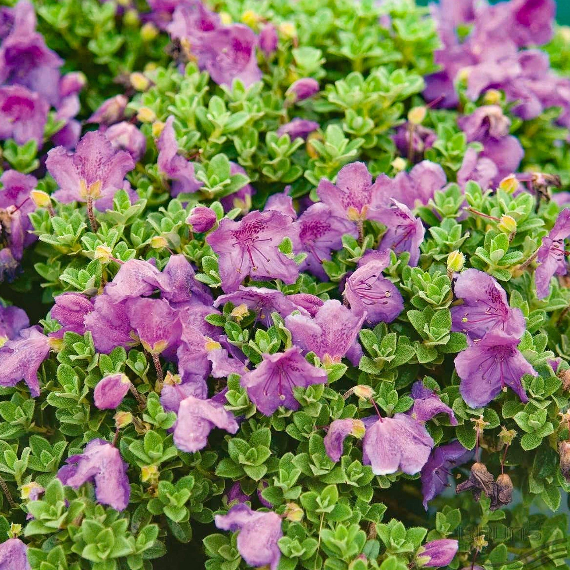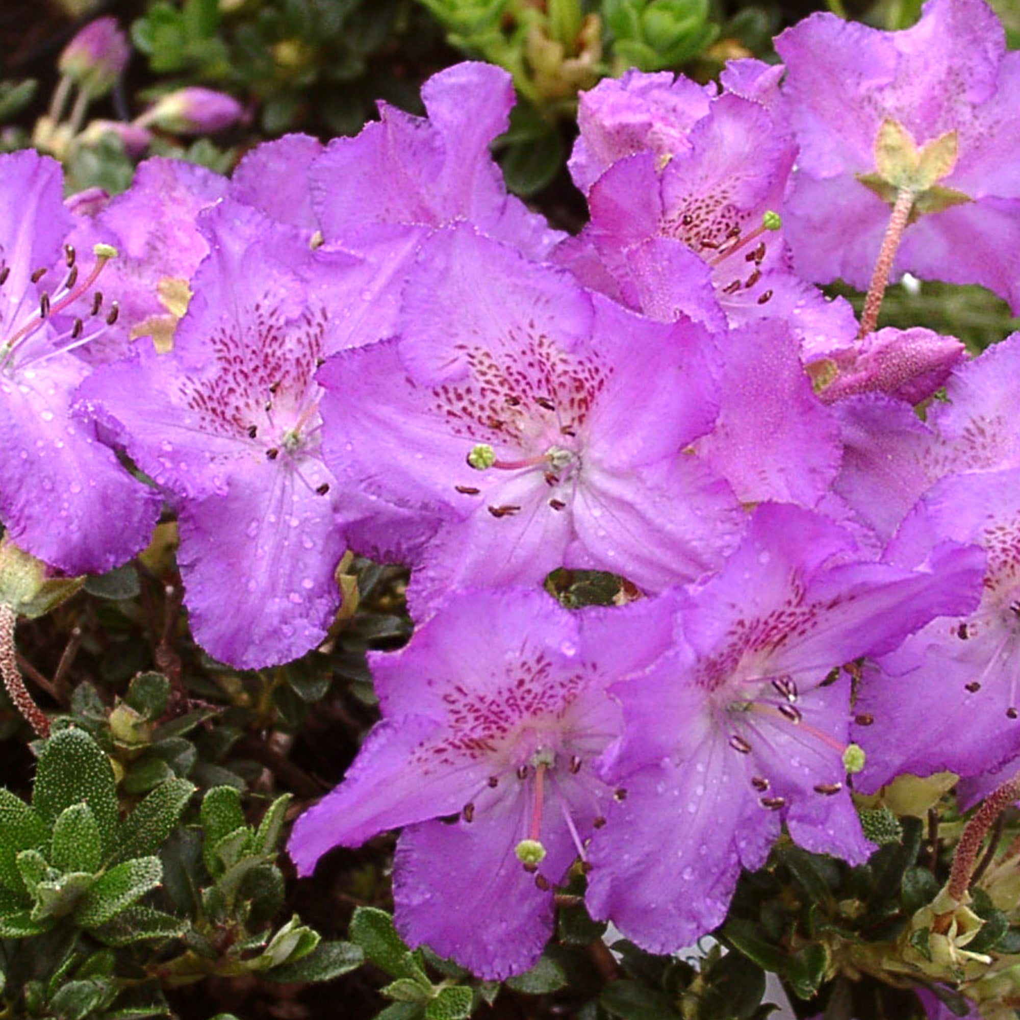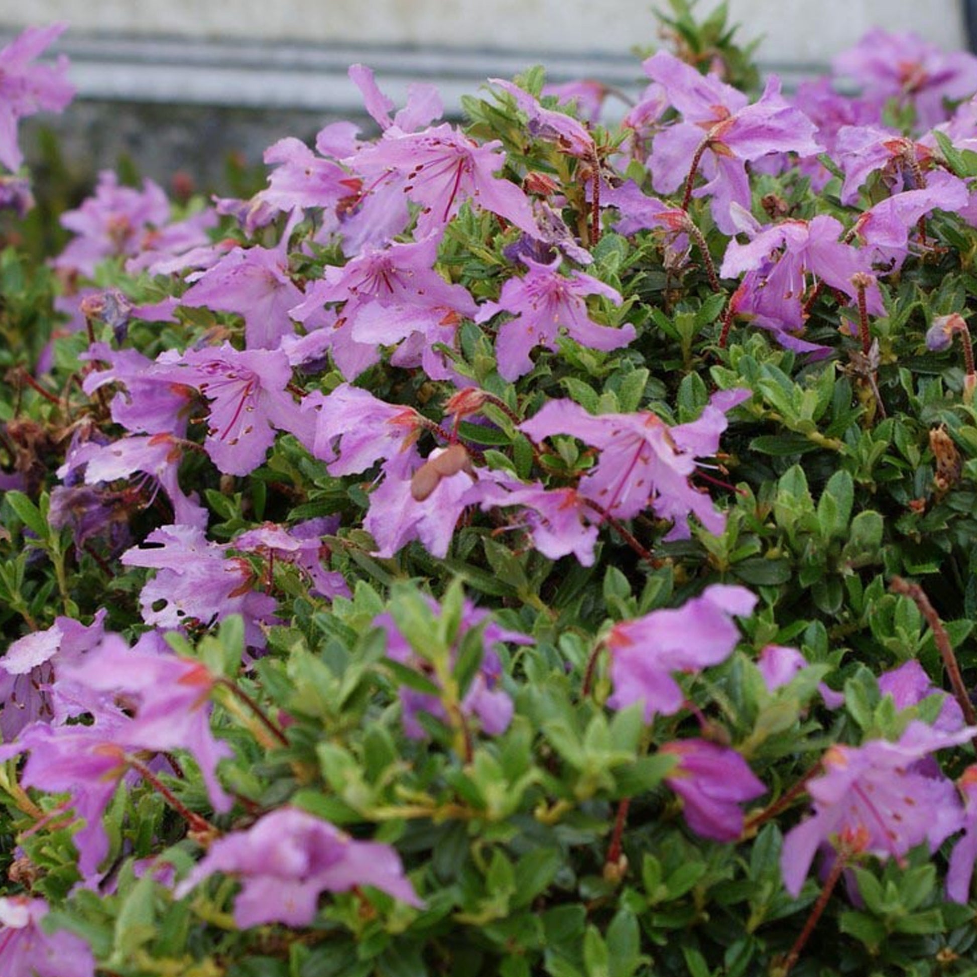 Rhododendron Keleticum is a garden shrub that produces dense mounds of dark green foliage. Alongside this, small clusters of funnel-shaped, purple flowers bloom in Spring. Small red markings appear from the centre of each flowerhead to add an extra burst of colour. Its habit is known for being almost prostrate. The evergreen foliage ensures the plant gives off year-round interest, meaning its flowering is always joined by the perfect contrast.